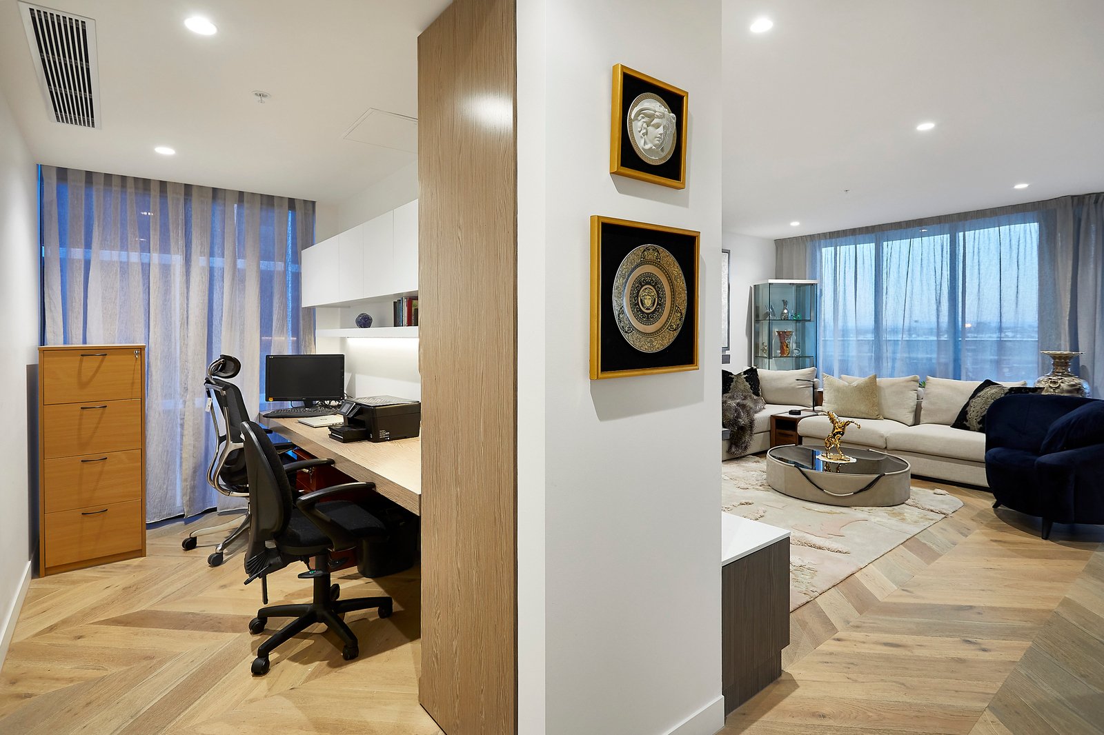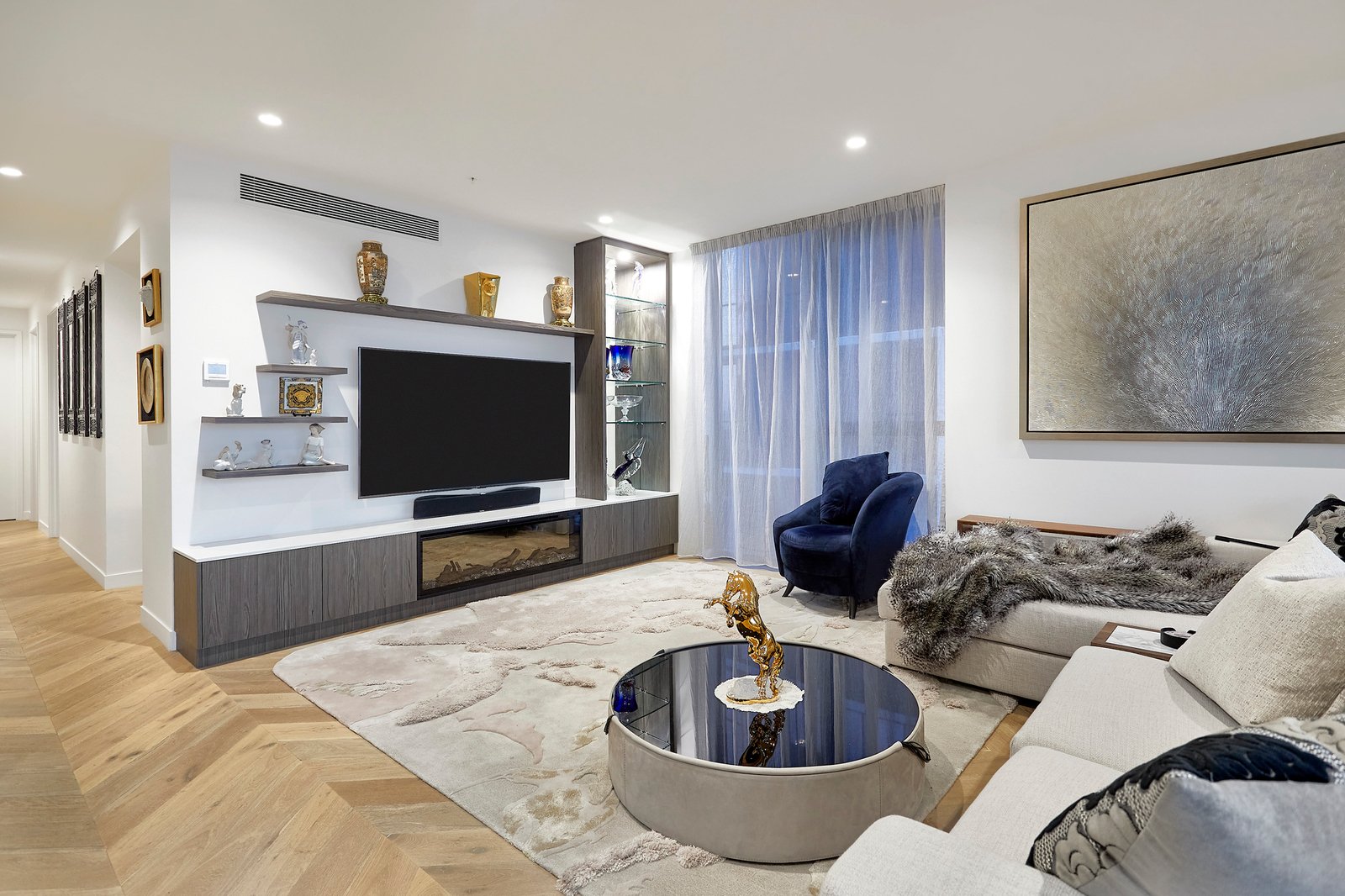 A dedicated study with built-in desk, separate laundry, ducted heating and cooling, secure intercom entry, storage cage and three secure undercover car spaces complete the offering. Throughout the residence, refined finishes including oak parquetry flooring, rose gold tapware, marble surfaces and premium wool carpets highlight the exceptional quality that defines this remarkable penthouse.