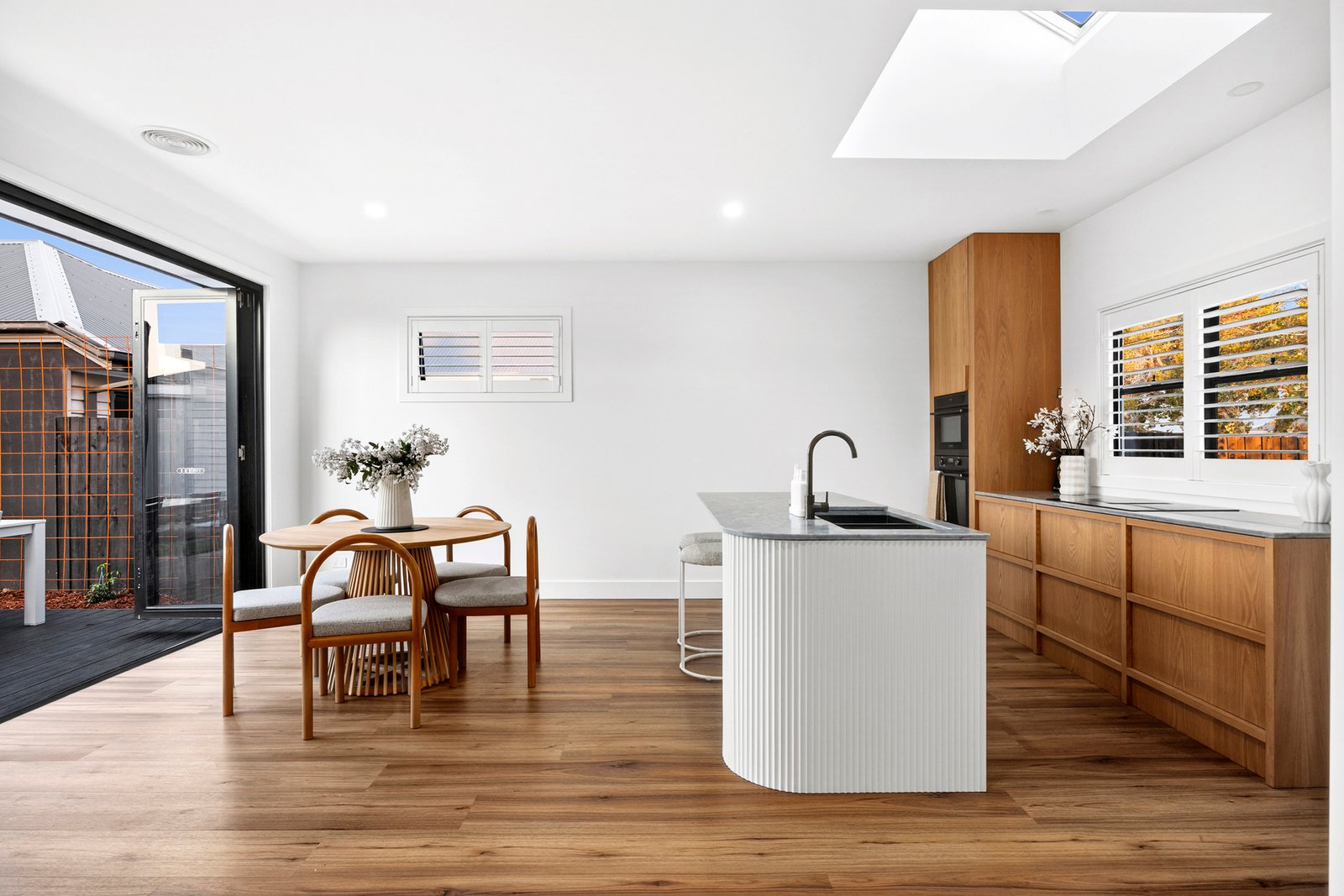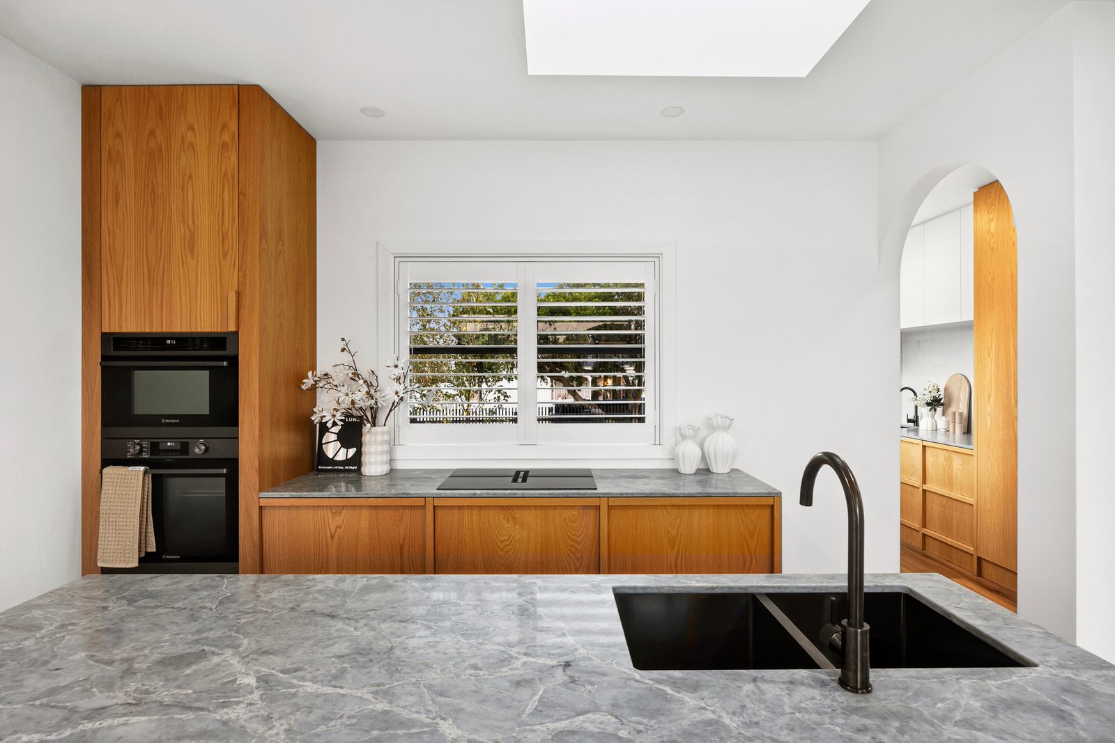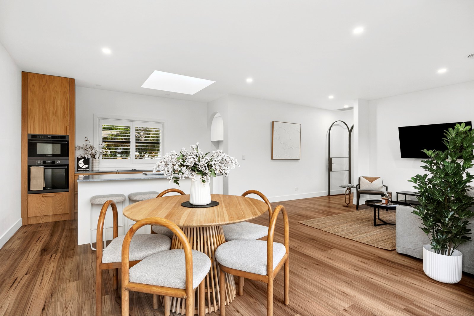A magnificent arched glass door leads into the open-plan living area, which enjoys a north-facing aspect and an impressive skylight, bathing the space in warm natural light. The elegant kitchen features a fluted island bench, stone benchtops, dual Westinghouse multi-function ovens, a Bosch induction cooktop with integrated ventilation, an integrated dishwasher, and extensive storage including a butler’s pantry with second sink. Glass bifolds open to extend the dining space to the rear deck, allowing for seamless indoor–outdoor living and entertaining.