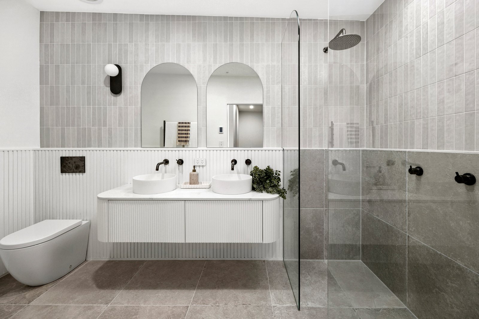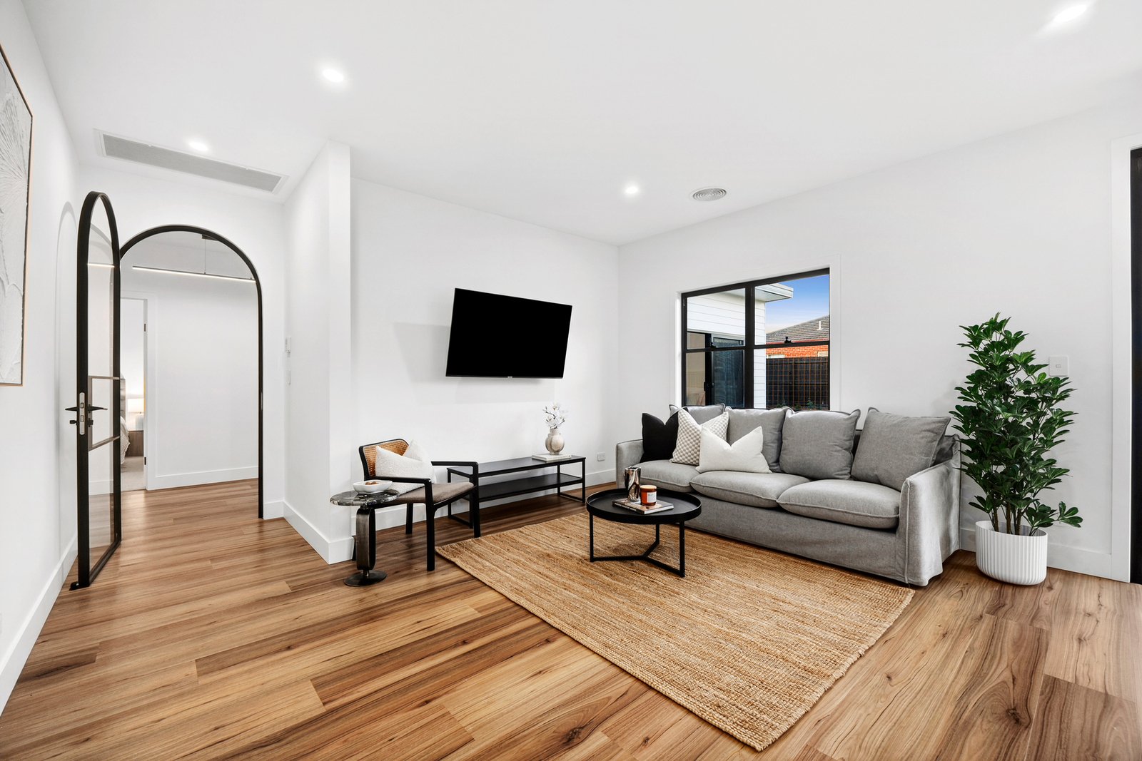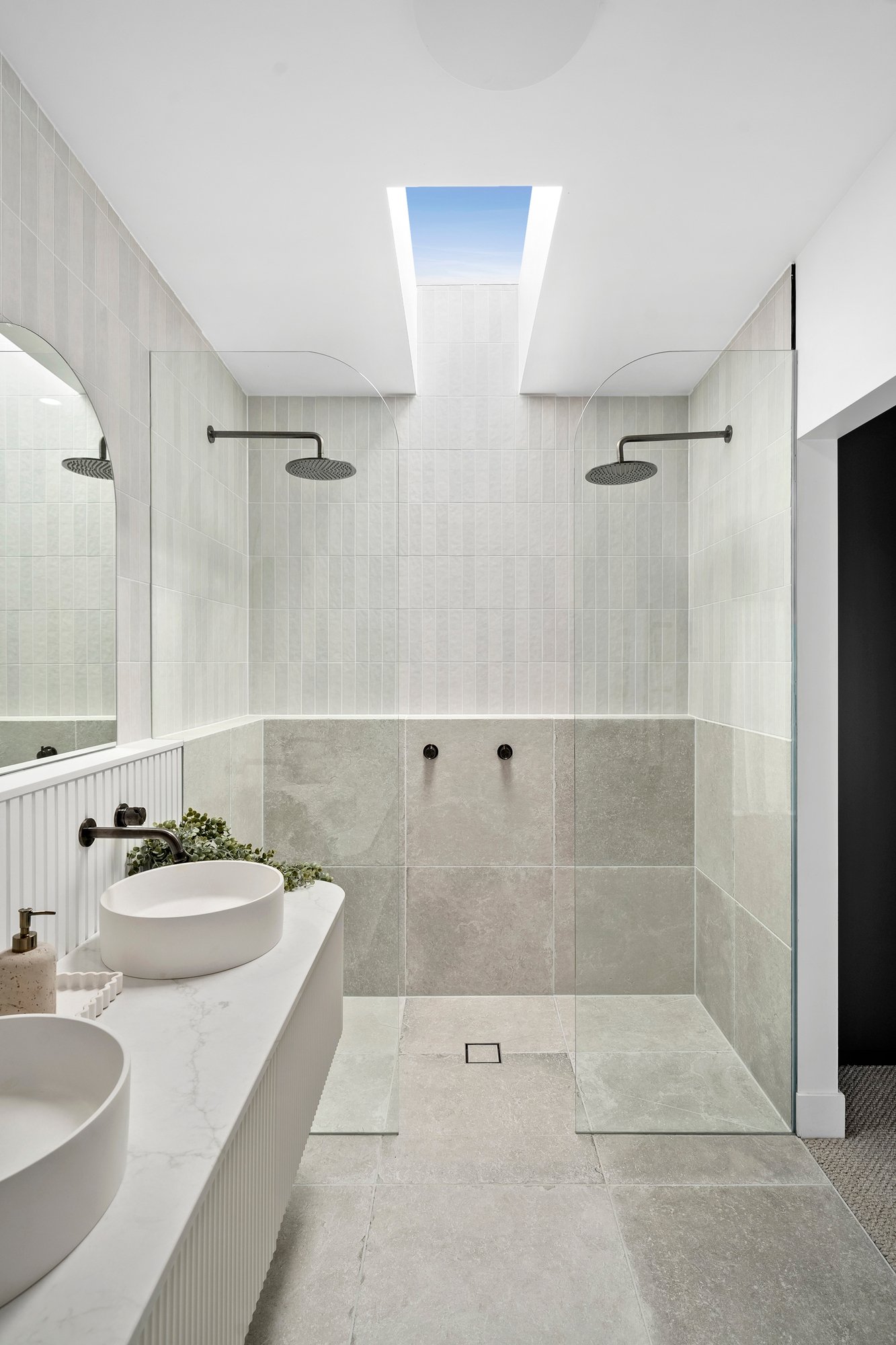 A magnificent arched glass door leads into the open-plan living area, which enjoys a north-facing aspect and an impressive skylight, bathing the space in warm natural light. The elegant kitchen features a fluted island bench, stone benchtops, dual Westinghouse multi-function ovens, a Bosch induction cooktop with integrated ventilation, an integrated dishwasher, and extensive storage including a butler’s pantry with second sink. Glass bifolds open to extend the dining space to the rear deck, allowing for seamless indoor–outdoor living and entertaining.