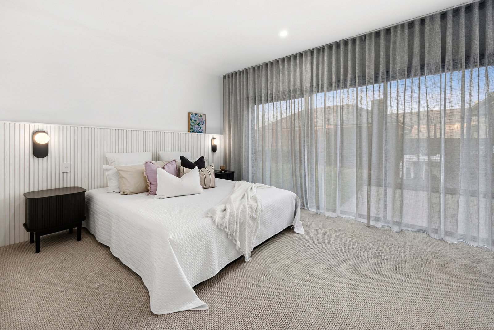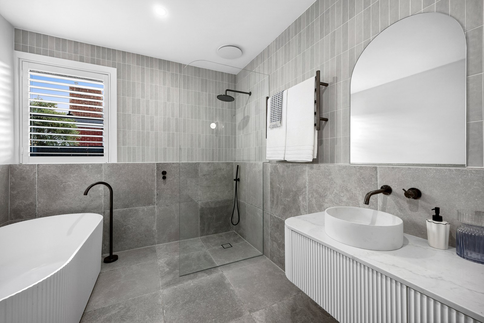 Set behind a picket fence and landscaped gardens, the updated façade retains its original charm. Inside, a central hallway showcases modern flooring, square-set ceilings and sleek pendant lighting, introducing the refined theme of the interiors. Two bedrooms off the entry feature plantation shutters, built-in robes and desks, serviced by a stunning main bathroom finished in floor-to-ceiling tiles, with underfloor heating, a walk-in frameless glass shower, freestanding bath, stone-topped vanity and chic tapware. The main bedroom is a private retreat at the rear, with beautiful floor-to-ceiling sheers, ambient bedside wall sconces, direct access to the rear patio, walk-in robes and a luxurious ensuite, also including underfloor heating, with a walk-in double shower, skylight and dual vanity.