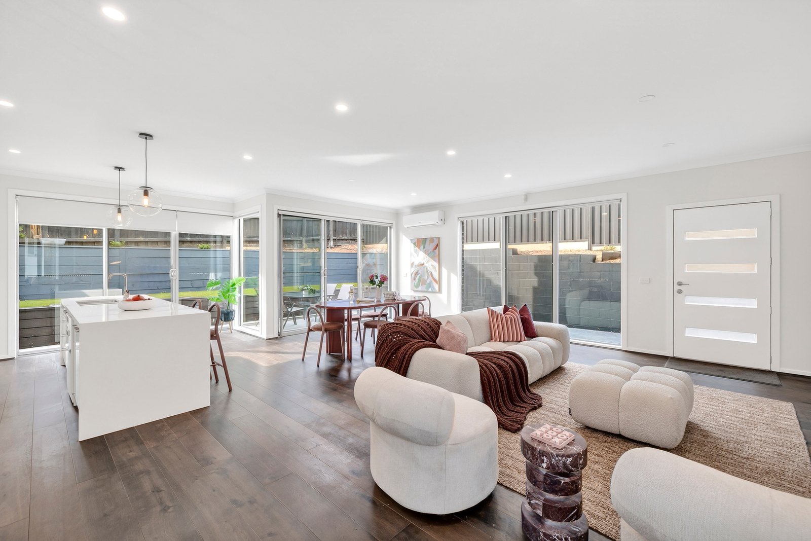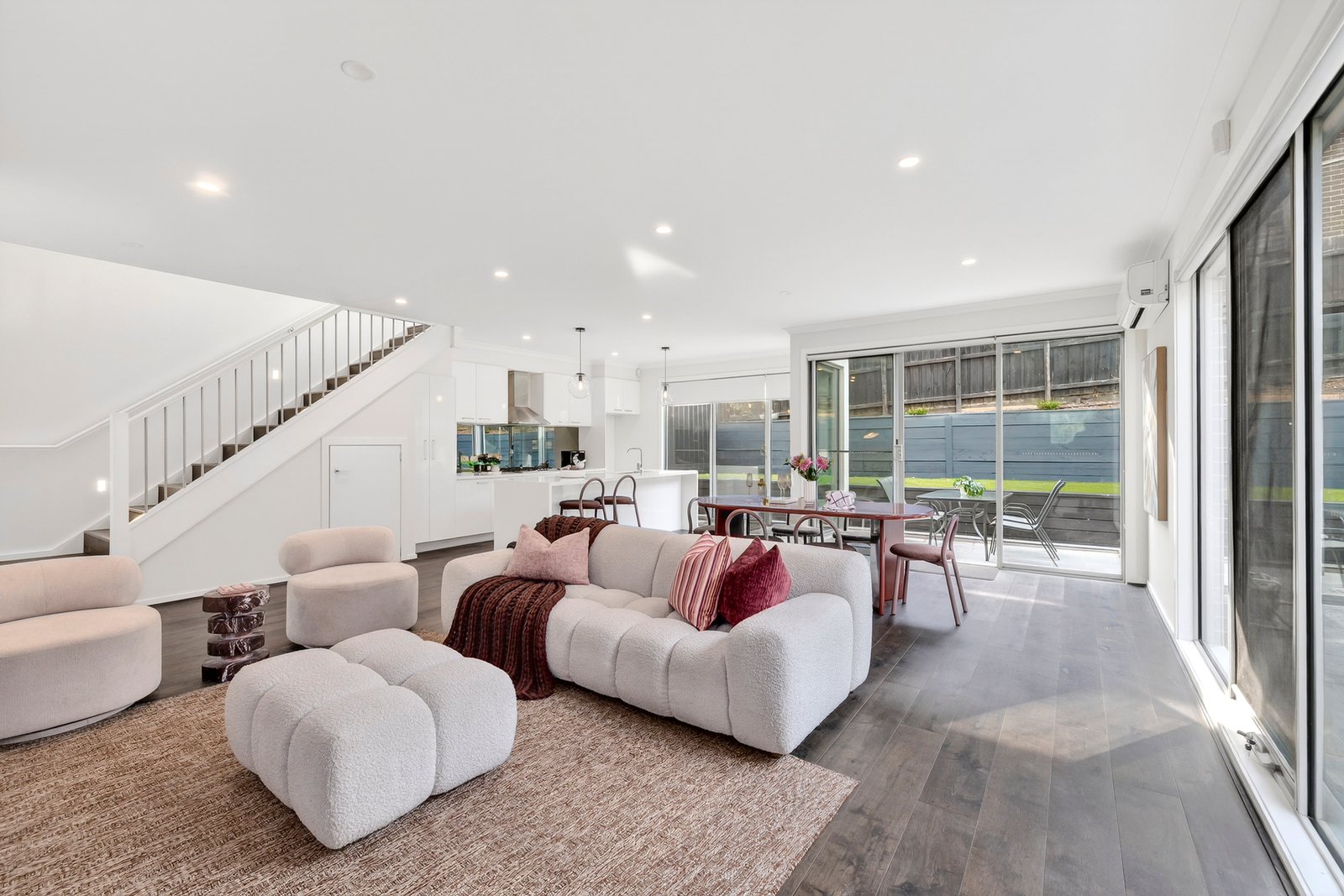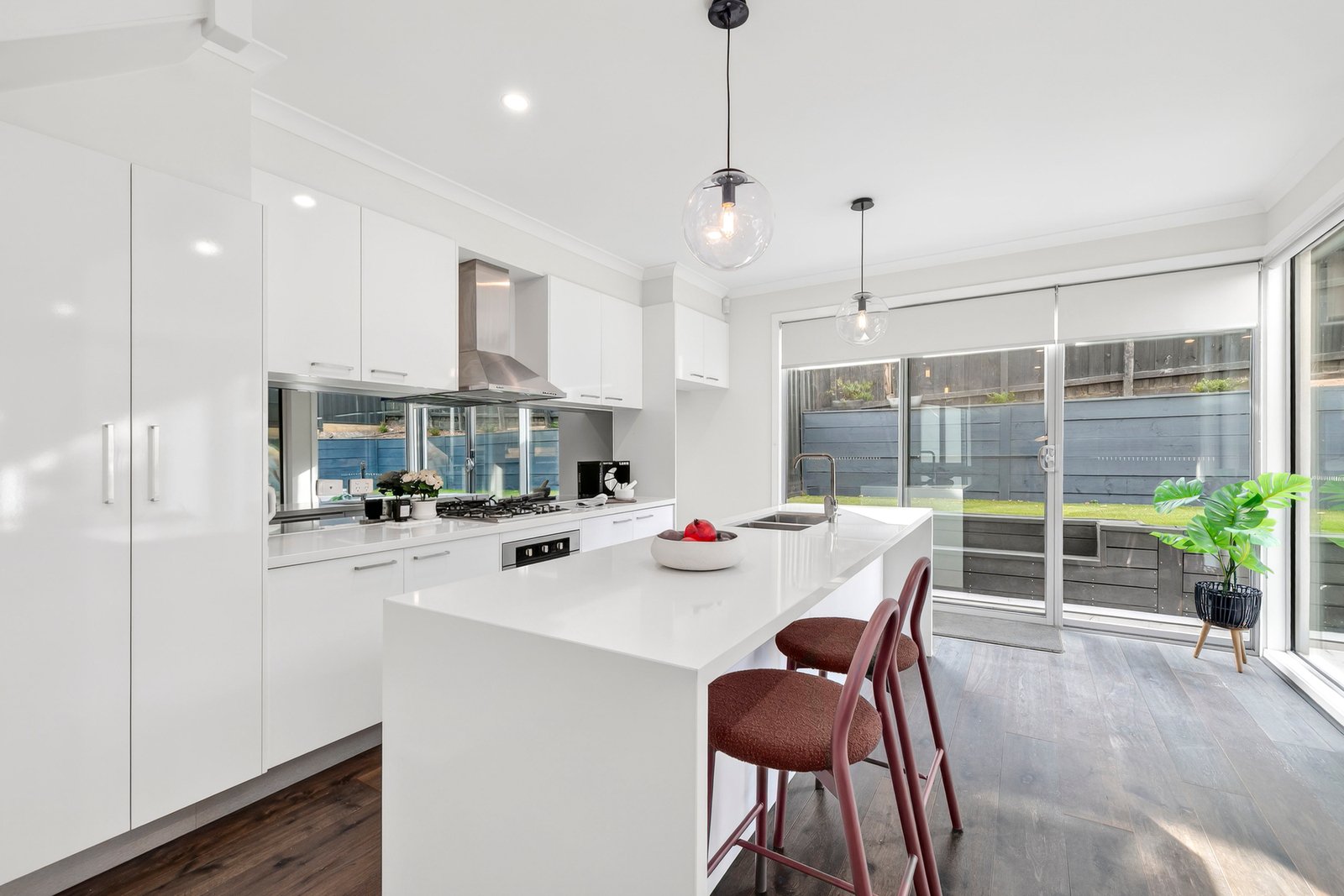 Welcomed on the main floor by a lavishly large living zone that’s framed with extensive glazing overlooking the gardens that envelope it, this home instantly delivers an inviting sense of ease and relaxation. Complimented by a joyfully bright kitchen with gas cooking, dishwasher, terrific storage and a waterfall stone island bench to spread out across.