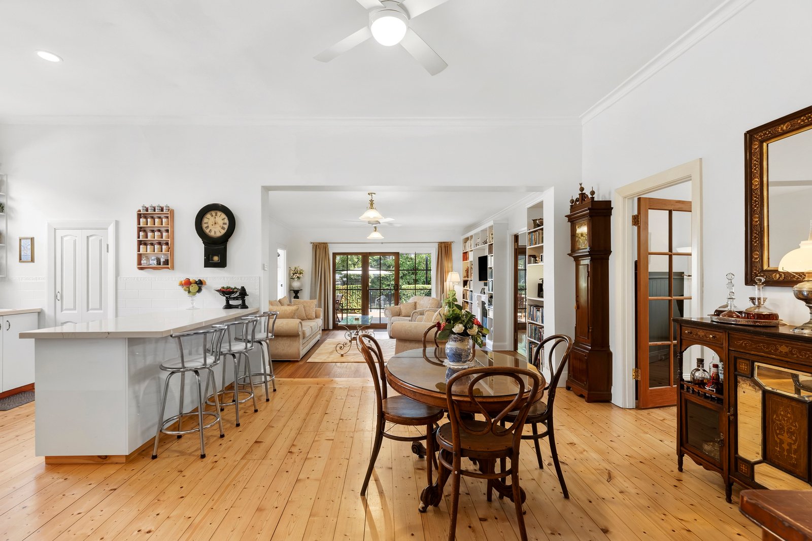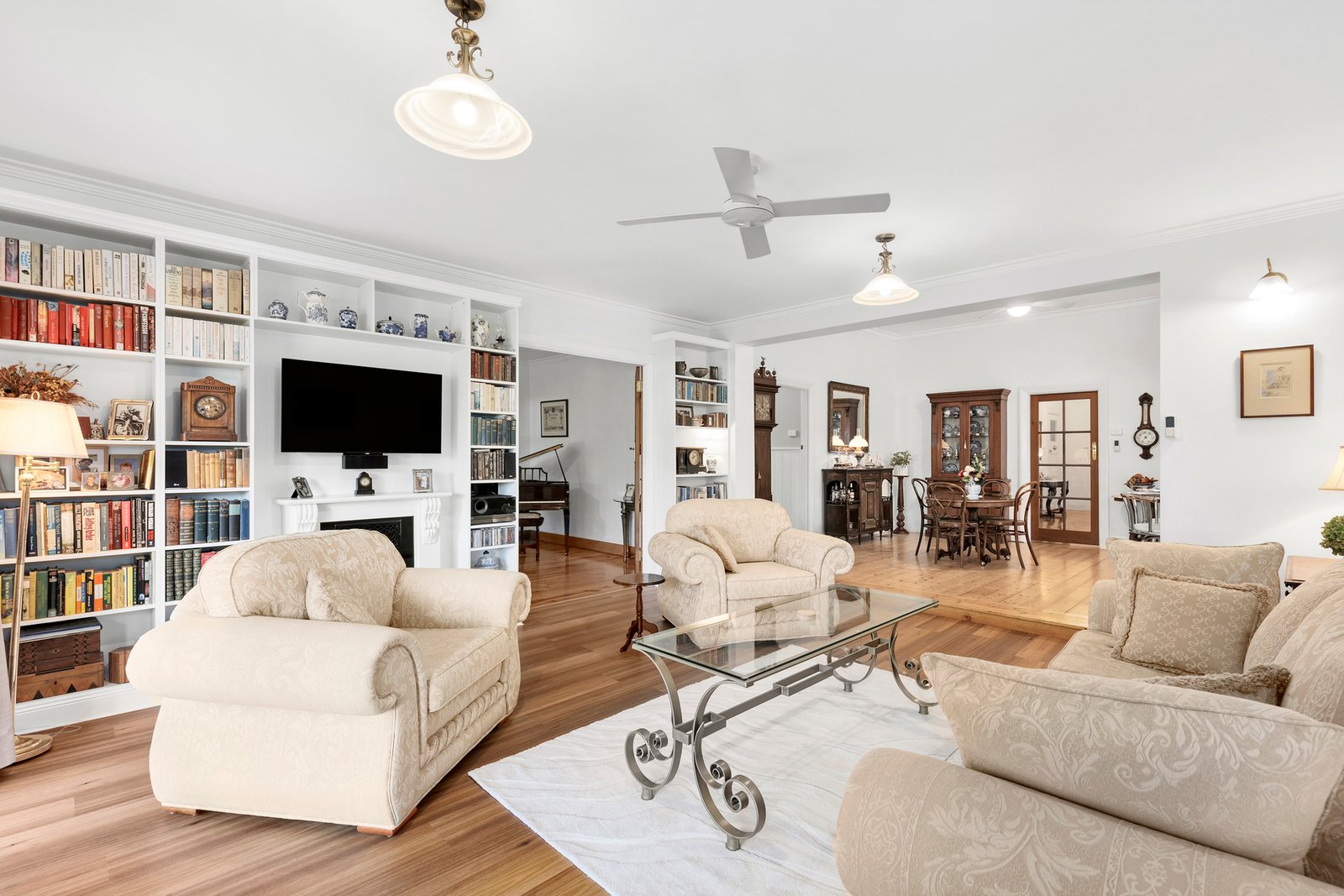 The heart of the home is an open plan kitchen, meals and living area connecting with the rear deck for seamless indoor-outdoor living and entertaining. Built-in bookshelves add both style and functionality, and an electric fireplace creates a cosy ambience. The elegantly updated kitchen features stone benchtops, quality appliances including a dual multi-function wall oven, Bosch electric cooktop and Miele dishwasher, with ample bench space and generous storage including a walk-in pantry. French doors connect the main living area with a grand dining room, also suitable as additional living space, with direct access to the entertaining deck. Equipped for modern comfort and functionality, additional features include ducted heating throughout, ceiling fans, and a rear laundry and bathroom positioned for easy access from the poolside entertaining area.