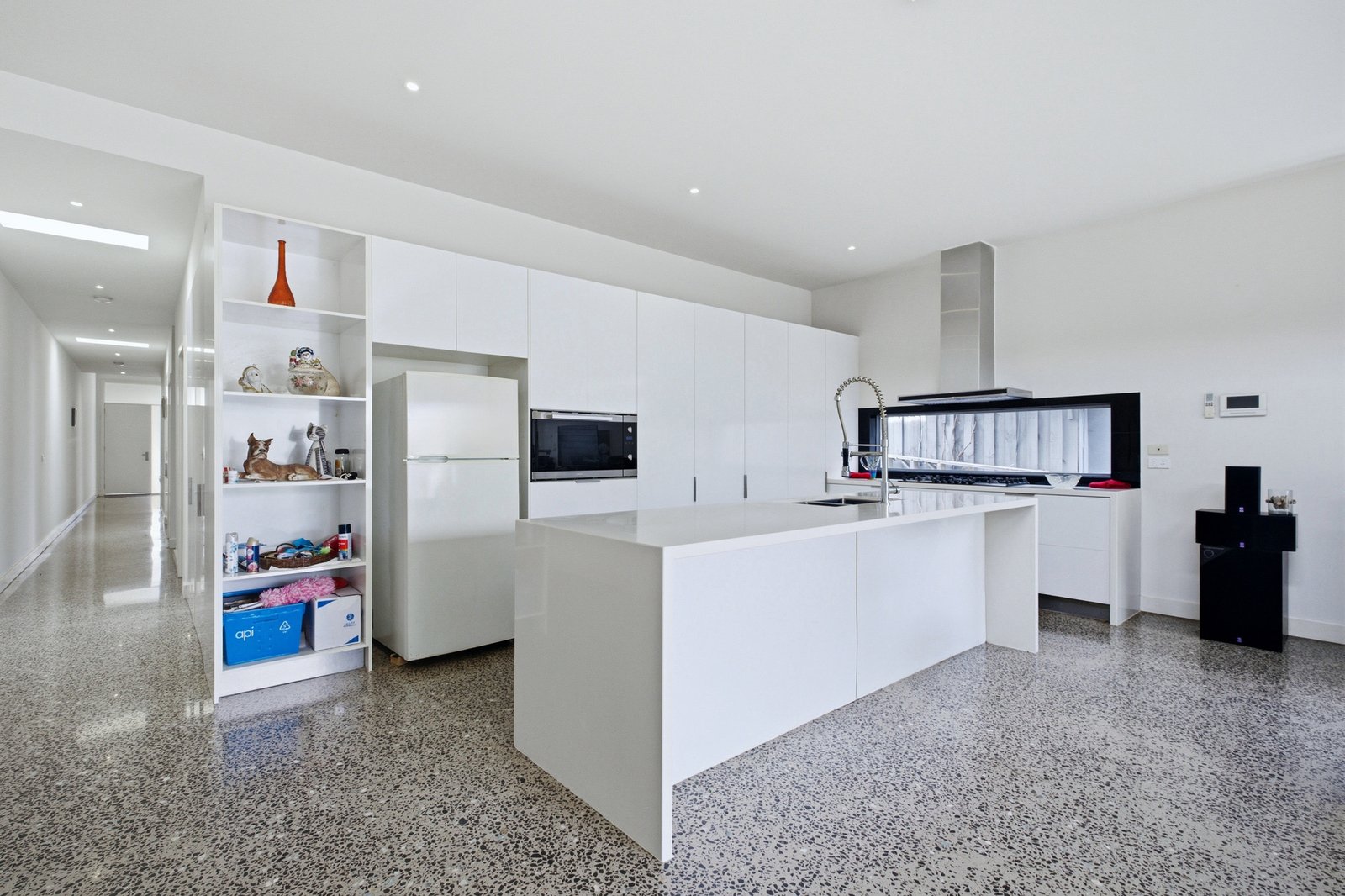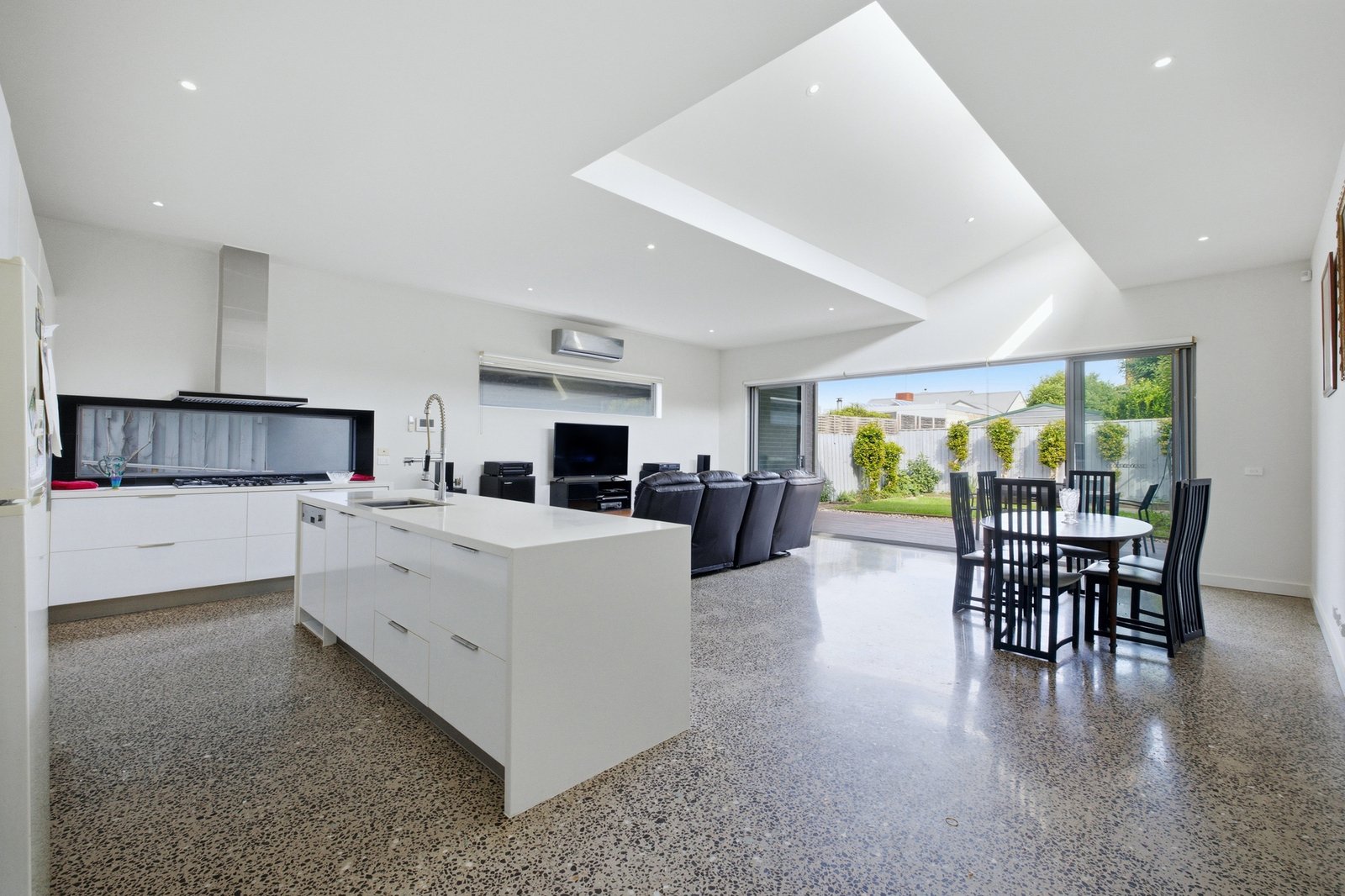 Appealing from the street with its sleek contemporary façade, the home then impresses with smartly finished interiors highlighted by lofty 3-metre ceilings and stunning polished concrete floors, which flow seamlessly throughout.