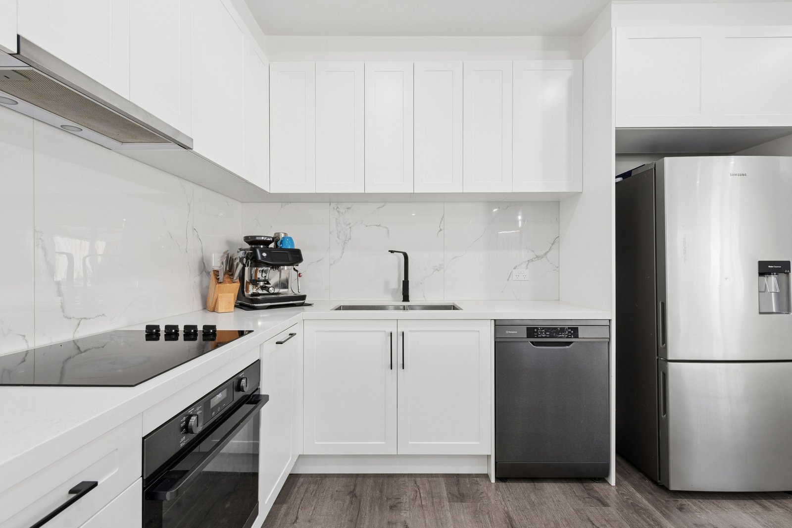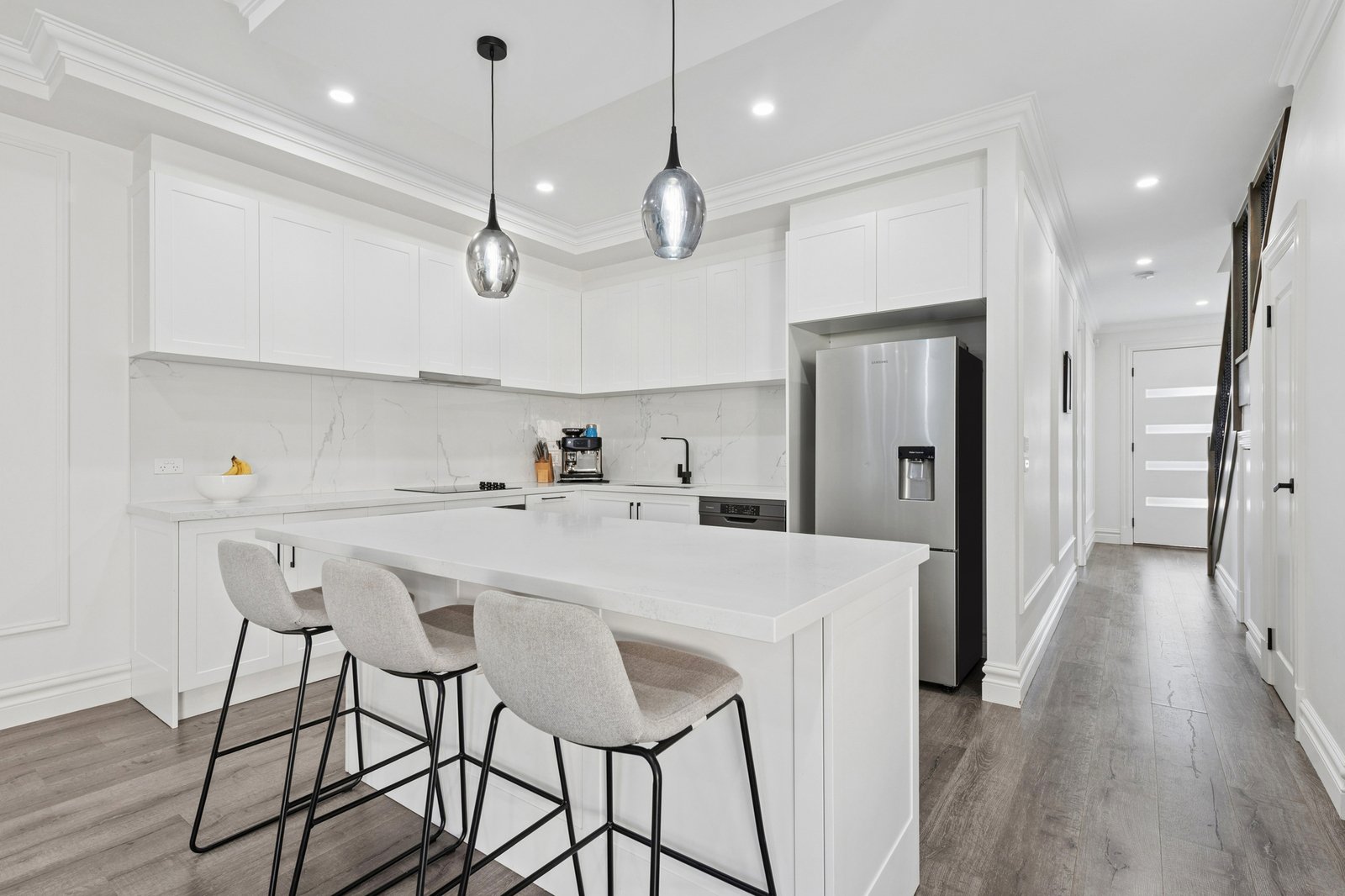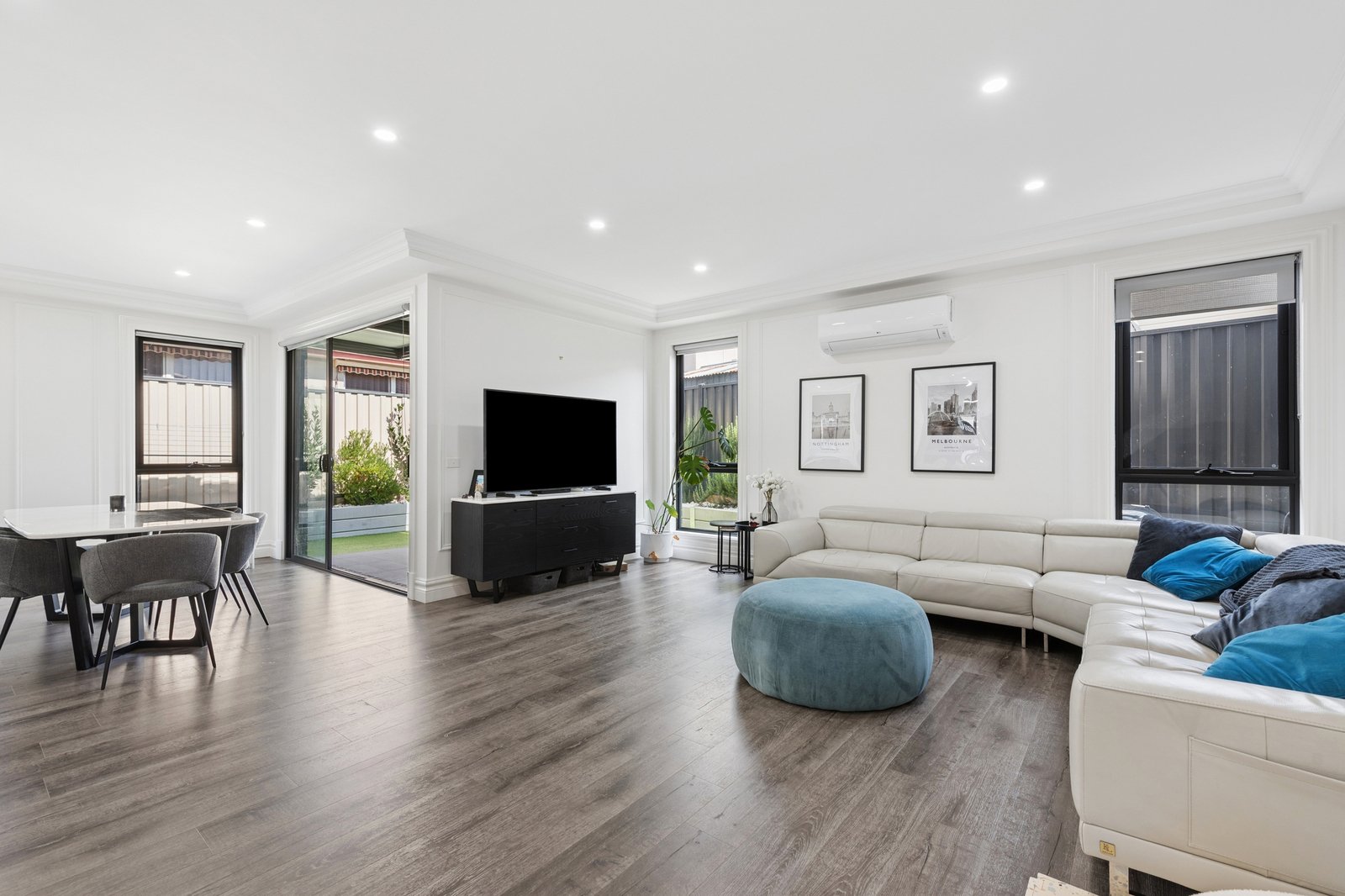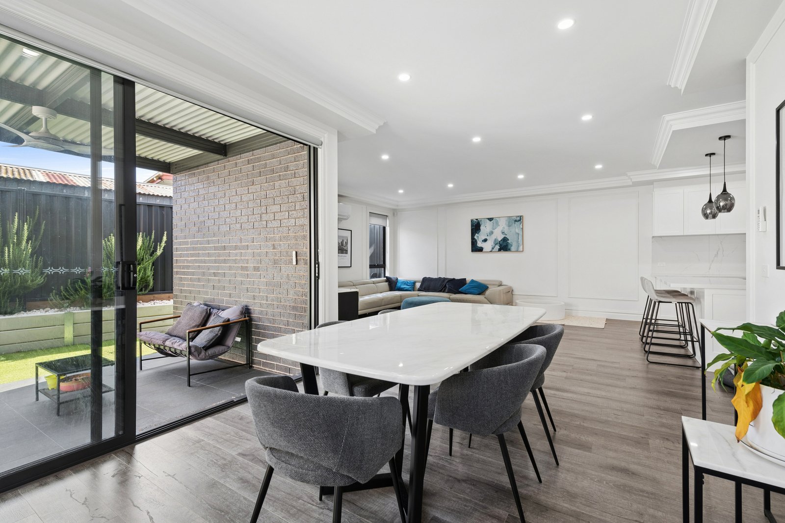 Wide-plank timber floors carry from the entry past panelled walls and feature cornices into a living and dining room that has been finished with an eye for detail. Sliding doors extend the space to a pergola-covered patio with paved entertaining underfoot and artificial turf beyond. The Hamptons-inspired kitchen sits at the centre of daily life, its island bench drawing people in for casual meals or shared conversation. Shaker-style cabinetry in white, stone benchtops and Westinghouse appliances, including an induction cooktop, are paired with a feature bulkhead and pendant lighting that adds a distinct sense of style.