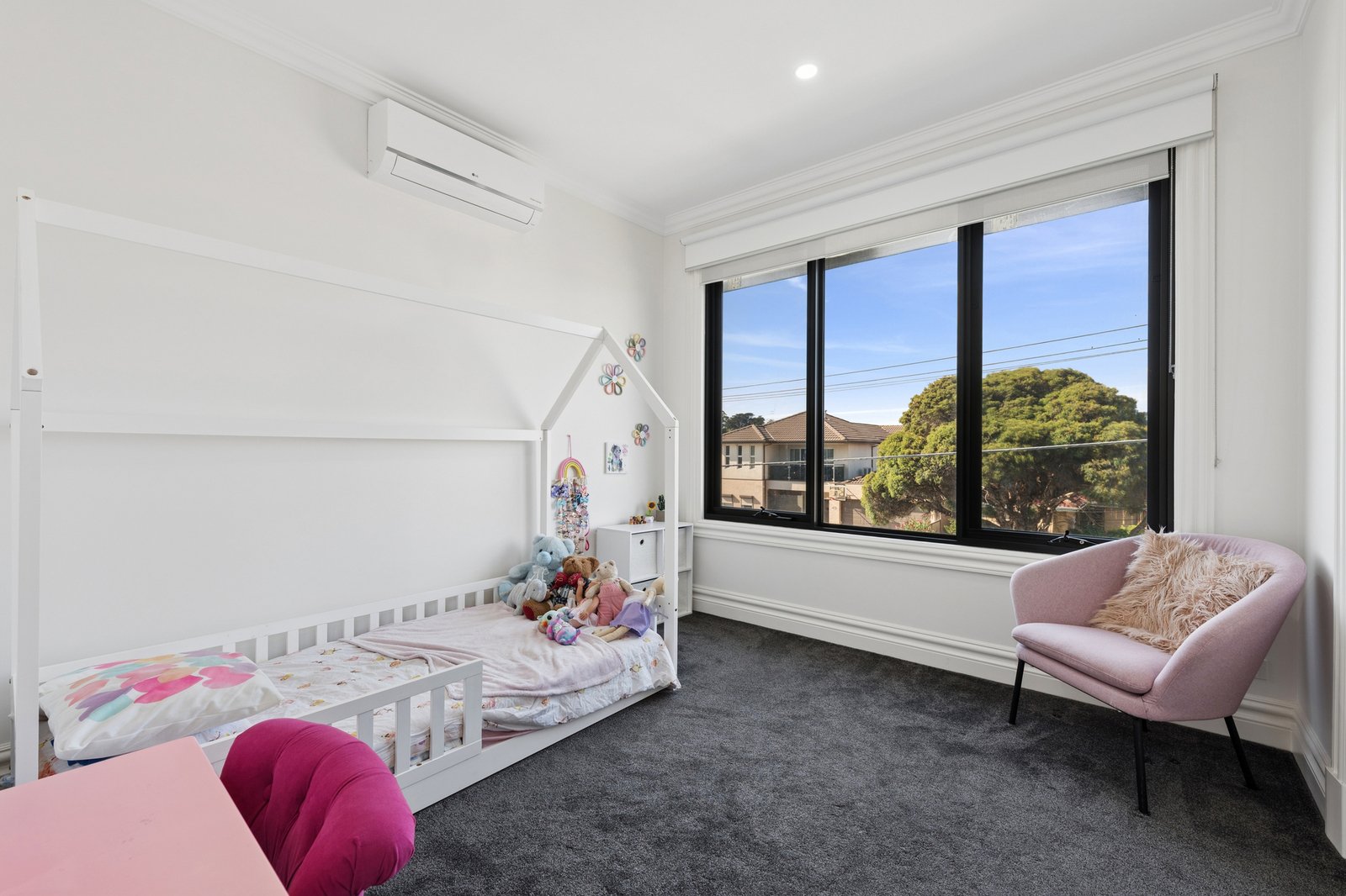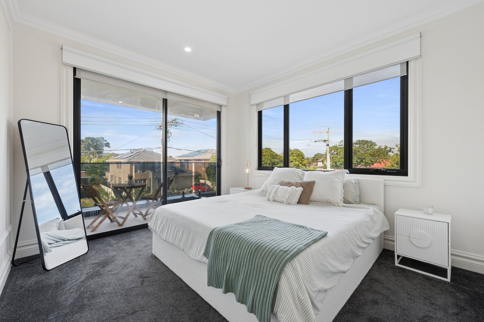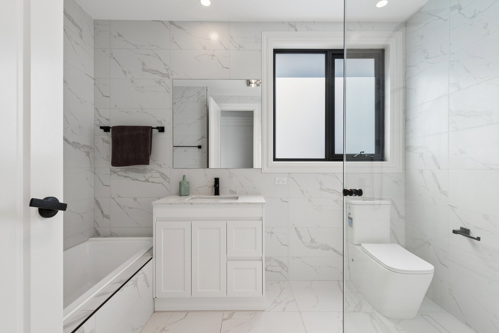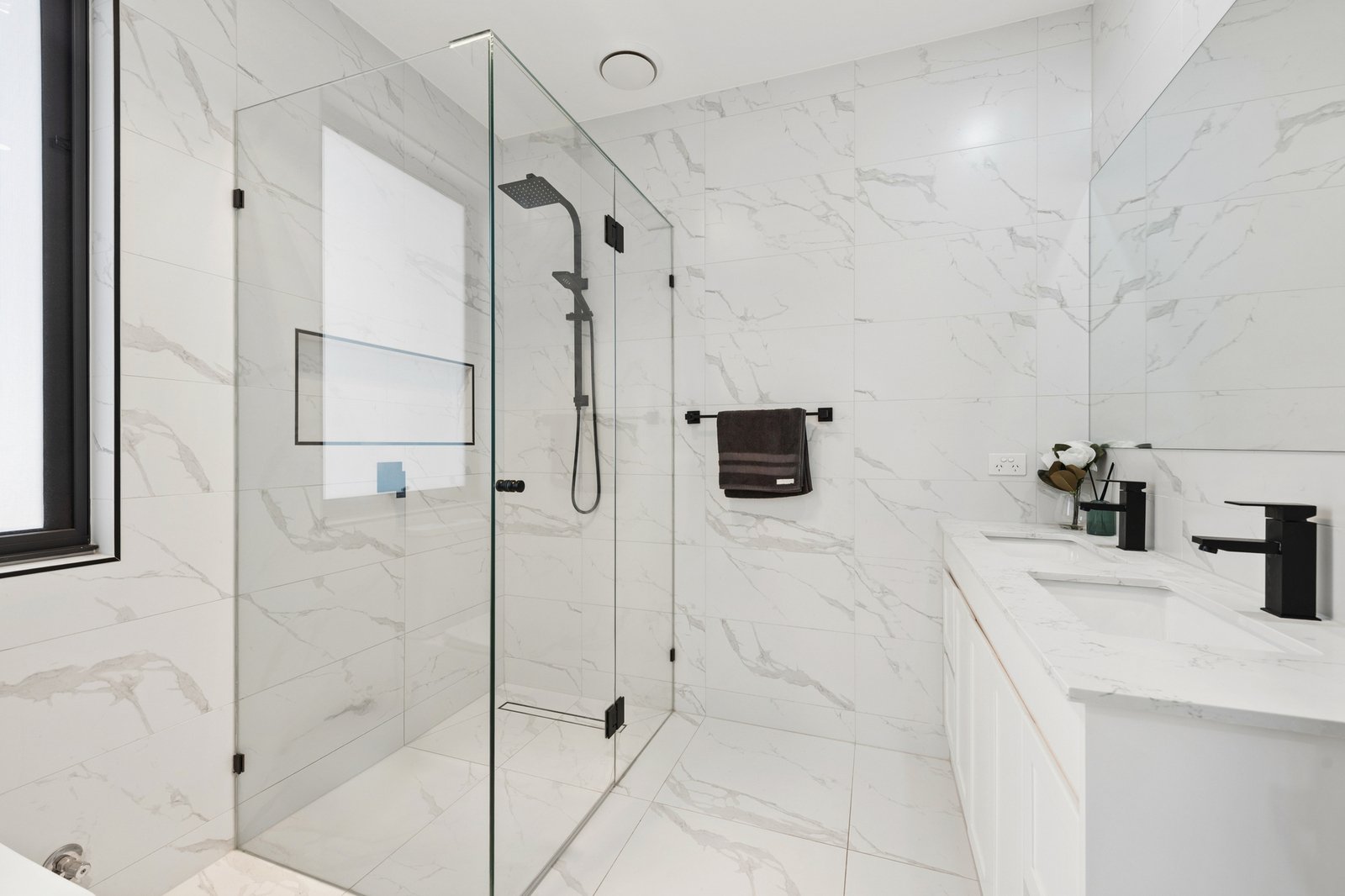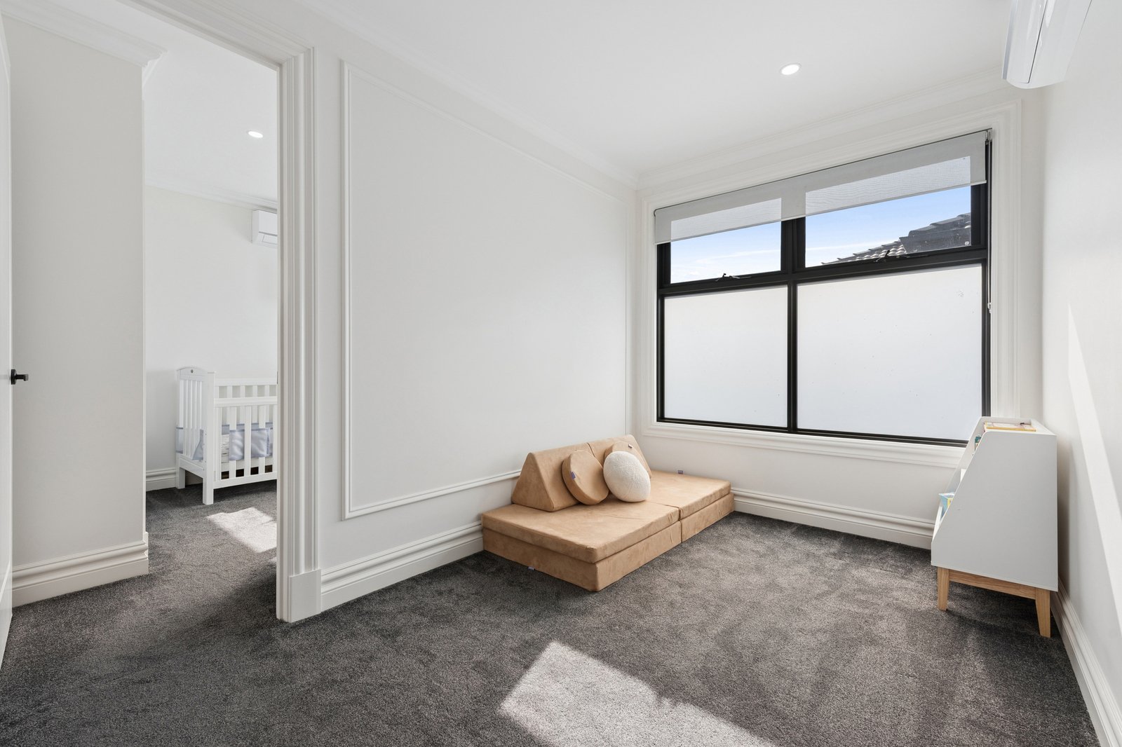 Upstairs, the main bedroom occupies the front corner, stepping out to a balcony with a far-reaching outlook across rooftops, treetops and open sky. A walk-in robe and an ensuite with double vanity and frameless glass shower complete the space. Between the remaining bedrooms are a stylish bathroom and a gallery-style retreat introducing a second living zone, giving the upper level its own flow. One bedroom has a walk-in robe and the other built-in robes.