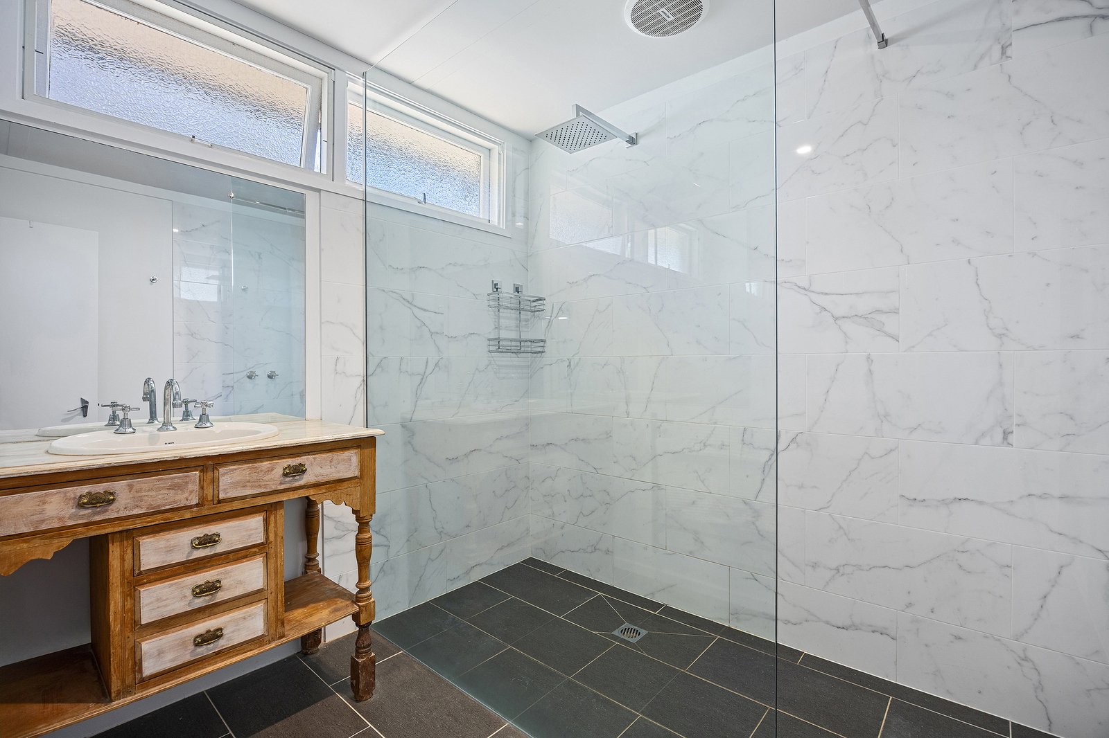 • Stylish updated bathroom featuring quality fixtures and a walk-in shower. Two toilets for further convenience.
