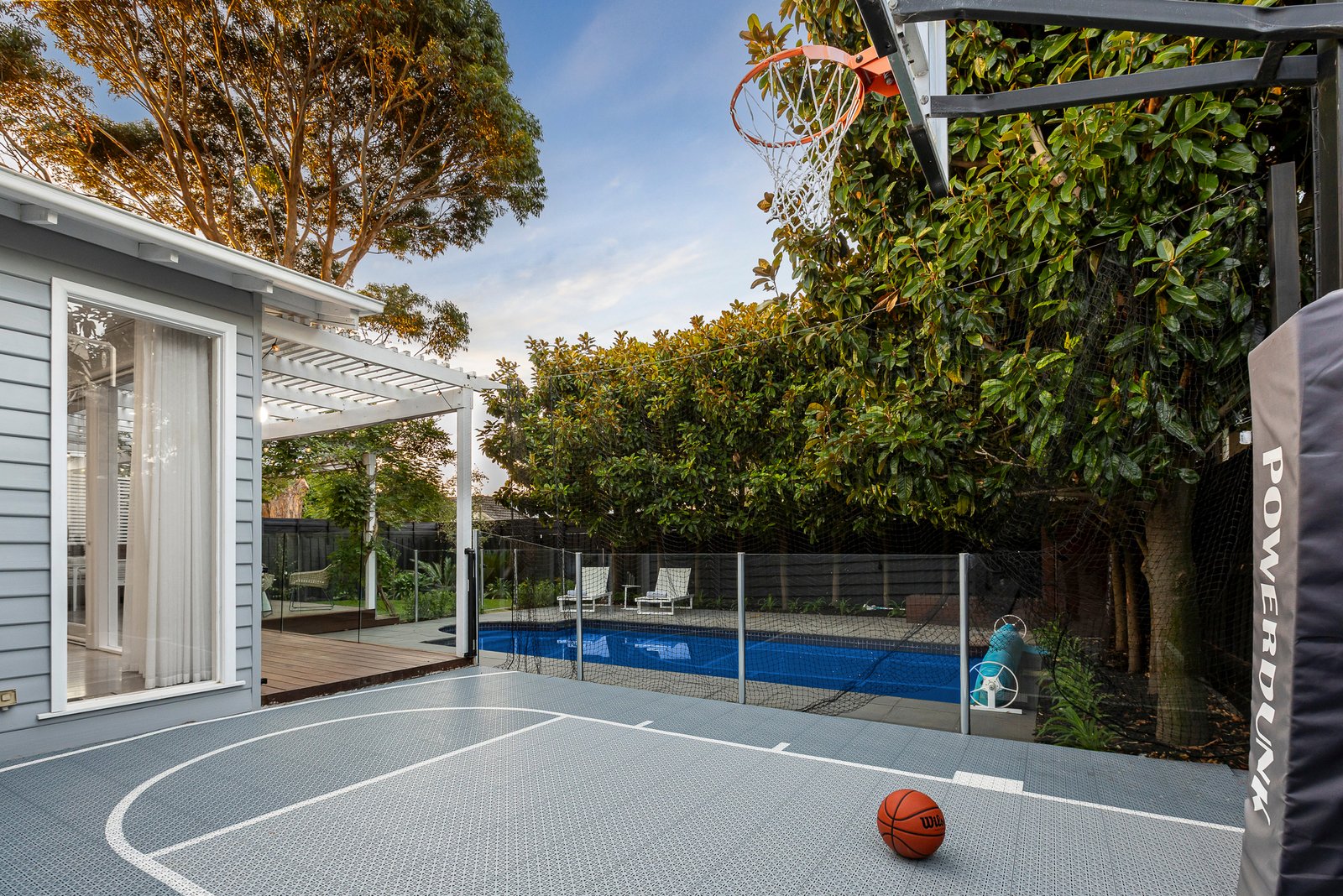 Appointed to a demanding architectural specification with marbleised stone, authentic hardwood, pebbled wool carpets, and airy plantation-shutters plus lofty linen roof-hung sheers, the home shines with designer lighting - and glows with modern marble open-fireplaces and a relaxed gas-logfire. Centrally heated and cooled with an auto-irrigation system, the home is set in perfectly-utilised north-rear grounds with a state-of-the-art glass-fenced, solar-heated pool set alongside a ‘dream’ basketball practice-court in the hedged rear garden.