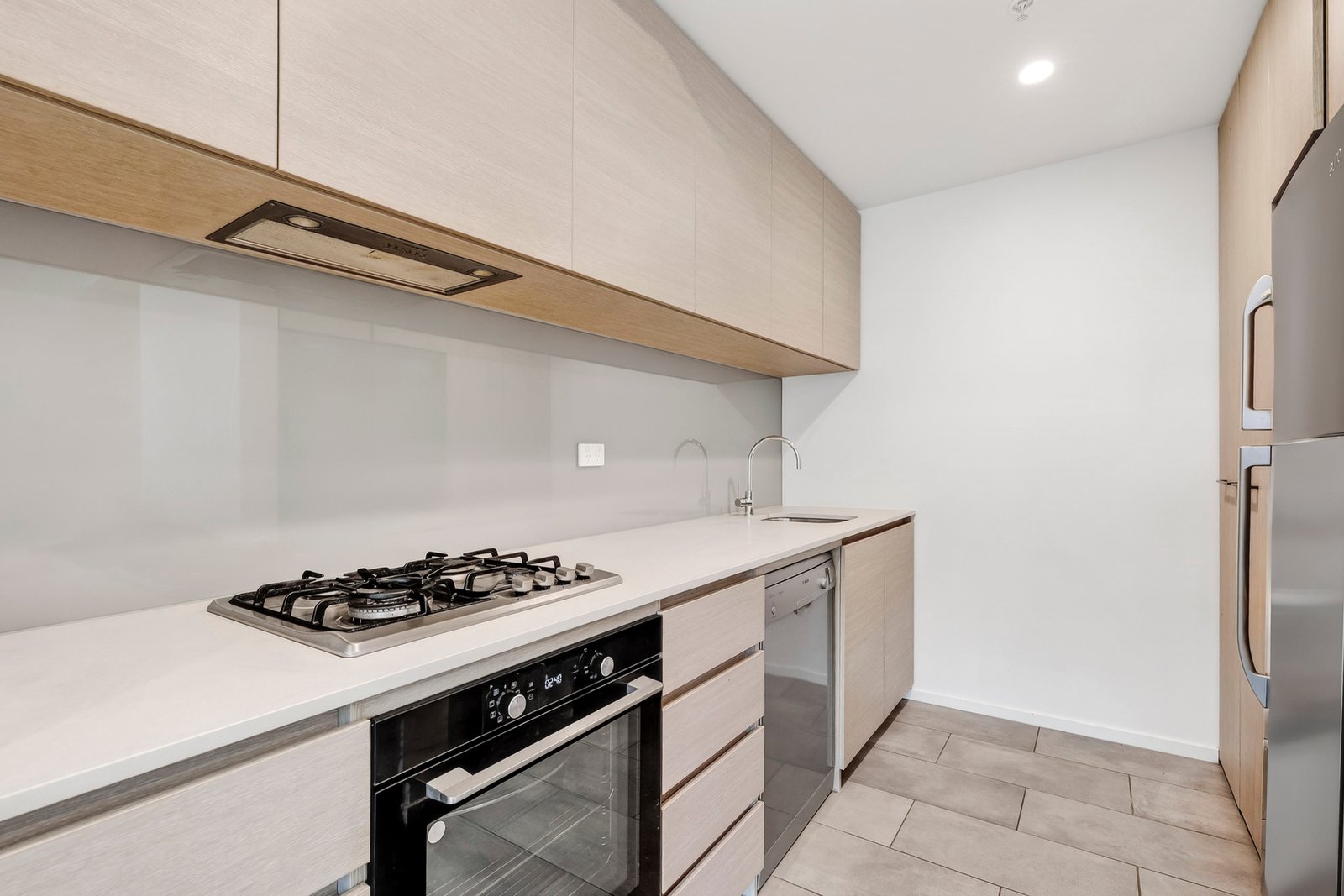Behind its own tall fence and private entry, this home boasts a living room served by a resilient stone and glass kitchen with gas cooking and dishwasher, all illuminated by edge to edge glazing with stacker doors that open wide onto the courtyard.