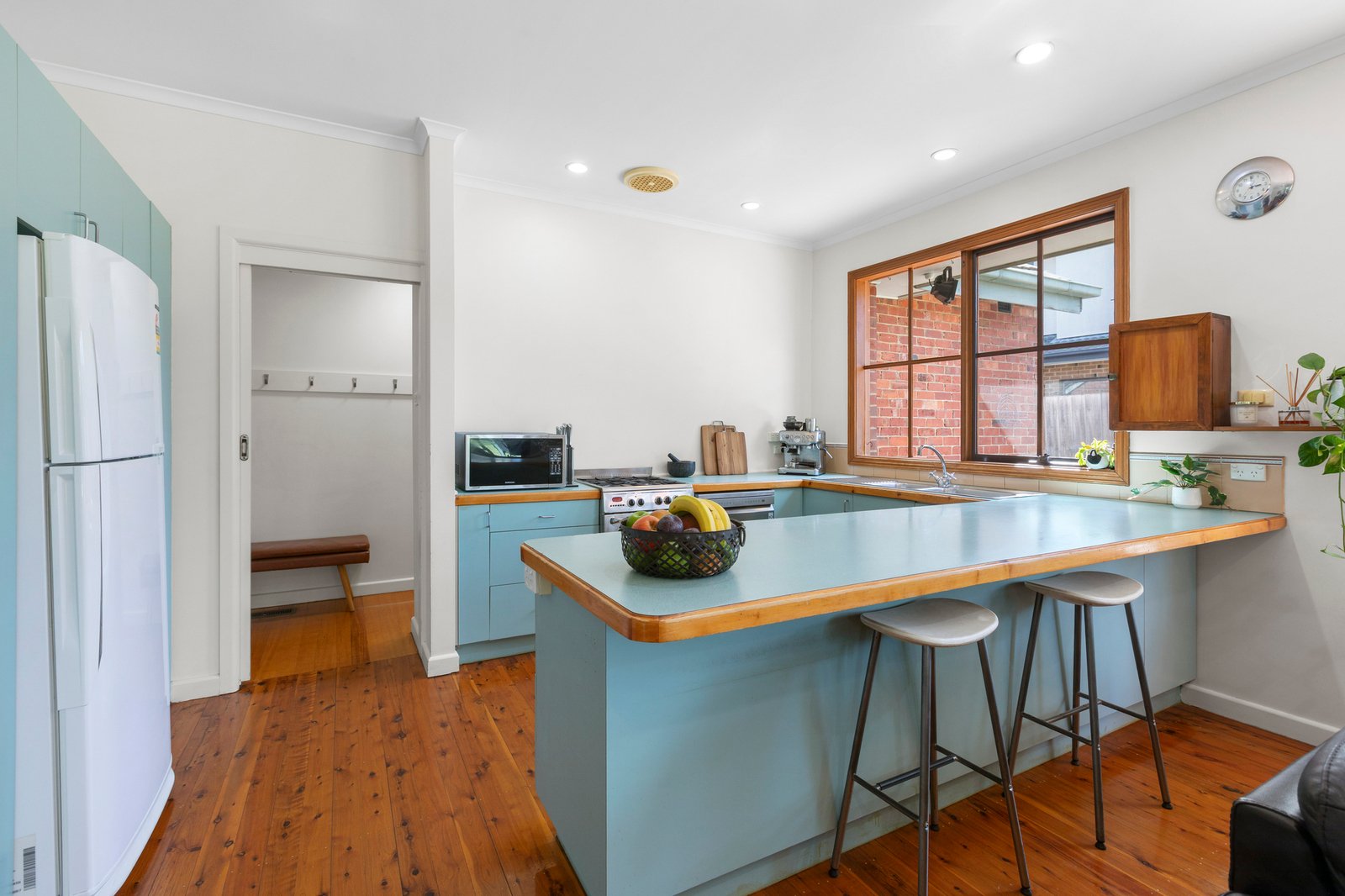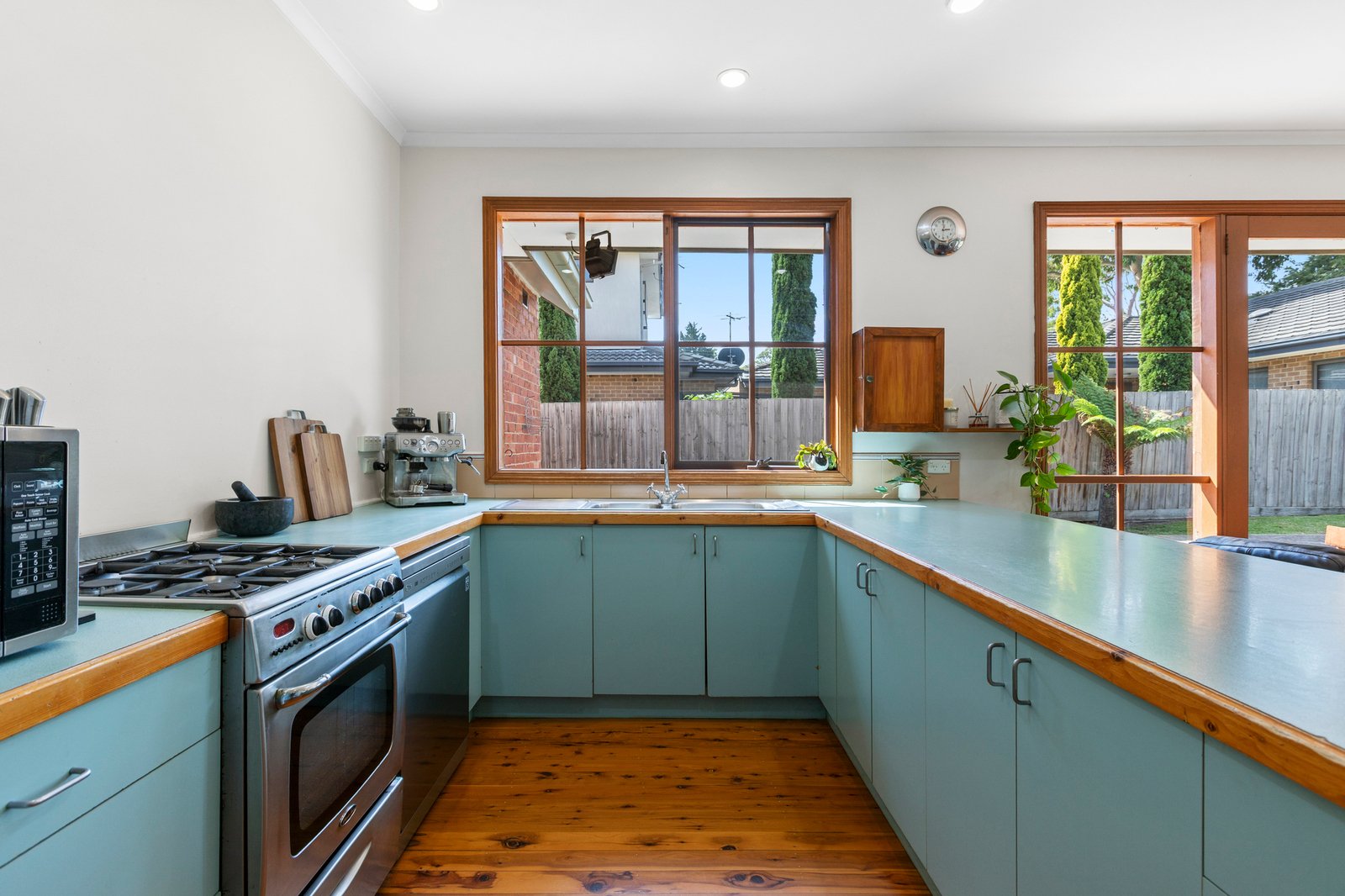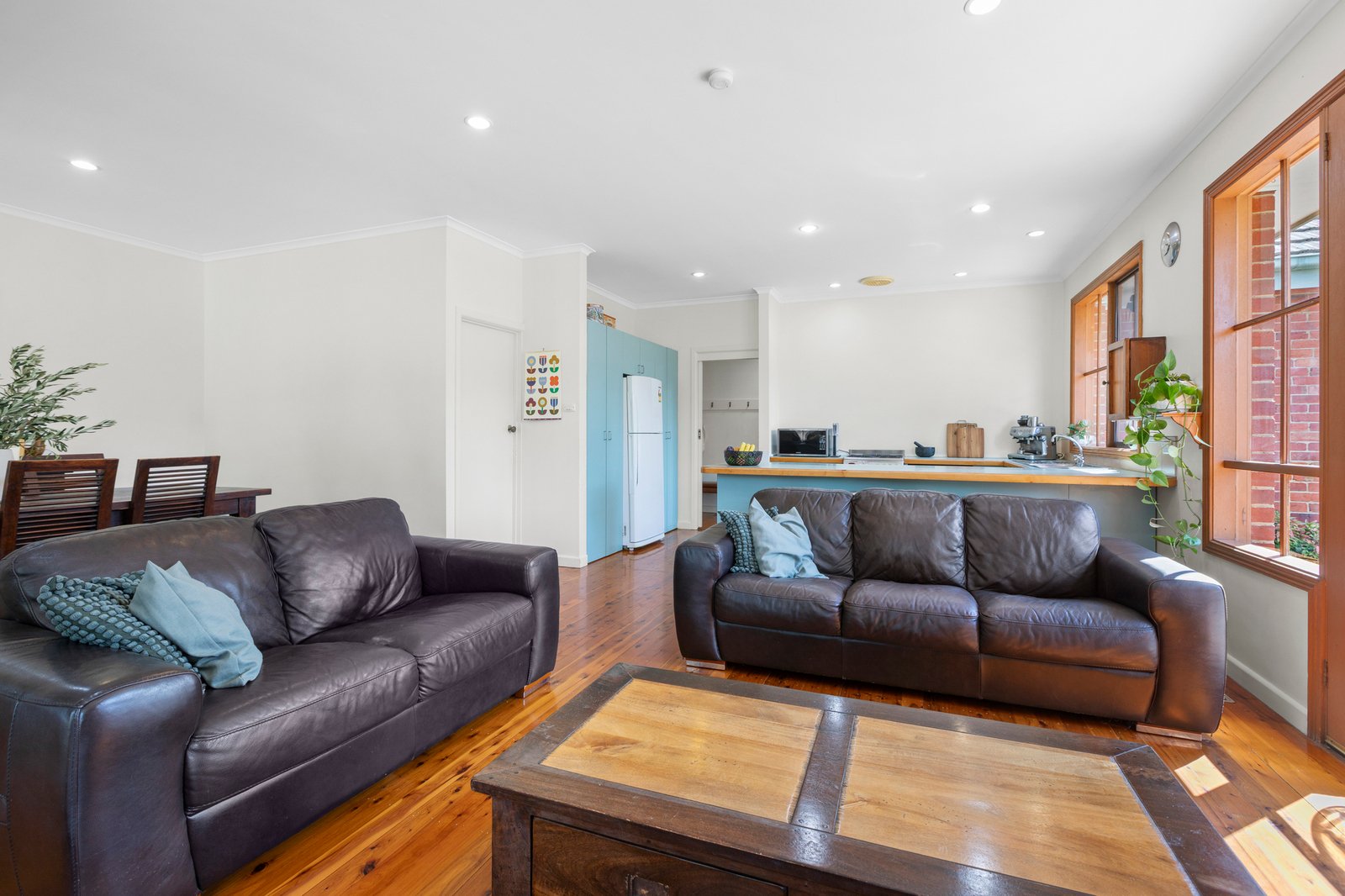 Filled with natural light, the home showcases high ceilings and warm hardwood floors throughout. The open-plan living and dining area at the rear provides a welcoming space to gather, complemented by a well-appointed kitchen featuring stainless steel appliances, generous breakfast bar and ample storage.