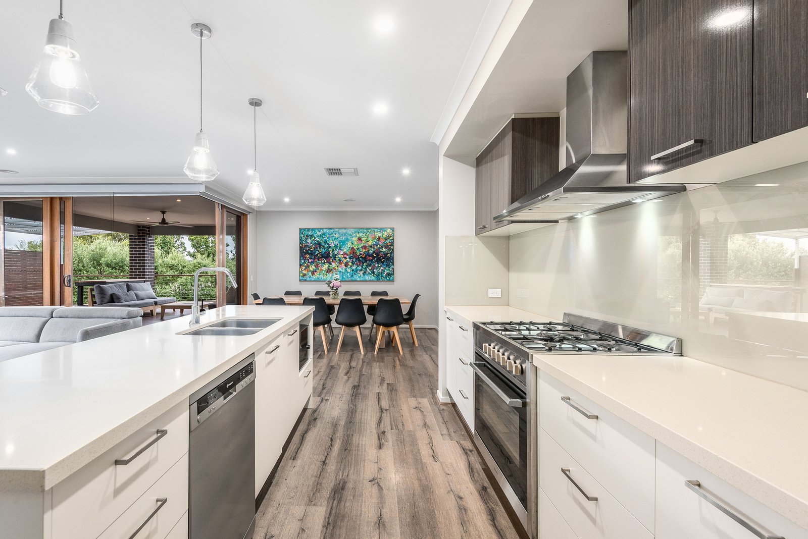 The rear of the home transitions to a spacious open plan kitchen, dining and living area, with beautiful timber stacker doors opening to the alfresco to create a seamless indoor–outdoor entertaining zone. The quality kitchen features stone benchtops, a 900mm oven and cooktop, rangehood, dishwasher, classic glass splashback, elegant pendant lighting, and generous storage including a walk in pantry.