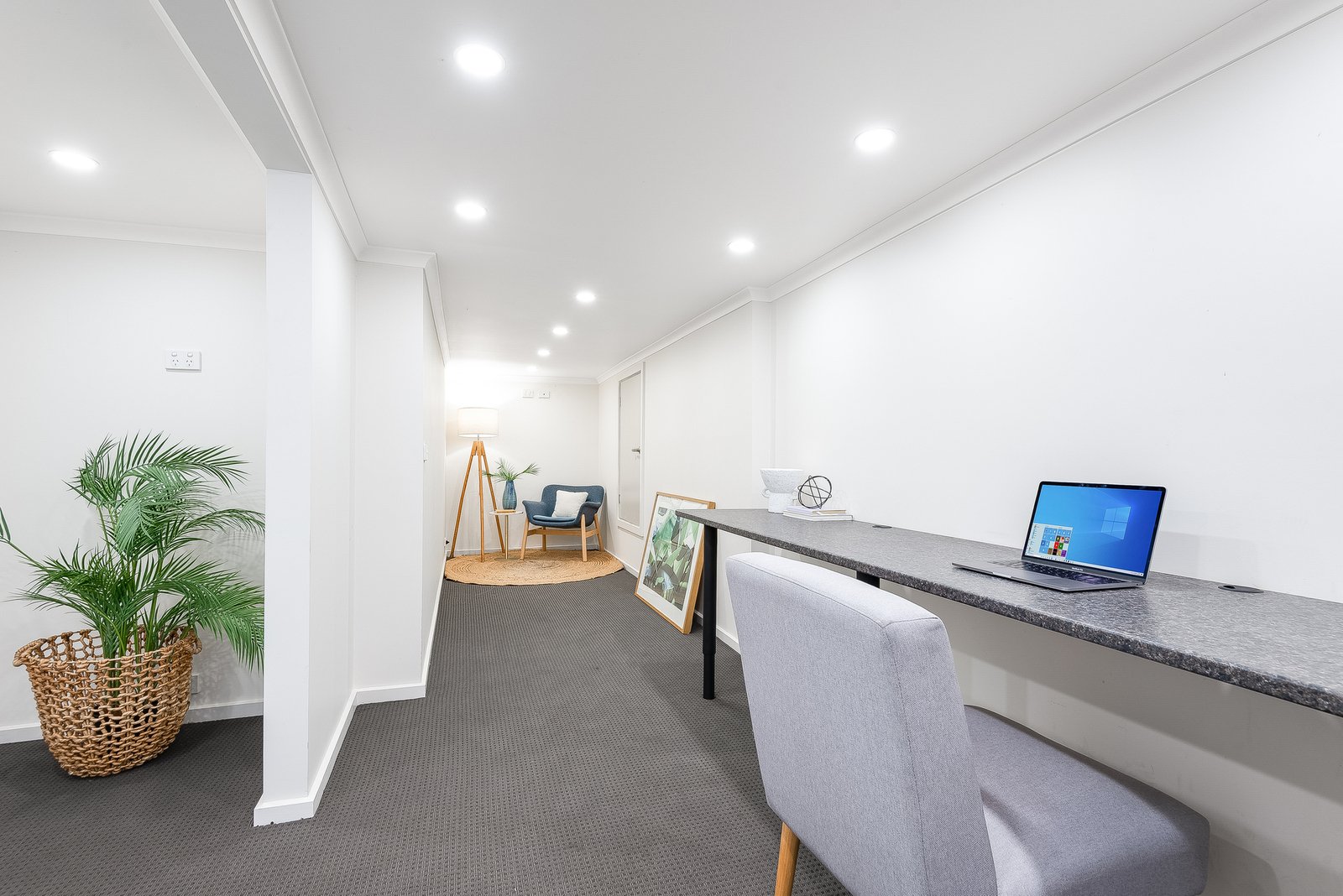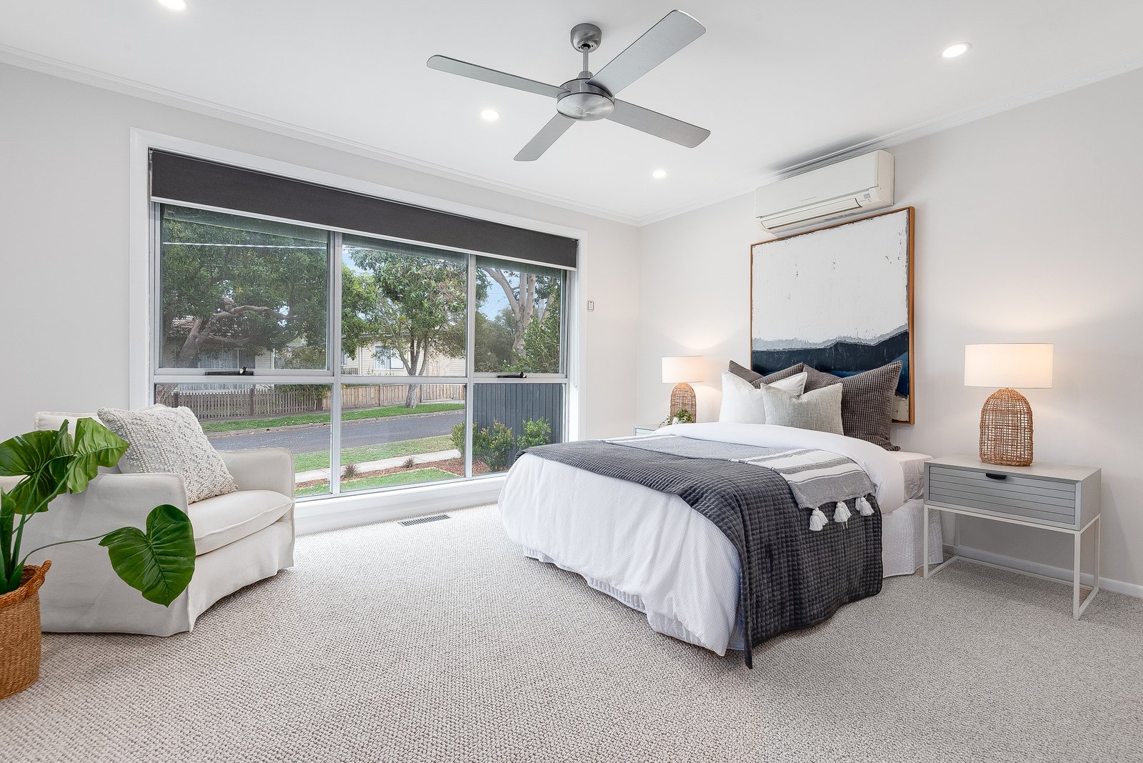 Comprising three generous bedrooms, all feature ceiling fans and built in robes, with two including split system heating and cooling. The central bathroom is presented in modern finishes with a luxurious bath, separate shower and dual basin vanity. A well appointed laundry and separate powder room at the rear cater for family functionality. Additional features include ducted heating, split system heating and cooling, roller blinds and external electric roller shutters on all three bedrooms to provide complete blockout. An externally accessed office provides a quiet and secluded space to work from home, complete with built in workstations, a sitting nook and access to under house storage.