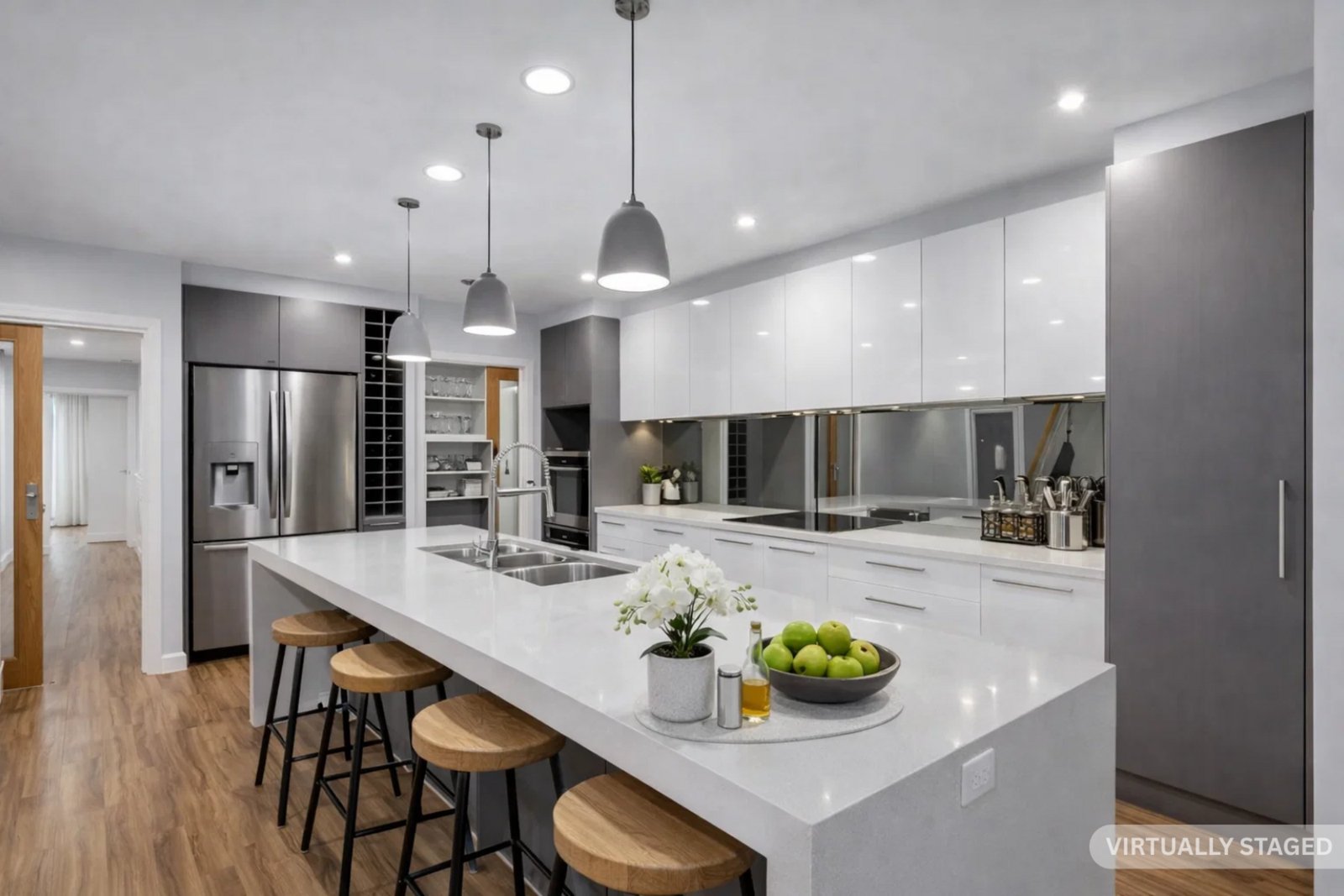 At the heart of the home is a light filled open plan kitchen, living, and dining area, thoughtfully designed for both everyday living and effortless entertaining. The well appointed kitchen showcases stone benchtops, induction cooktop & dual wall oven, and a spacious walk-in pantry with ample storage. A double fridge cavity with plumbing, along with cleverly designed cabinetry including dedicated wine storage, further enhances the space.