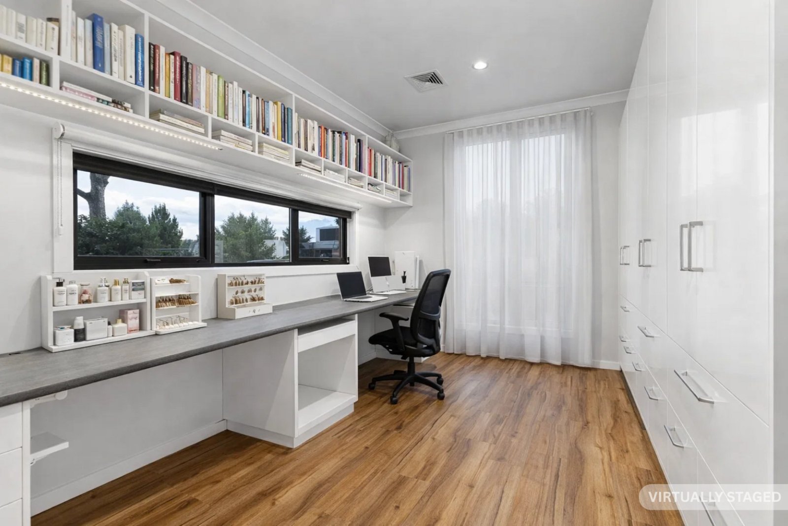 Adding to the home’s versatility is a second living area upstairs, capturing lovely views across to Prince of Wales Park an ideal retreat for growing families. At the front of the home, a dedicated office or study with built-in cabinetry and desk provides the perfect work from home setup, while also offering flexibility to be easily converted into a fifth bedroom if required.
