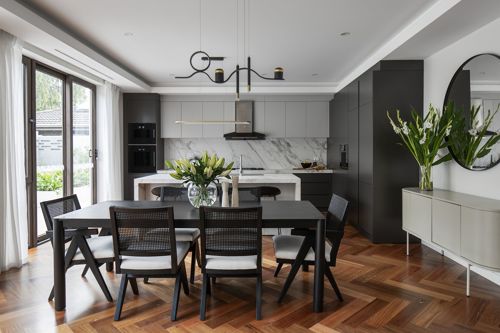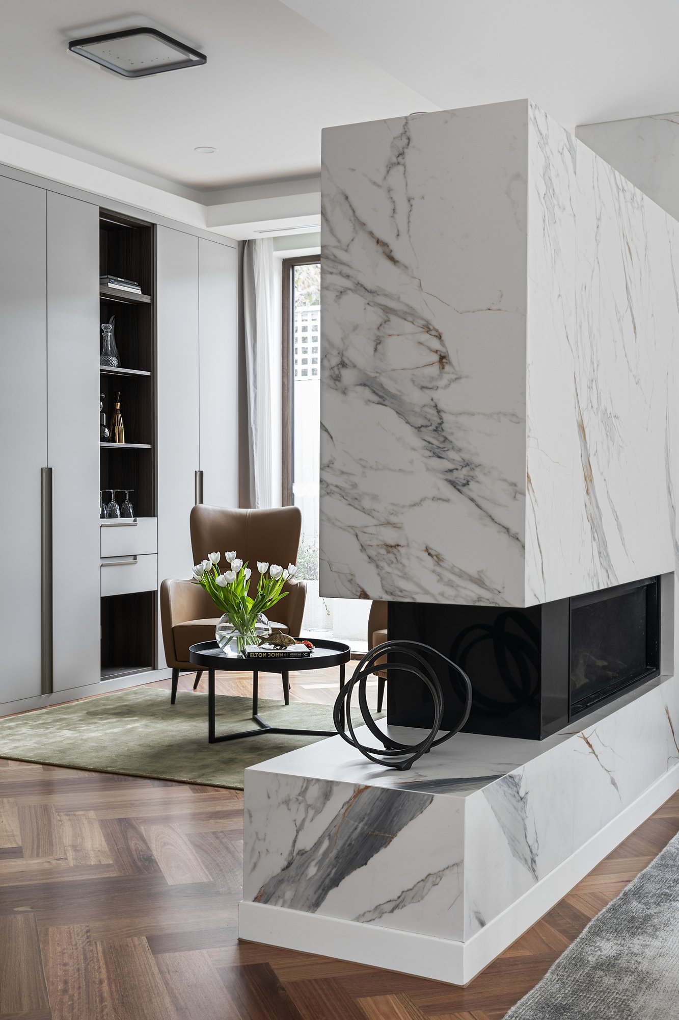 A wide herringbone-floored hallway, framed by extra-high LED-lit tray ceilings and bespoke joinery, introduces expansive living and dining spaces bathed in natural light. A striking veined feature wall with a double-sided gas fireplace connects seamlessly to an executive home office or sophisticated sitting room.