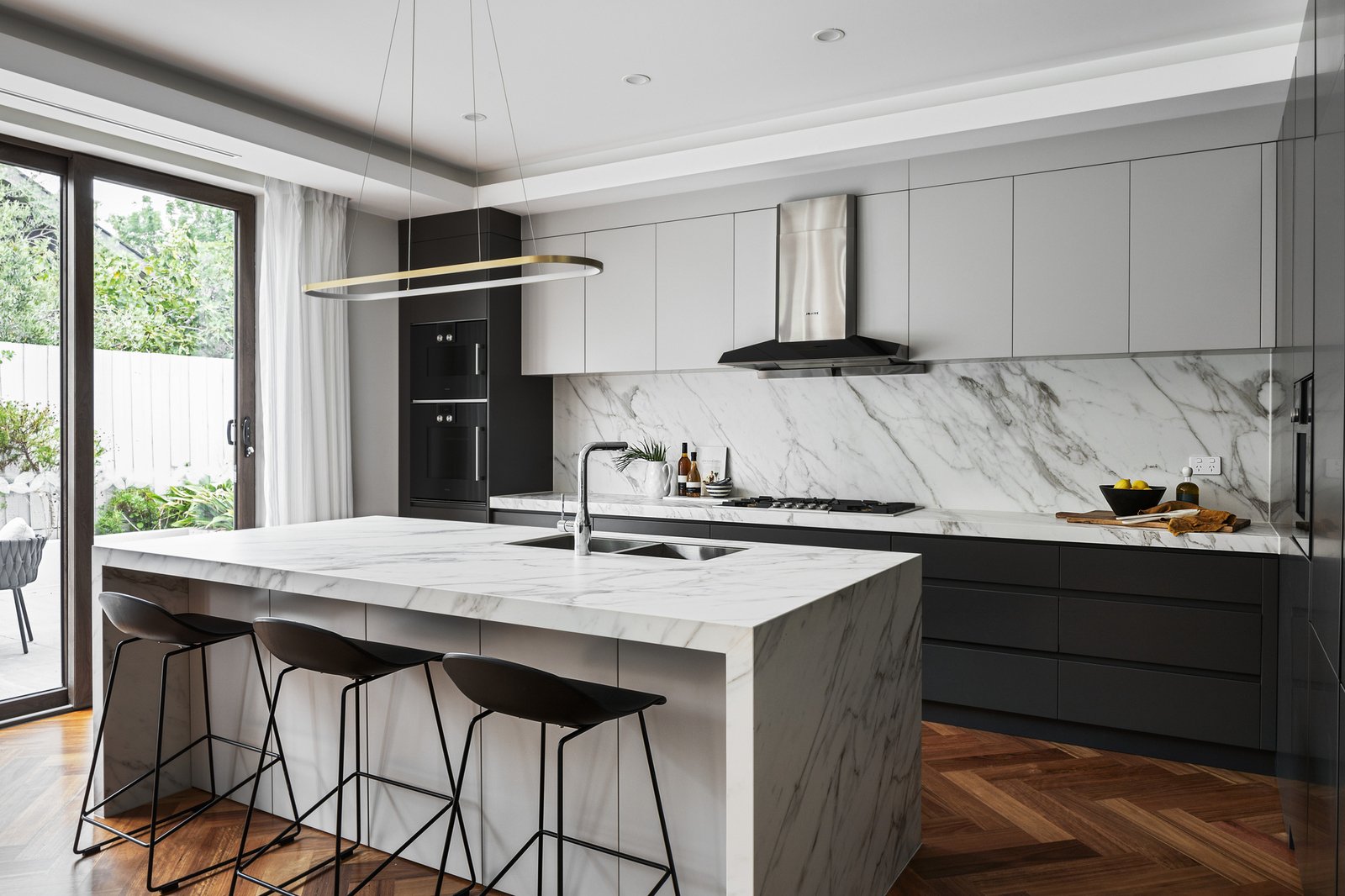 Extending to a vast, wrap-around terrace, the residence is designed to entertain in style, offering multiple zones to relax, dine and host in complete privacy. At its heart, a statement kitchen showcases a waterfall island, premium Gaggenau appliances (including gas cooktop, combi ovens and coffee machine), integrated Miele refrigeration and dishwasher, and sleek custom cabinetry.