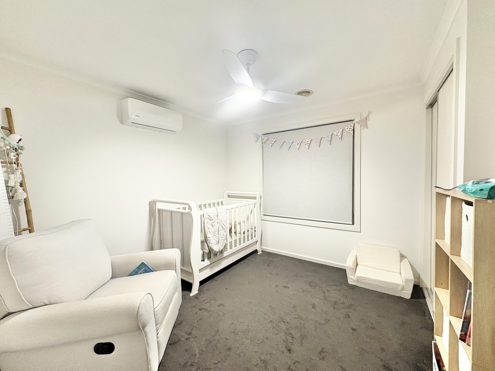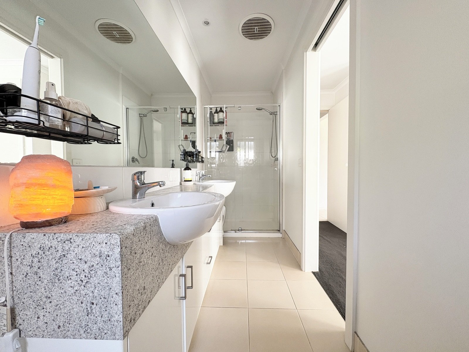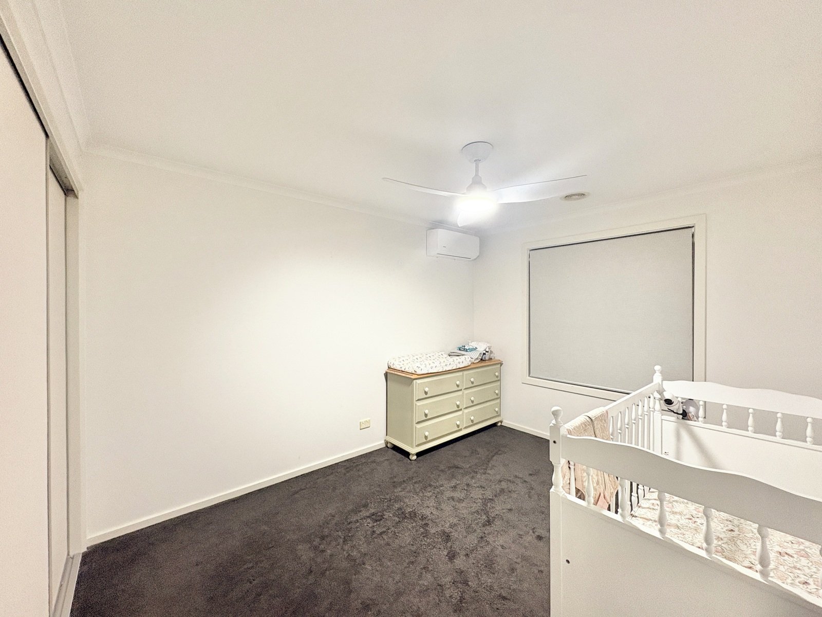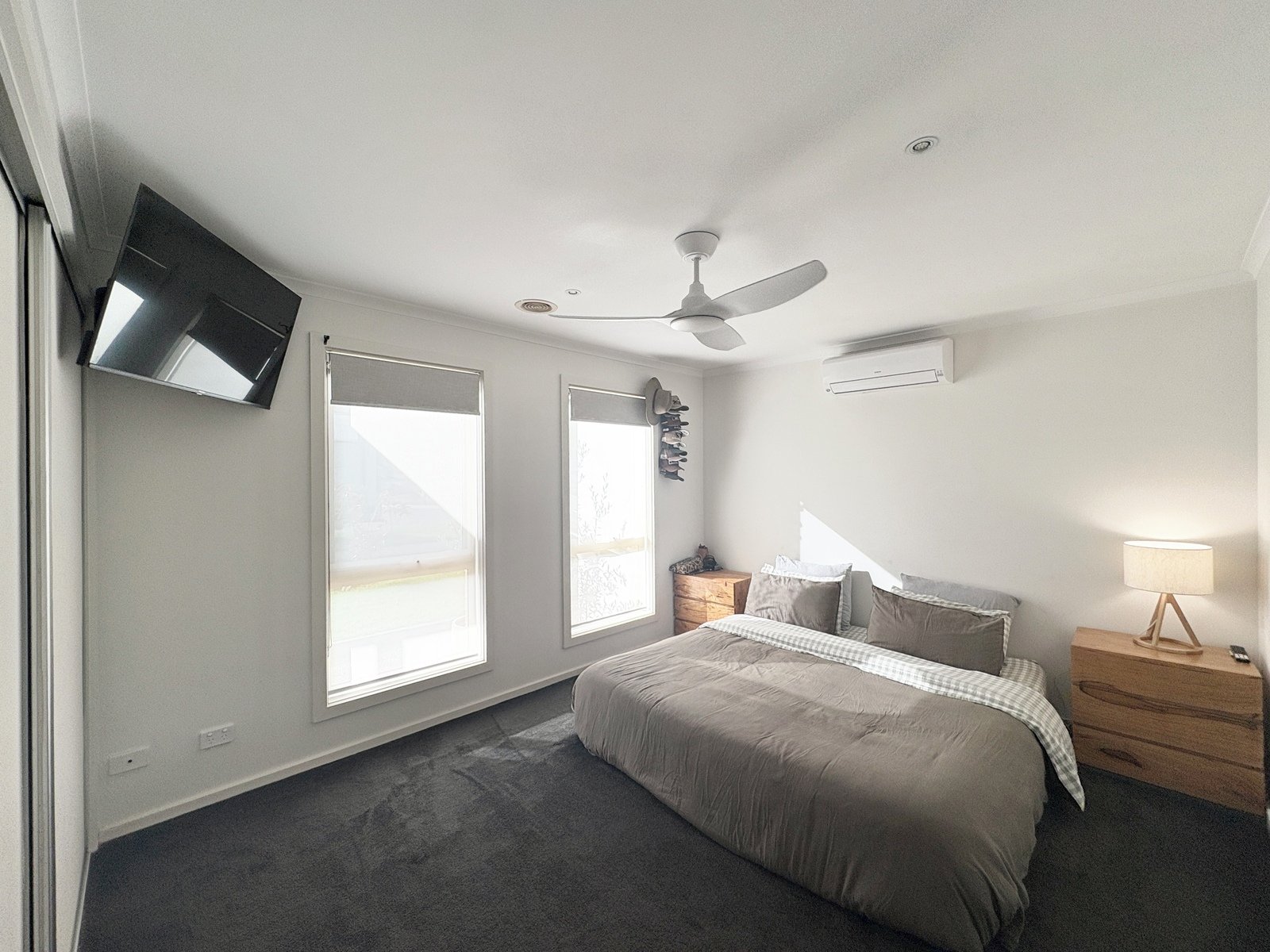The property comprises three generously sized bedrooms, all complete with built-in robes, split system heating and cooling and ceiling fans for year-round comfort. The master bedroom also includes its own ensuite, while the remaining bedrooms are serviced by a central bathroom designed with practicality in mind.