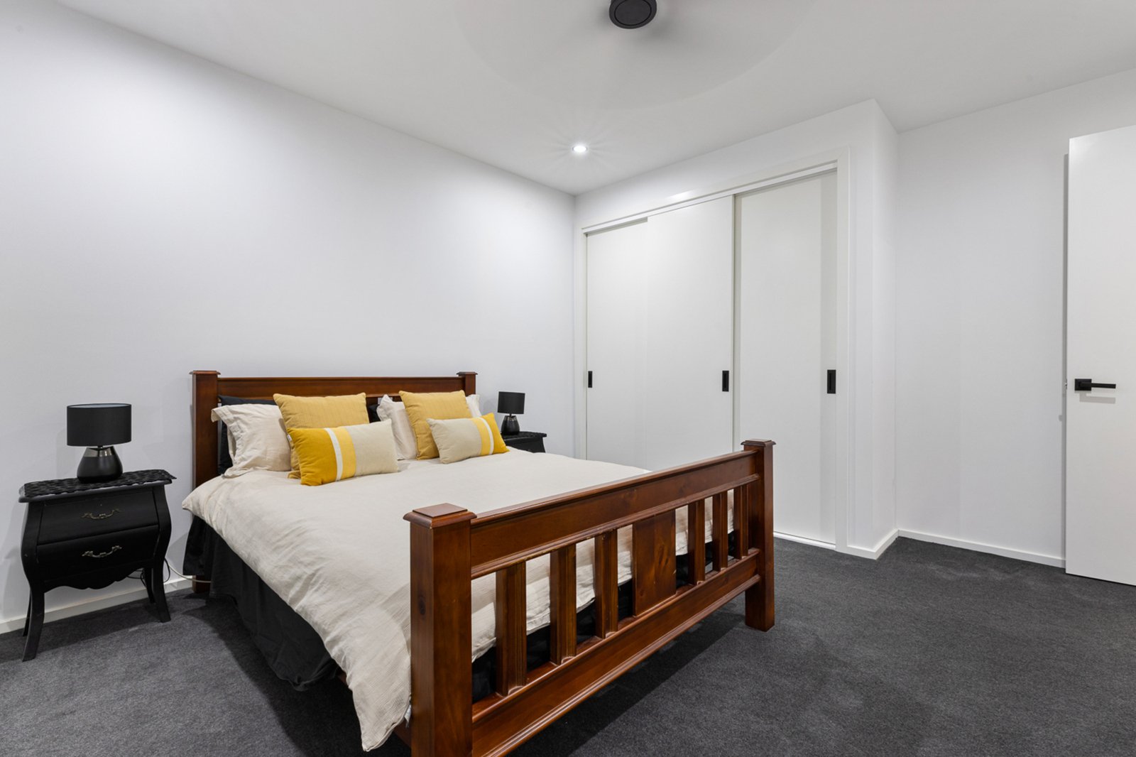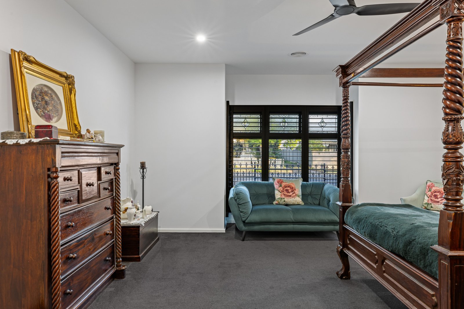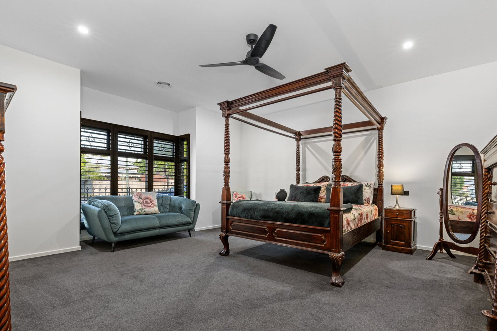 Accommodation is exceptional, with five bedrooms and 3.5 bathrooms across the property. The king-size master suite is a true retreat, boasting a box bay window with plantation shutters, a huge walk-in robe, and an ensuite with double vanity, double shower, bath, and toilet. Upstairs offers three bedrooms plus a study (or optional fourth bedroom), while downstairs provides a fully self-contained apartment with two bedrooms, a kitchen, and a bathroom—perfect for extended family or guests.