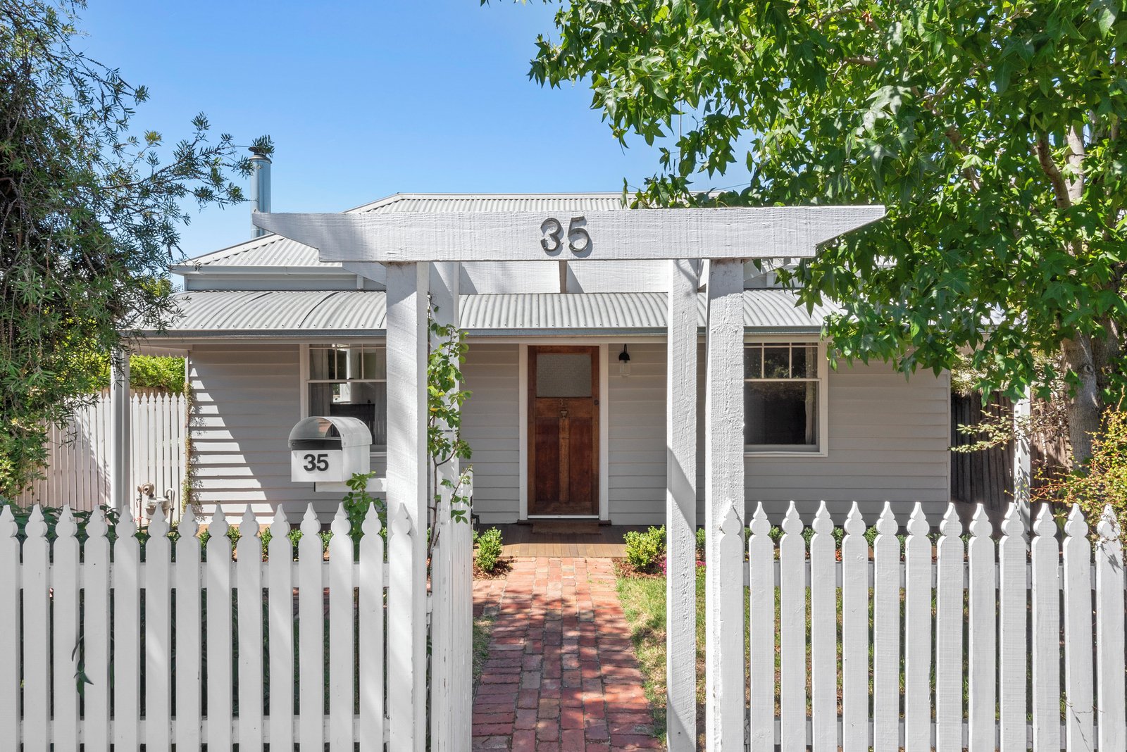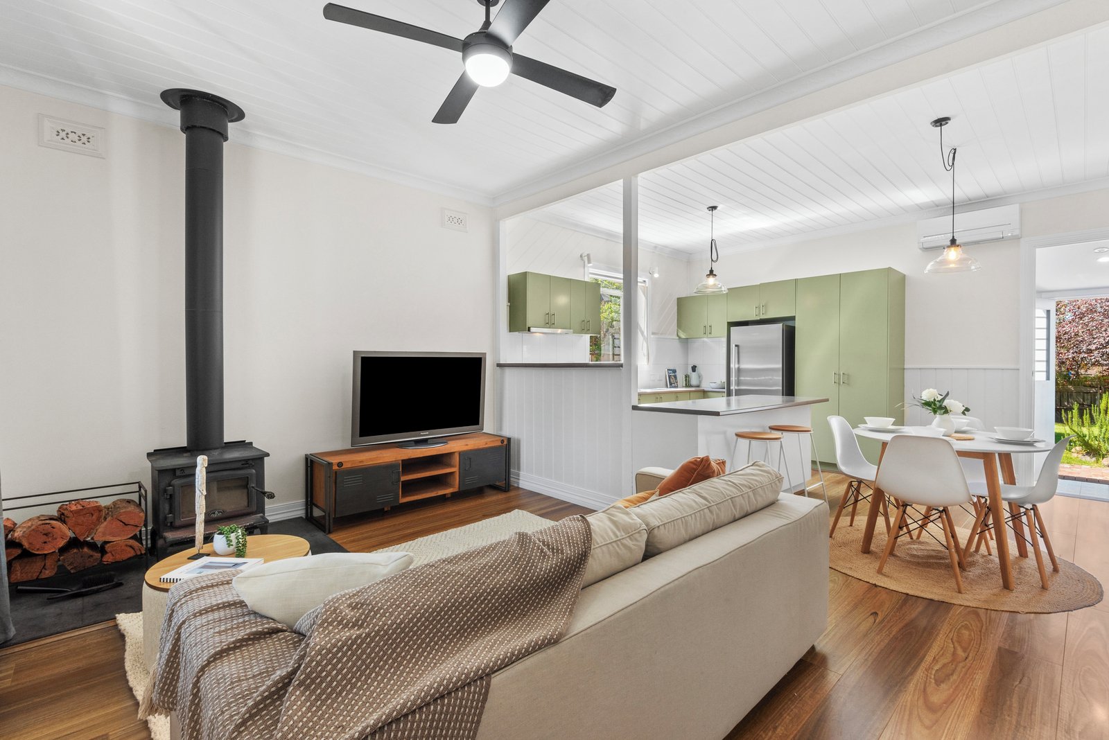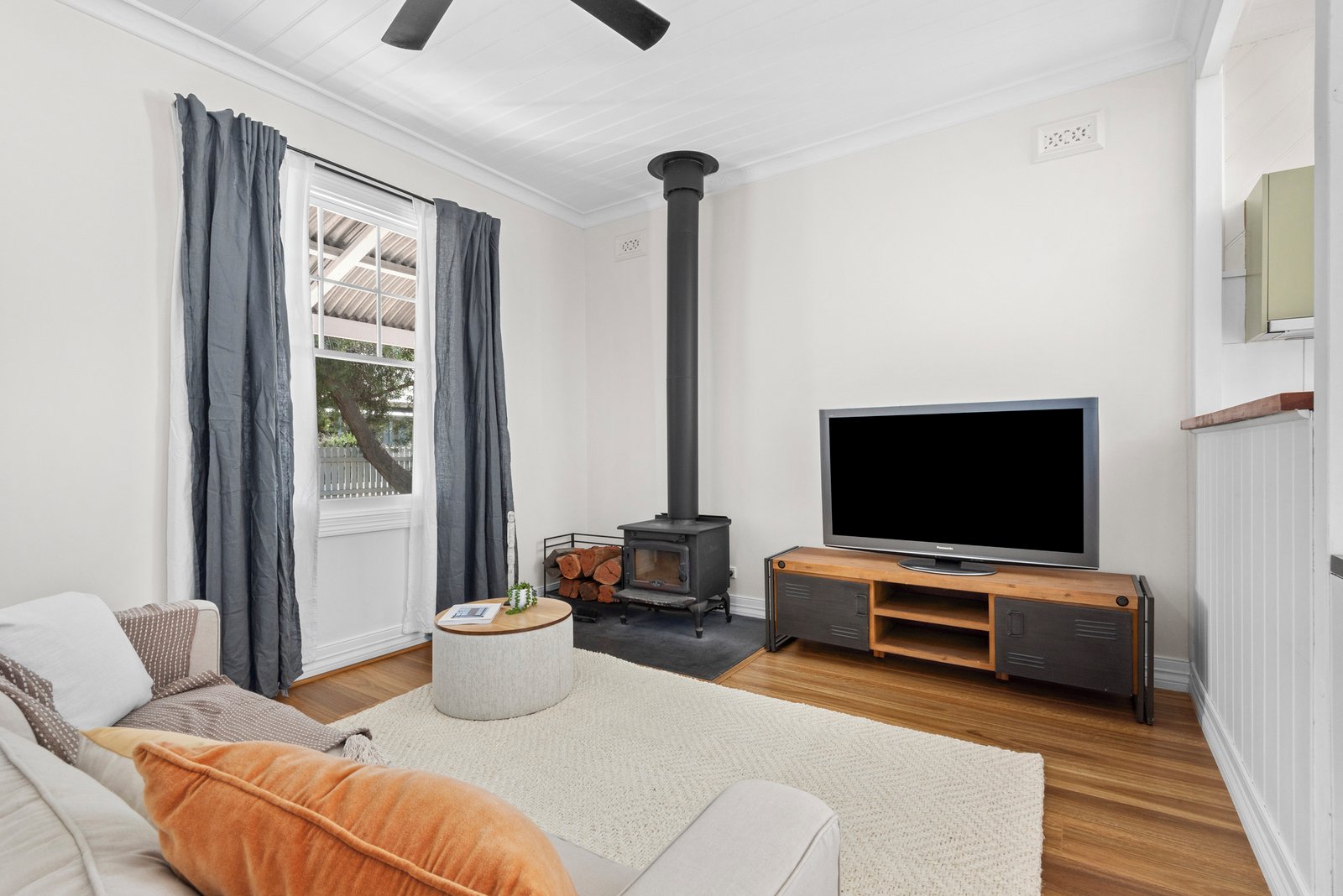 The beautifully preserved miner's cottage façade is set behind a picket fence and established gardens. Entry into the open plan living area showcases contemporary flooring, crisp white interiors, original lining board ceilings and a woodfire heater creating a warm and welcoming atmosphere within. Split system heating and cooling plus a ceiling fan take care of your modern comforts throughout the seasons. The updated kitchen features chic cabinetry, stainless steel oven and gas cooktop, excellent storage, and ample bench space. Beautiful pendant lighting in the kitchen and adjoining dining area adds to the inviting ambience of this space. Comprising three bedrooms, the main features built-in robes, and the tastefully presented bathroom is finished in classic subway tiles, with modern vanity, shower over bath, quality tapware and fittings.