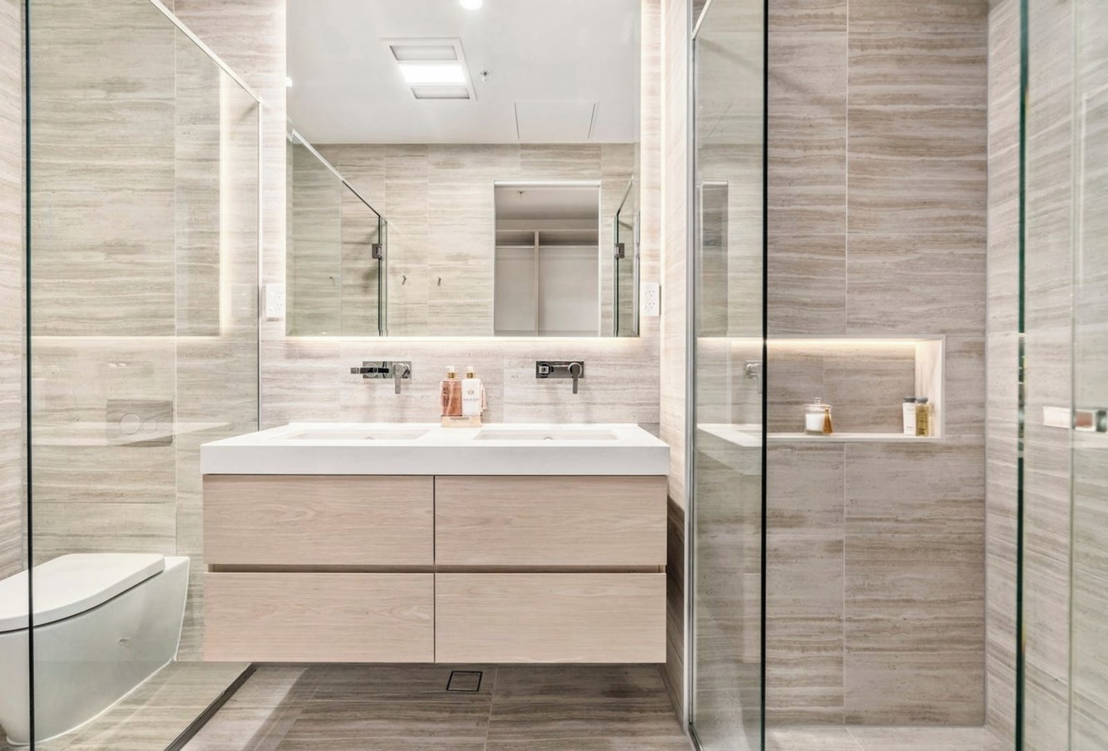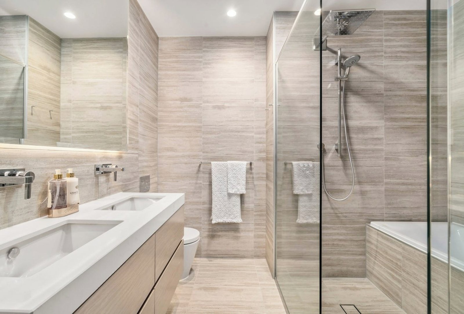All three generously proportioned bedrooms are fitted with extensive built-in robes and are serviced by two luxurious bathrooms appointed with Grohe rainfall showers, double vanity with integrated LED lighting and refined contemporary finishes.