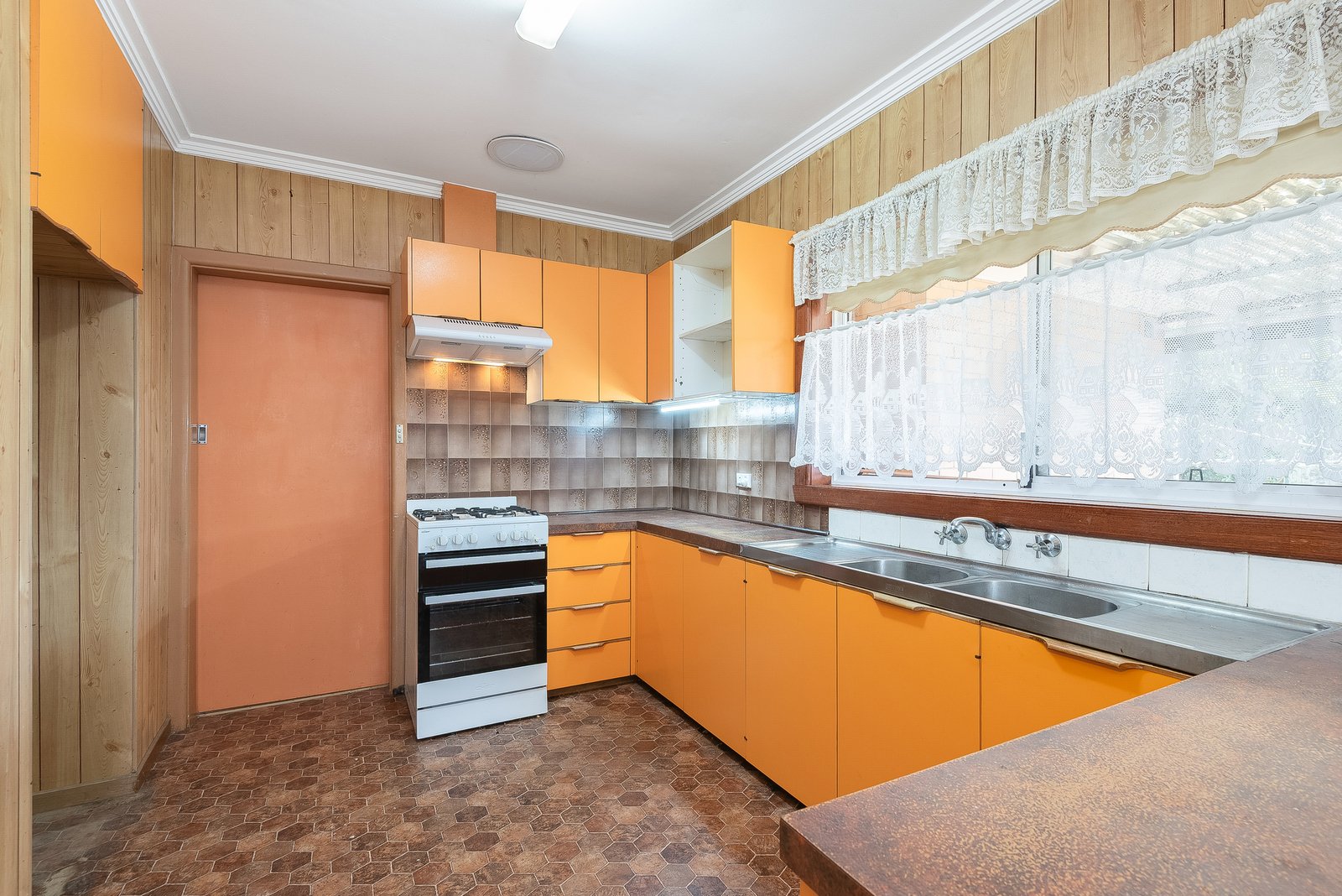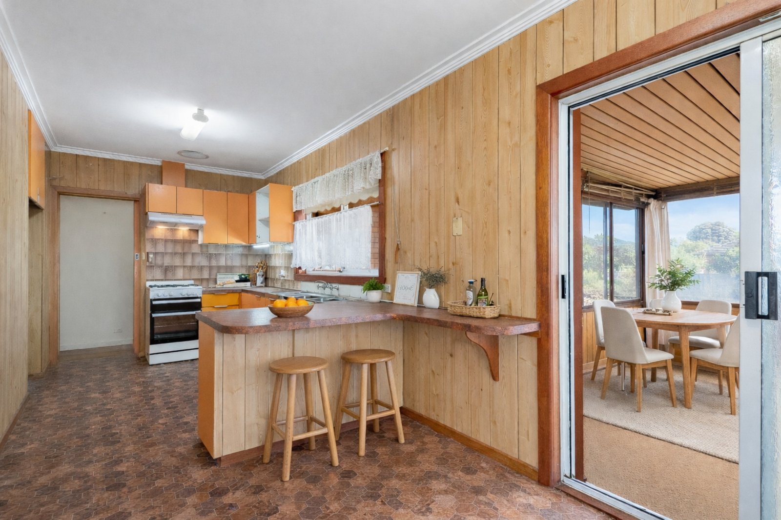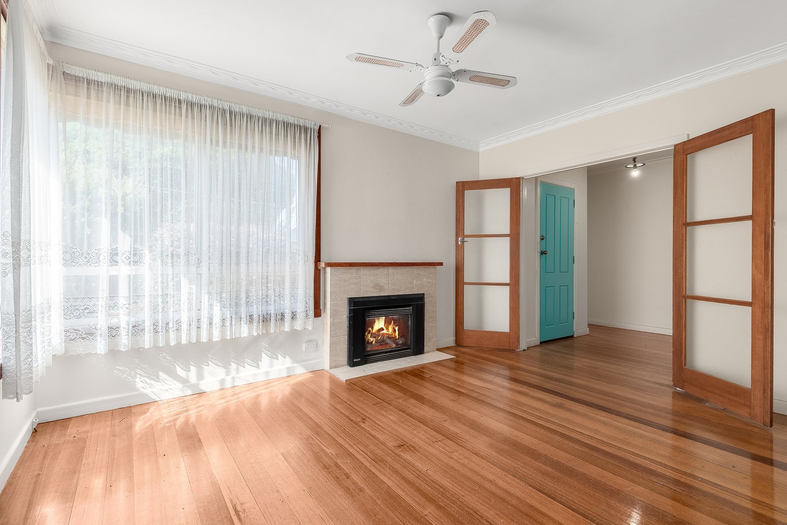 The classic triple-fronted brick façade is set behind established gardens. From the entry, double doors open to the inviting living area, featuring polished timber floors, decorative cornice, a ceiling fan, original mantel and gas log fire for a cosy ambience. The adjoining kitchen is a step back in time with bright retro cabinetry, and a rear sunroom provides a light-filled space to retreat.