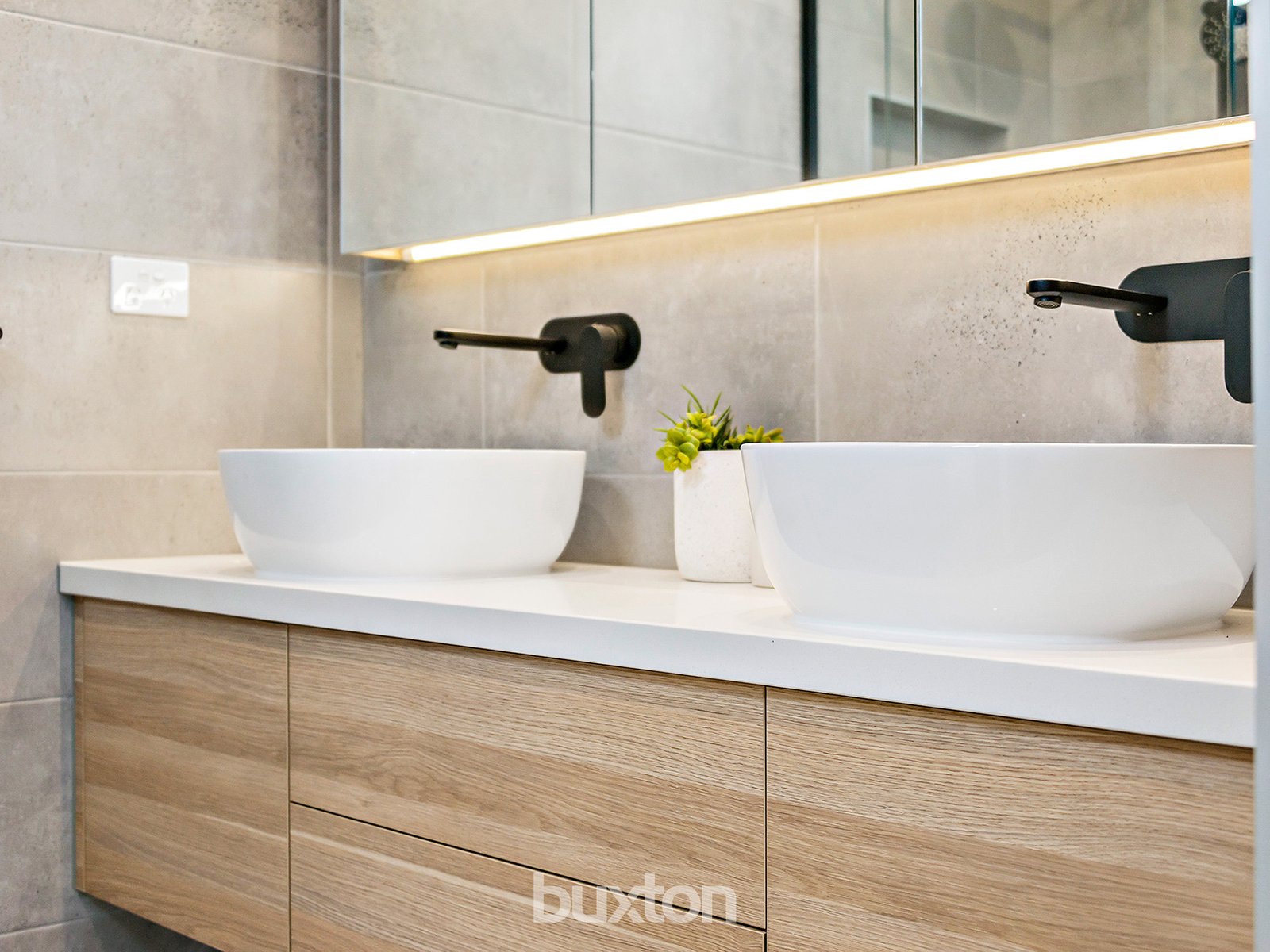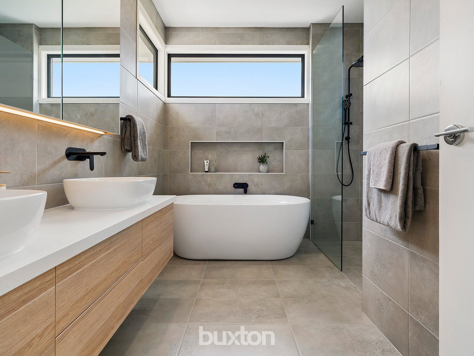 - Sublime family bathroom with double floating vanities, walk-in shower and freestanding bath.