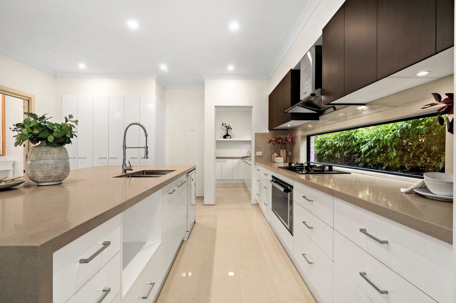 Cooking will be an absolute pleasure across a showcase kitchen, smartly fashioned around a waterfall island bench, with Euro appliances including a De Longhi oven, and a spacious side pantry to house all your cookware.