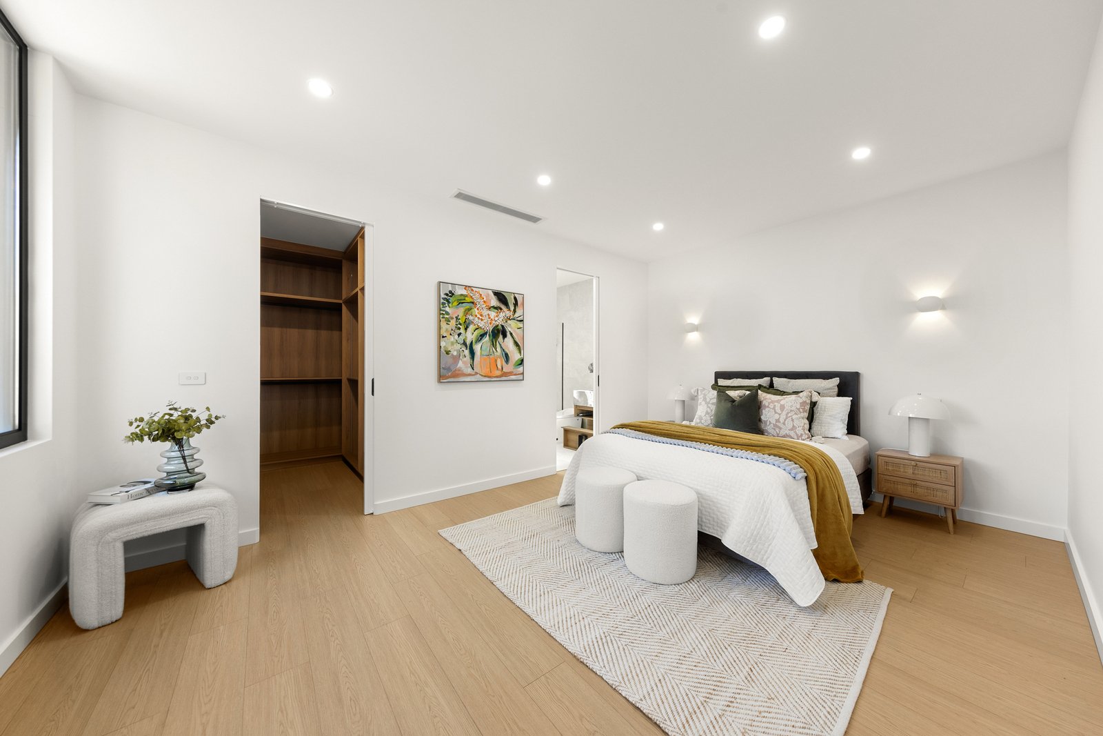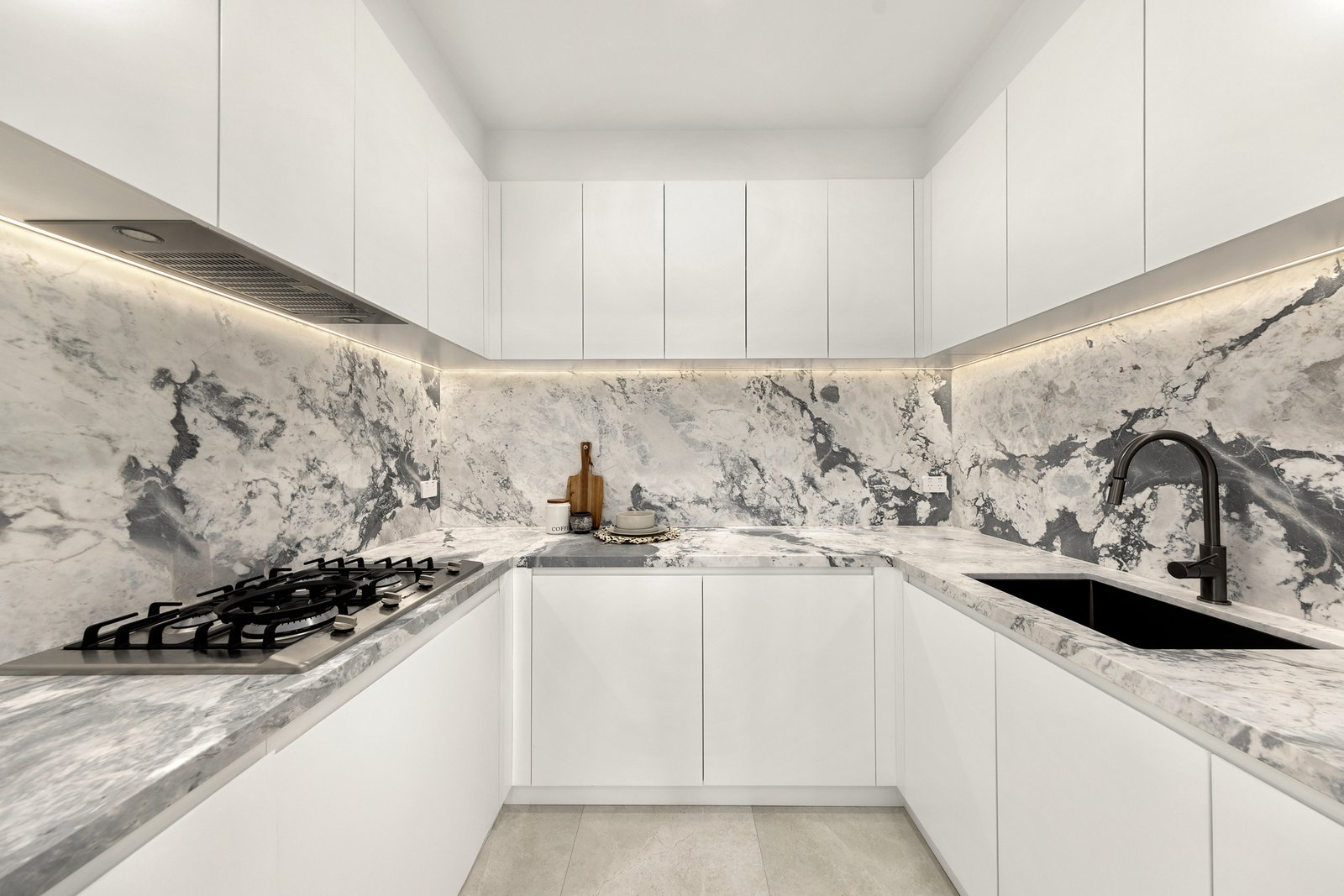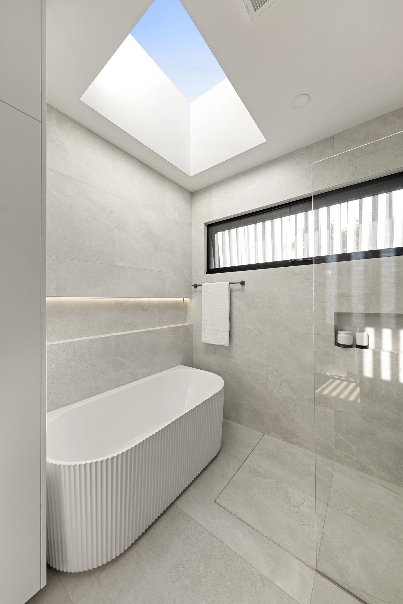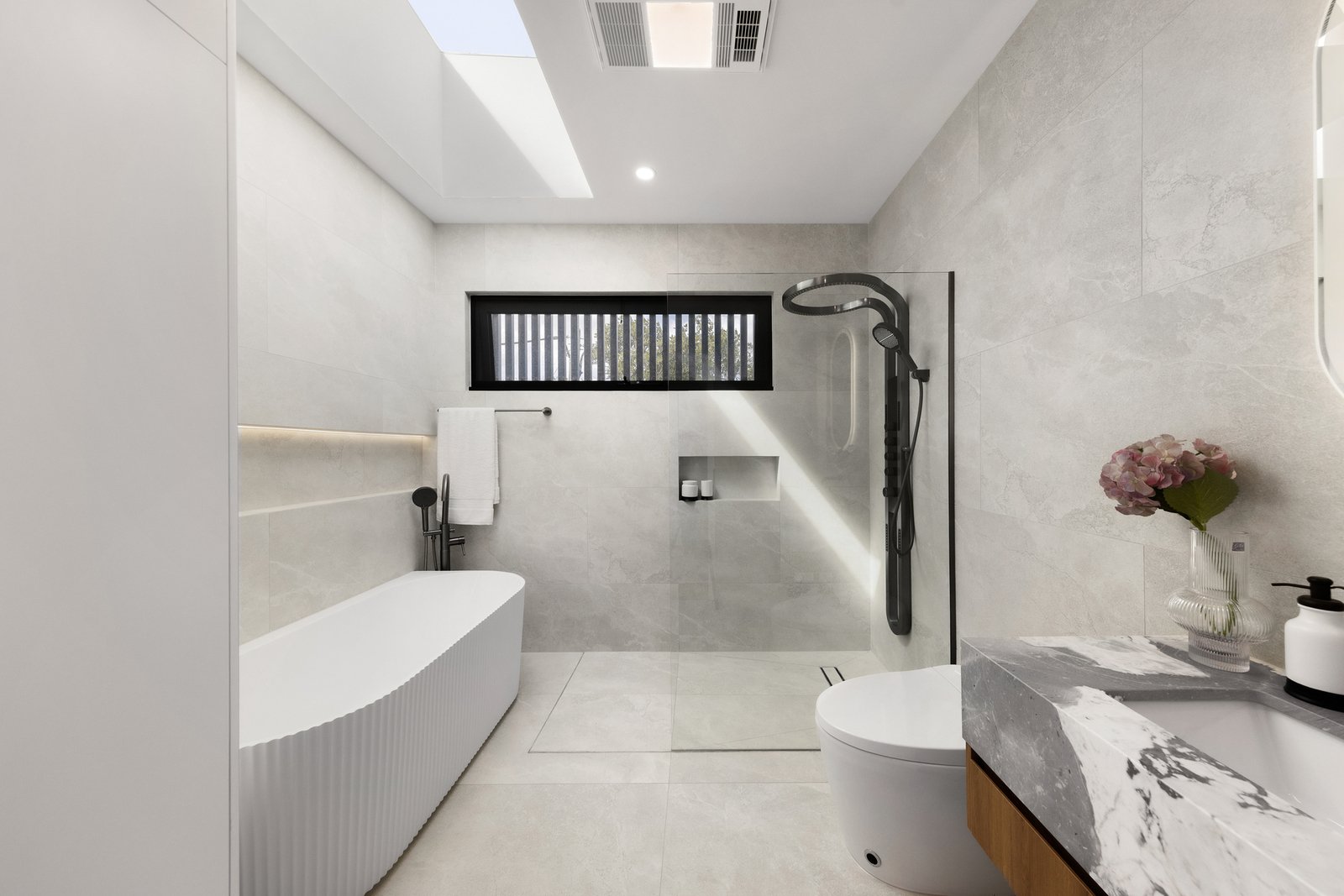 The remaining three robed bedrooms grace this level, each boasting custom cabinetry and their own high-end ensuite, while the master benefits from a walk-in-robe with LED strip lighting and the addition of a bathtub and skylight in the ensuite.