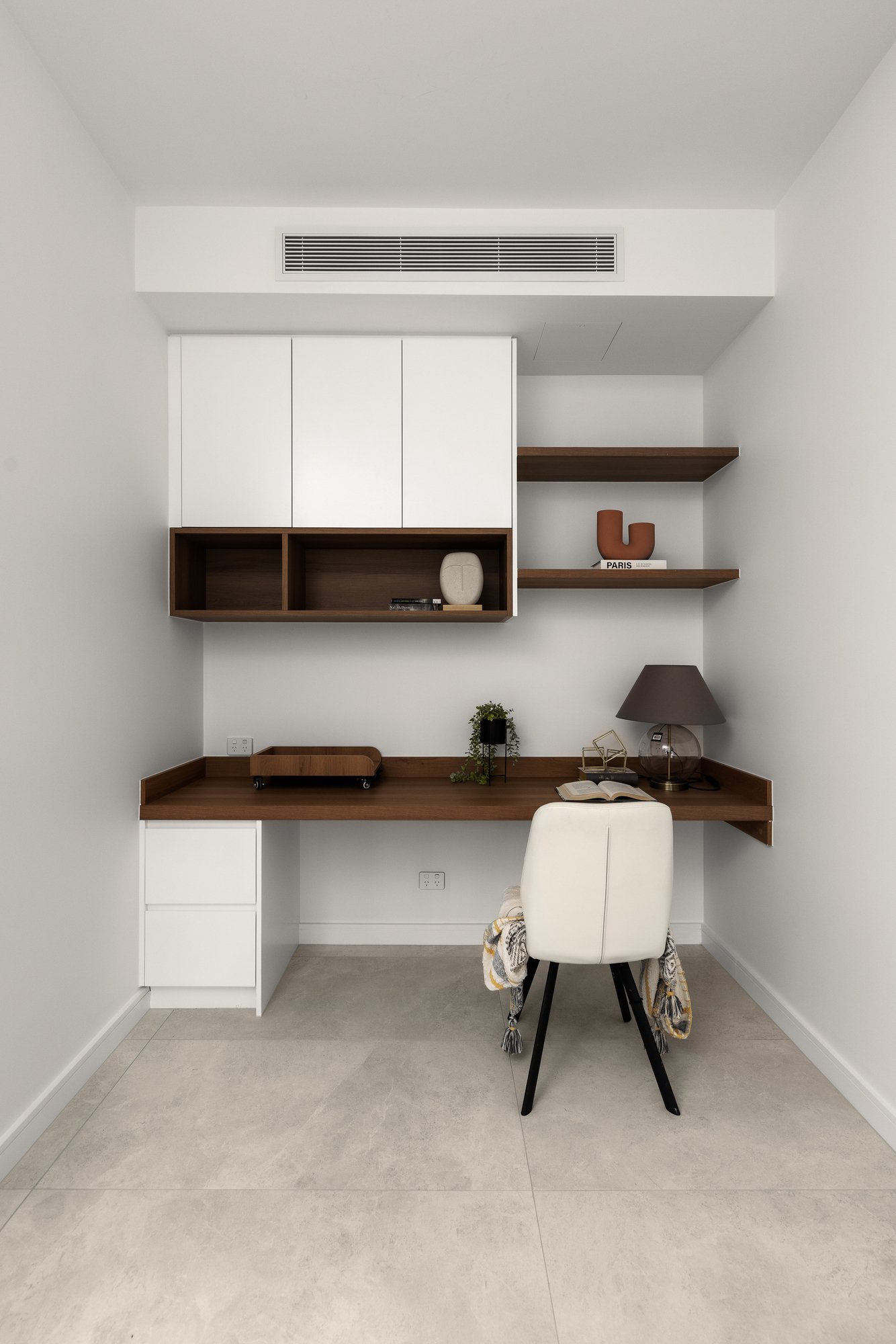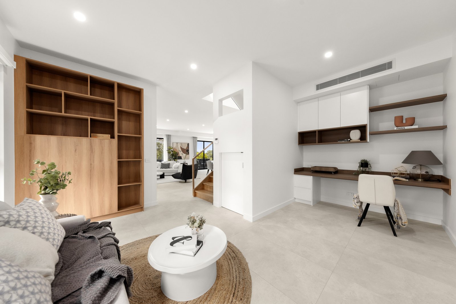 Promoting functionality, the second living space spans through to a home office boasting a fitted desk, while the ground floor further features the 4th bedroom with built-in-robe and luxe ensuite, powder room with smart toilet and a laundry with stone bench and side-by-side washer-dryer space.