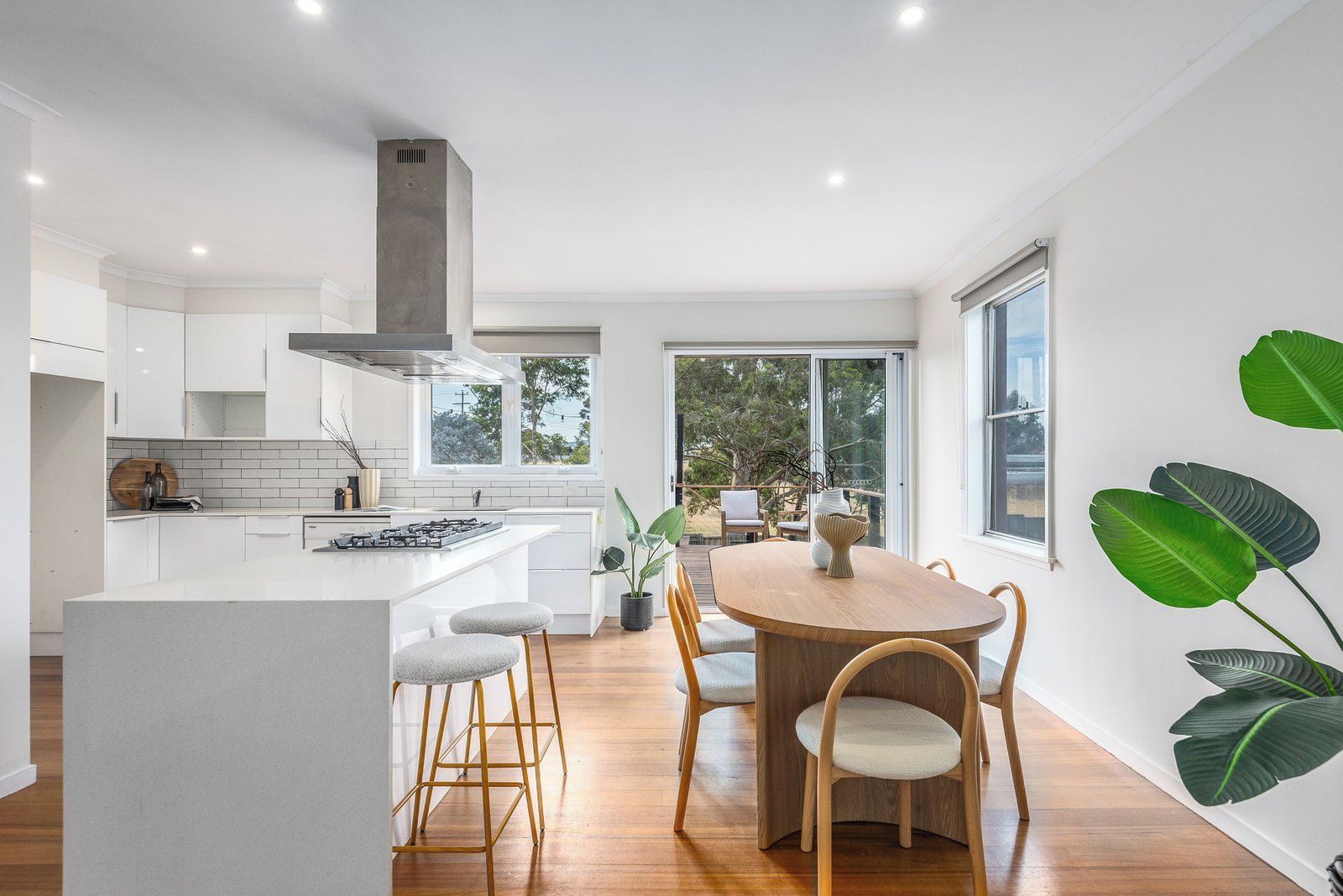 Nestled behind lush established gardens, the home presents timeless appeal. Entry into an open plan living area reveals light-filled interiors and polished timber floors creating an inviting atmosphere throughout, with split system heating and cooling for year round comfort. The elegant kitchen features a central island, stone benchtops, quality appliances including a 600mm Westinghouse oven, 900mm gas cooktop, rangehood, Miele dishwasher, classic subway tile splashback, ample bench space and storage. Perfectly positioned to overlook the dining space, with servery windows to the rear deck, entertainers will love the design of this space.