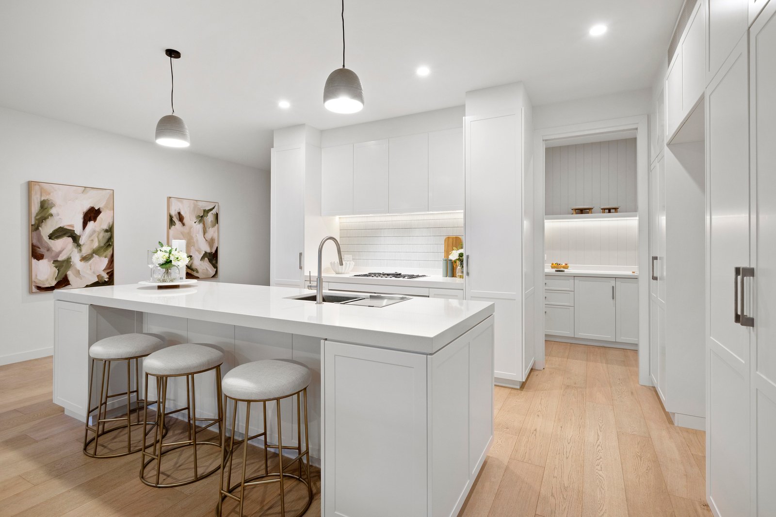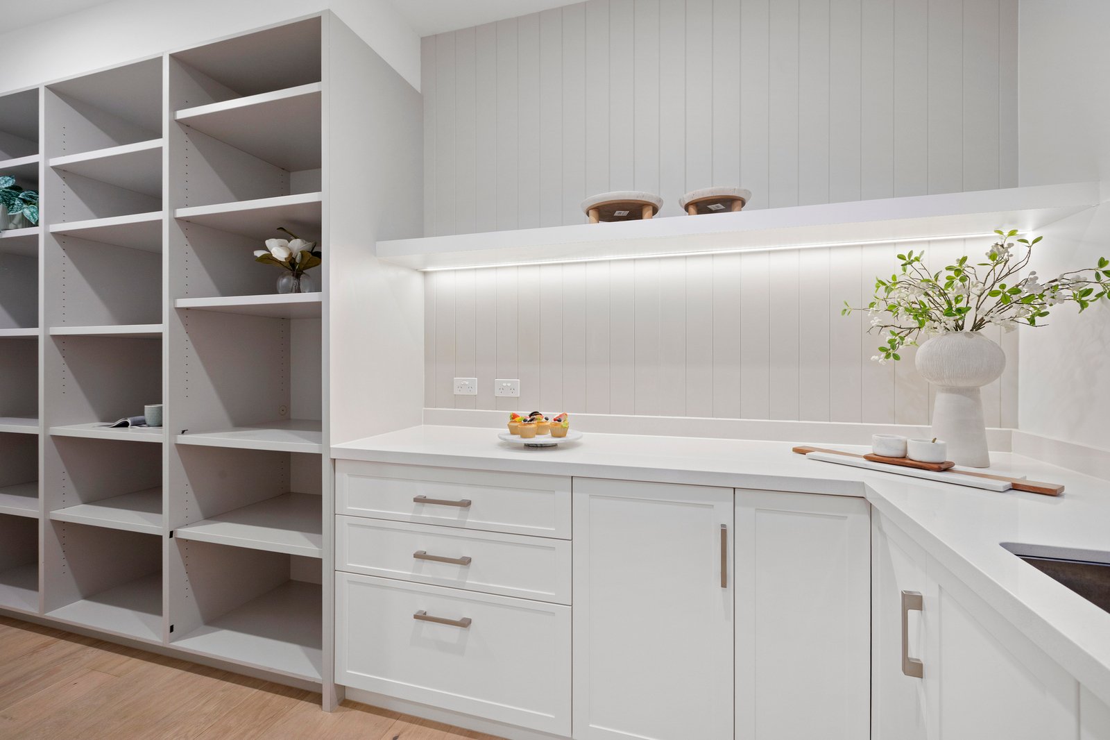 A showcase of timeless style with V-groove panelling, light Oak flooring and pure white stone benchtops as the backdrop to today's prestige finishes, this rare beauty stars an elite Miele appliance kitchen (with dual ovens) serviced by a true butler's pantry (with sink) and Shaker-style cabinetry in a soft grey scheme.