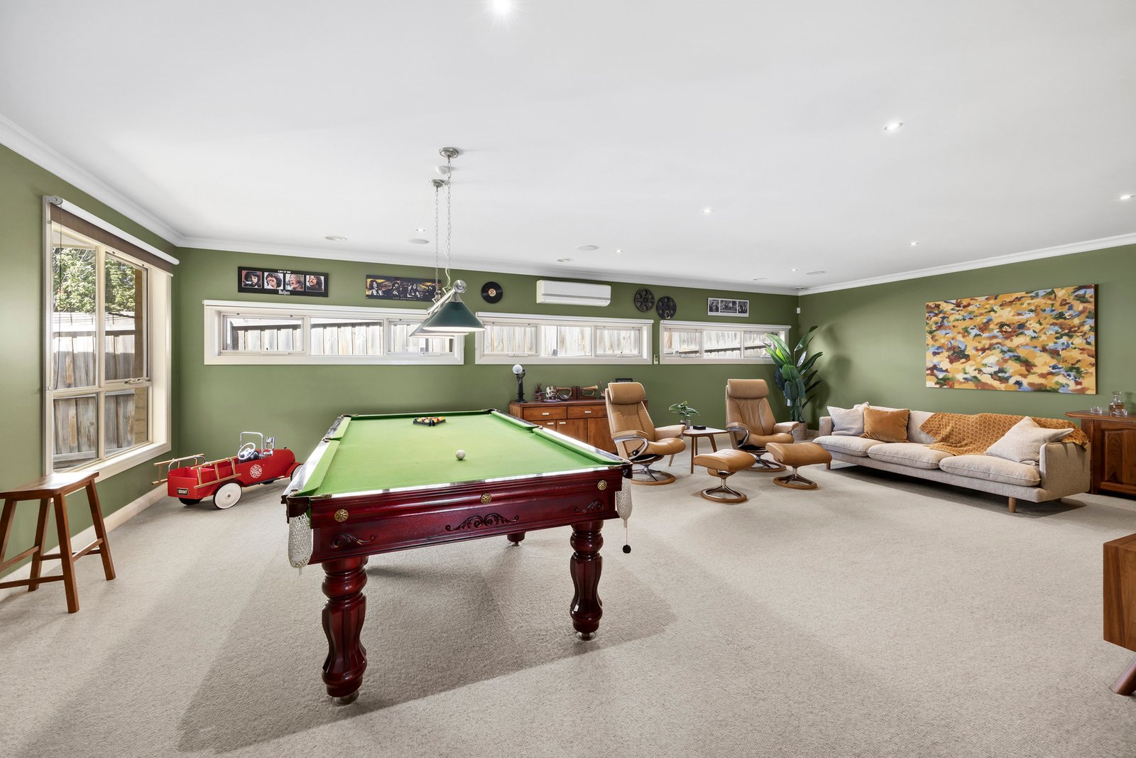 Set back from the road behind established trees, the two-storey façade introduces the timeless style of the home. Stepping inside, a wide entry features parquetry timber floors, leading into an inviting formal lounge presented in a warm earthy palette with a gas log fireplace and marble surround as its centrepiece, offering an ambient space to retreat. At the heart of the home, the open plan kitchen, dining and family room features glass stacker doors connecting with the undercover alfresco for seamless indoor-outdoor living and entertaining. The high end kitchen features stone benchtops, a 900mm Ilve oven and cooktop, Bosch dishwasher, and endless storage including a large walk-in pantry. From the living area, double doors open up to an expansive rumpus room, offering a generous space for play, relaxation or entertaining, complete with a sound system and soundproof lining.
