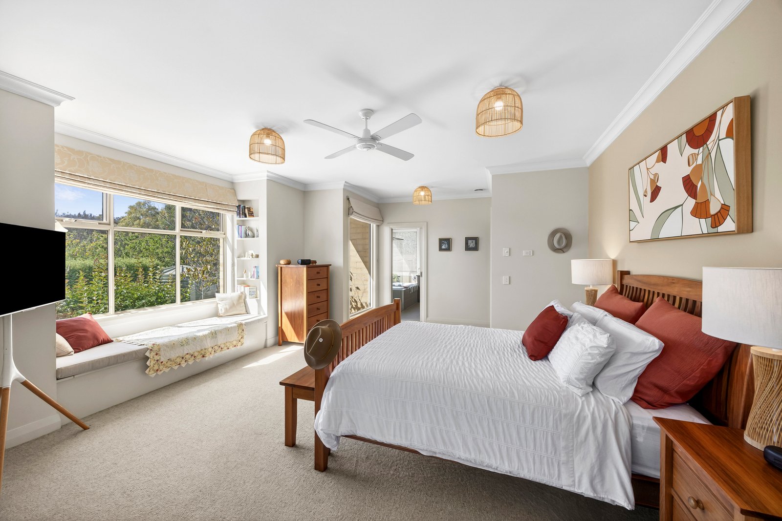 The luxurious main bedroom is a private retreat at the rear of the home, featuring a stunning picture window with a tranquil garden vista, a box bay window with built-in seating, direct access to the deck and spa area, walk-in robes, and stylish ensuite featuring a bath, separate shower, modern vanity, and a separate wc. An additional bedroom on the ground floor includes built-in robes and is well positioned for a nursery. Upstairs, two further bedrooms include individual split system heating and cooling, built-in robes, desks and ensuites, accompanied by a retreat living area and private balcony with picturesque views, creating the ultimate teenager’s retreat or an impressive guest quarters. A study on the ground floor includes a built in desk and storage offering a versatile space that is also suitable as a fifth bedroom.