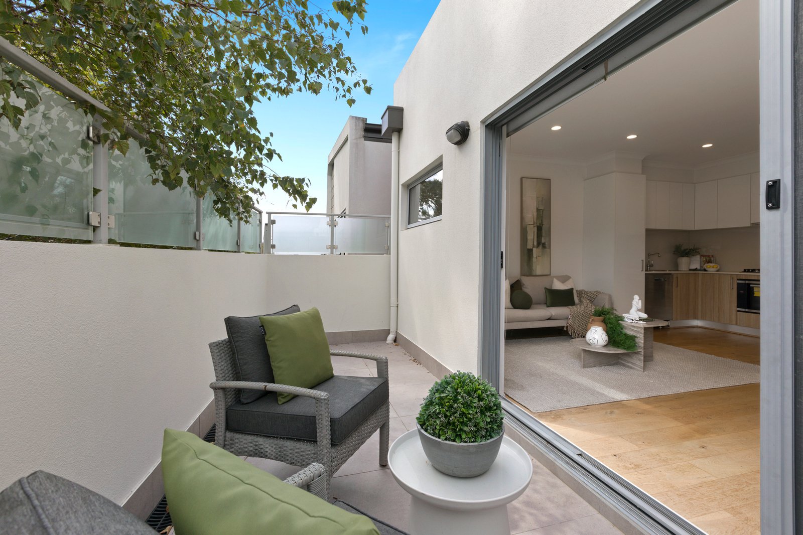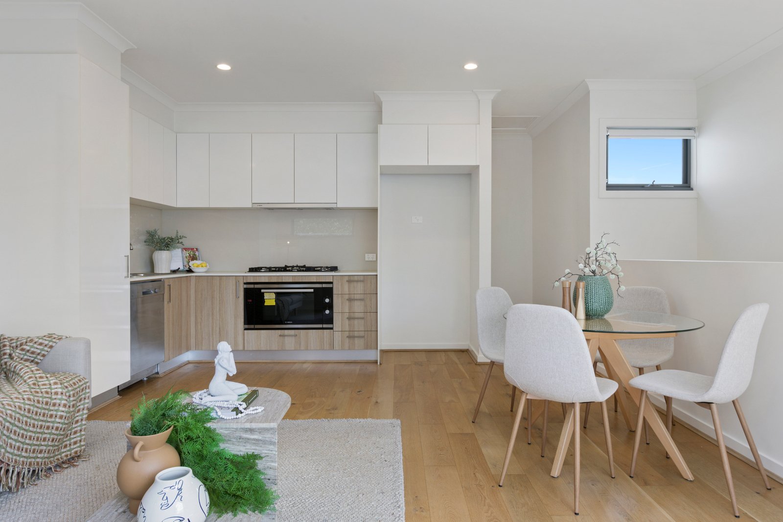 A reverse floorplan serves to enhance the natural light and sense of privacy through the inviting layout, which offers an upper-level living and dining zone with oak flooring flowing to the smart Bosch kitchen boasting 900mm cooking appliances. The northerly aspect floods this space with natural light, and extends to a sunny outdoor space — ideal for BBQs or relaxing in the sun.