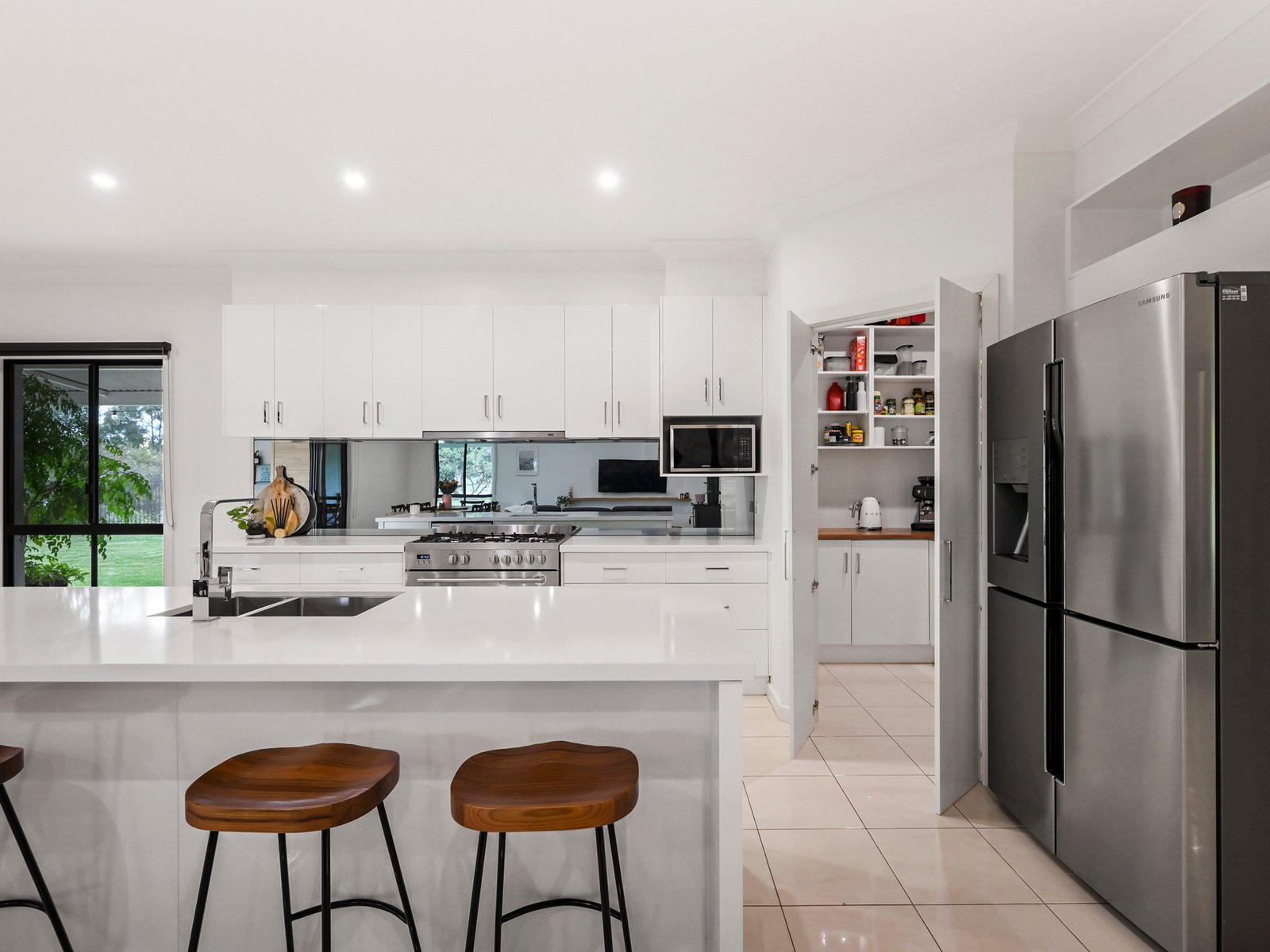 The pristine kitchen and walk-in pantry are a blend of bespoke cabinetry, premium appliances and stone benchtops, the perfect combination for family catering and entertaining.