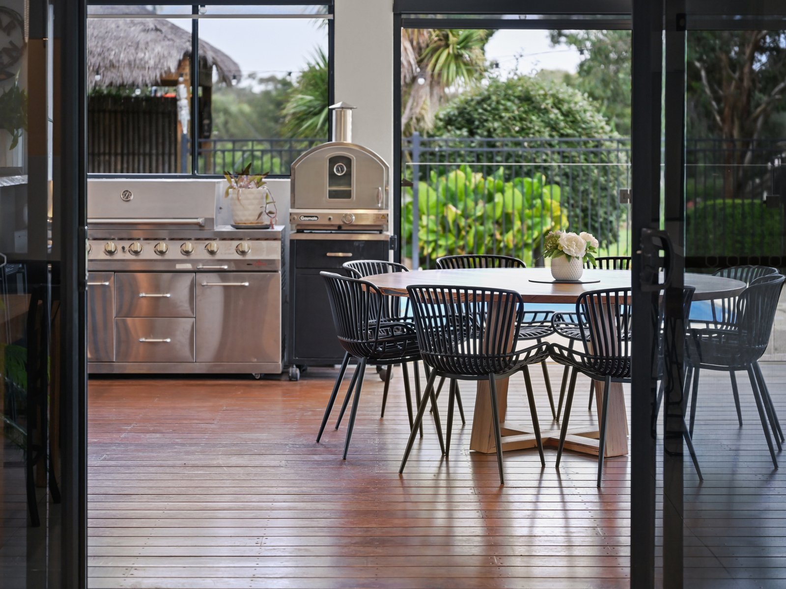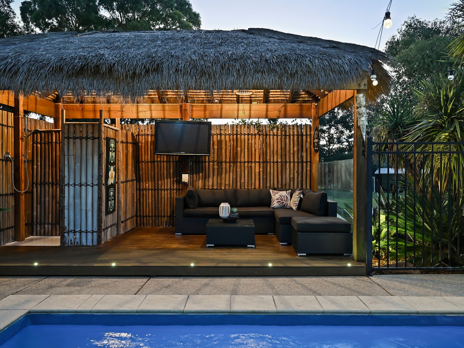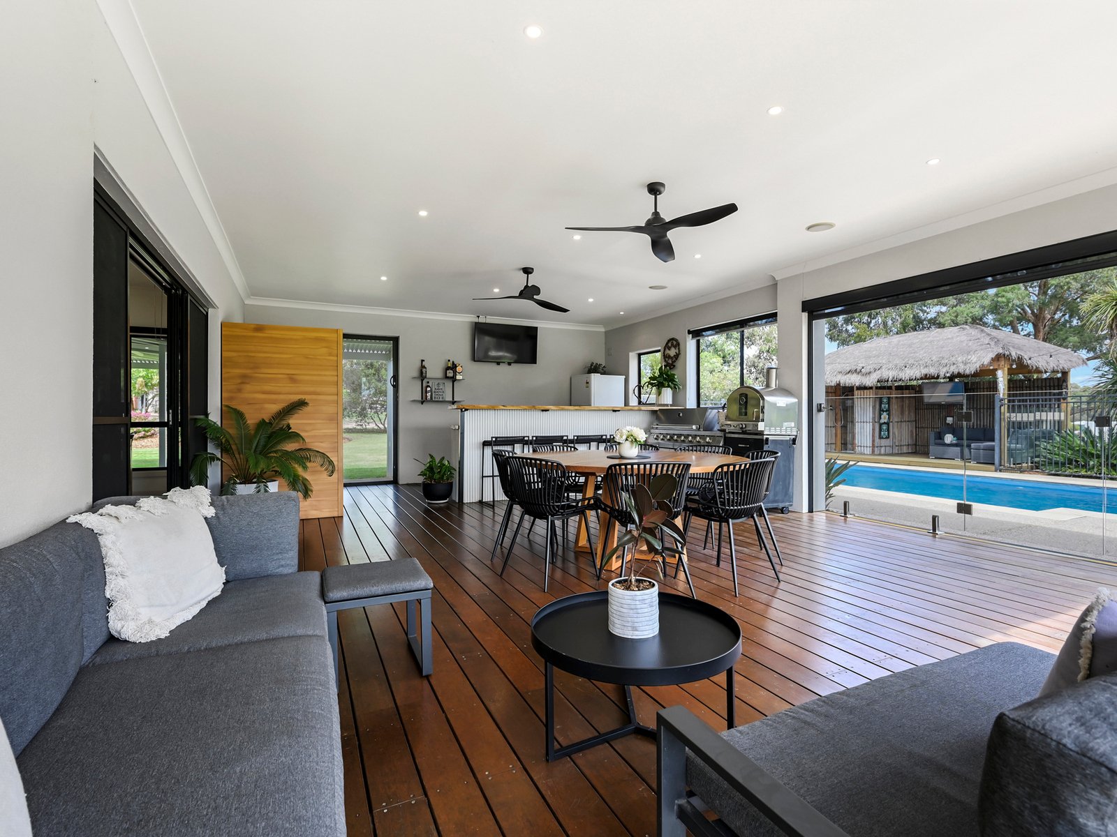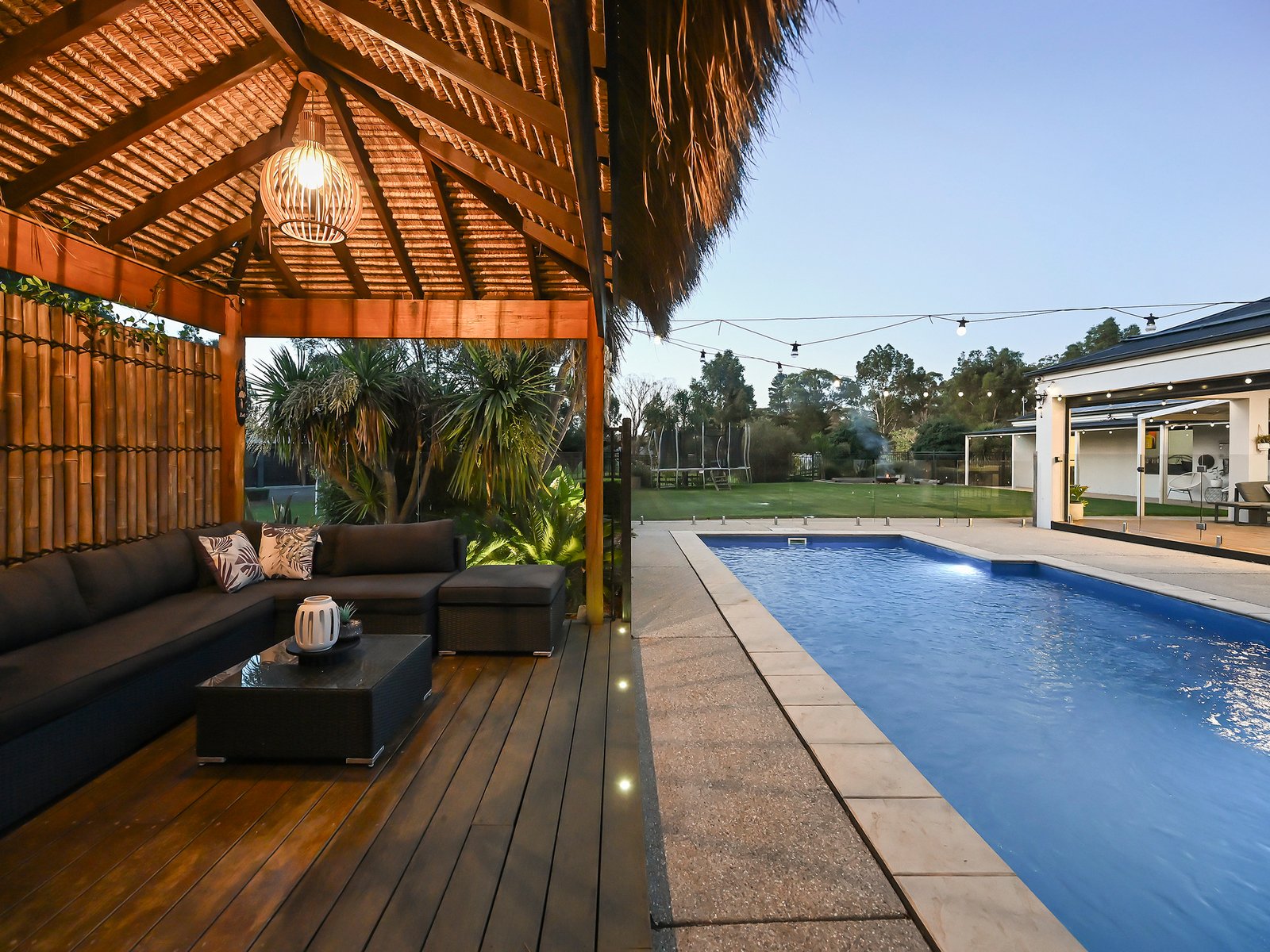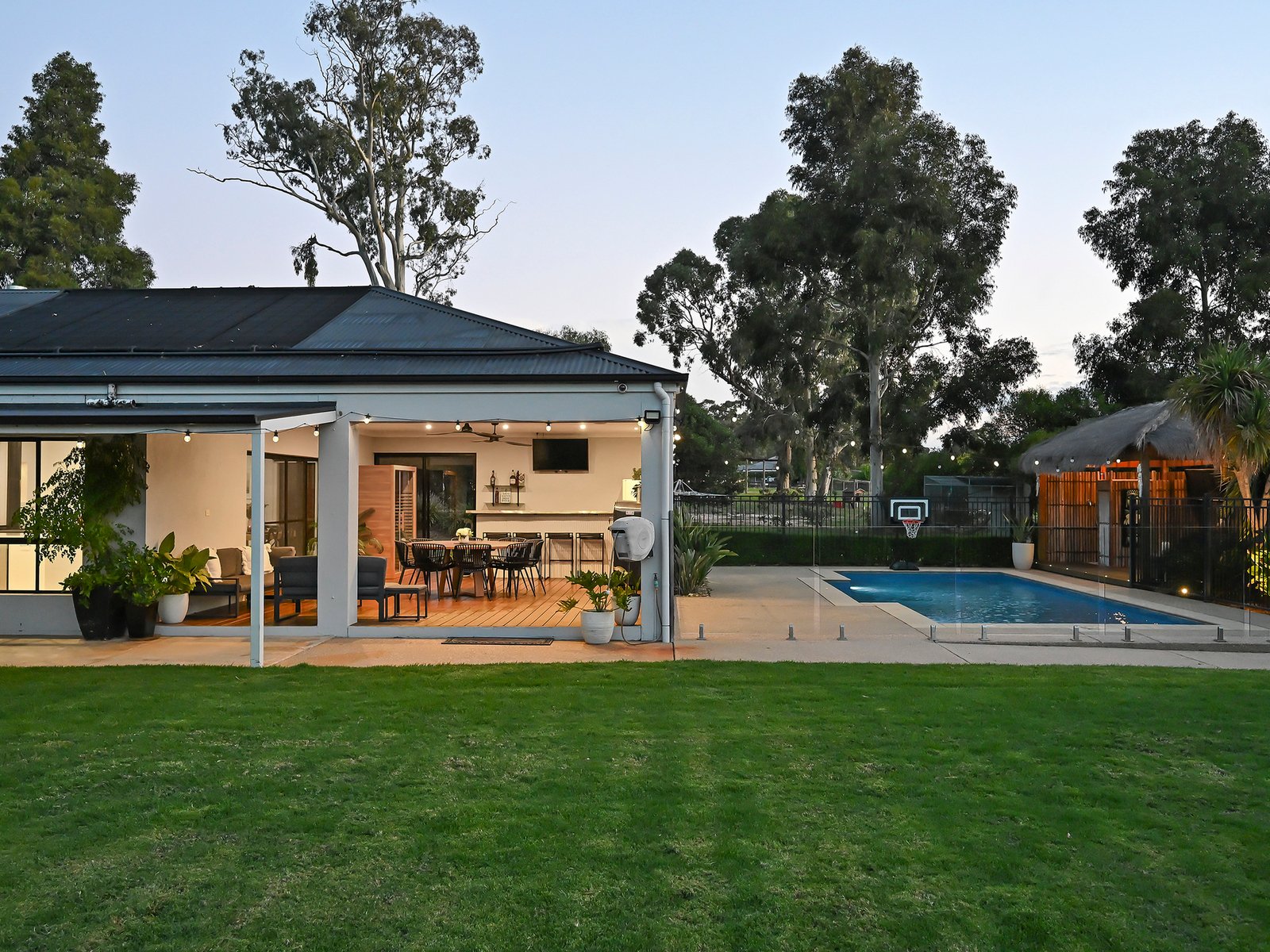 Outdoor infrastructure is ready for the ultimate family existence with a covered alfresco deck including a built-in bar and gas barbecue overlooking the sparkling 9m solar-heated pool. A Balinese-style hut provides shade, a shower and a toilet for pool patrons.
