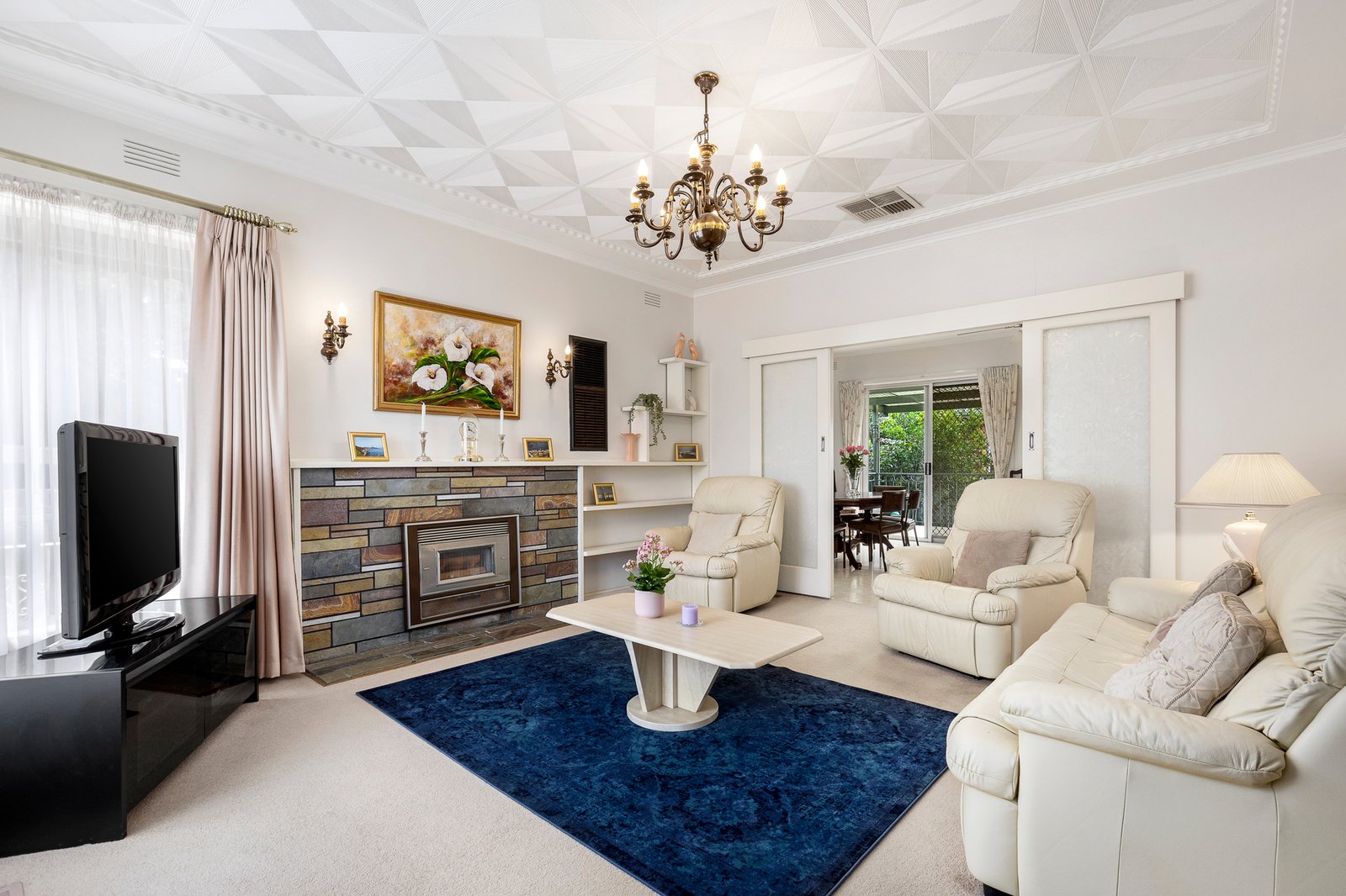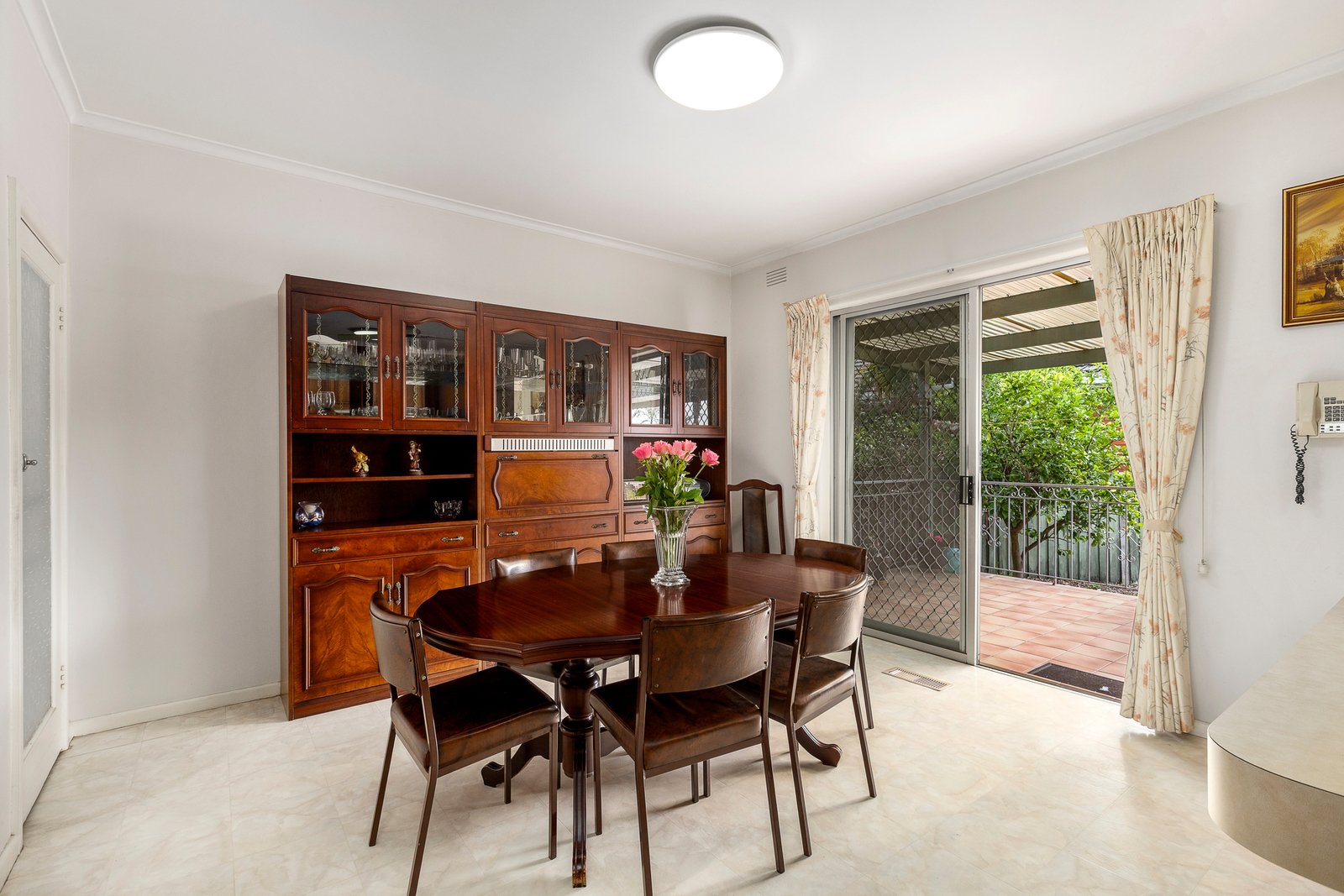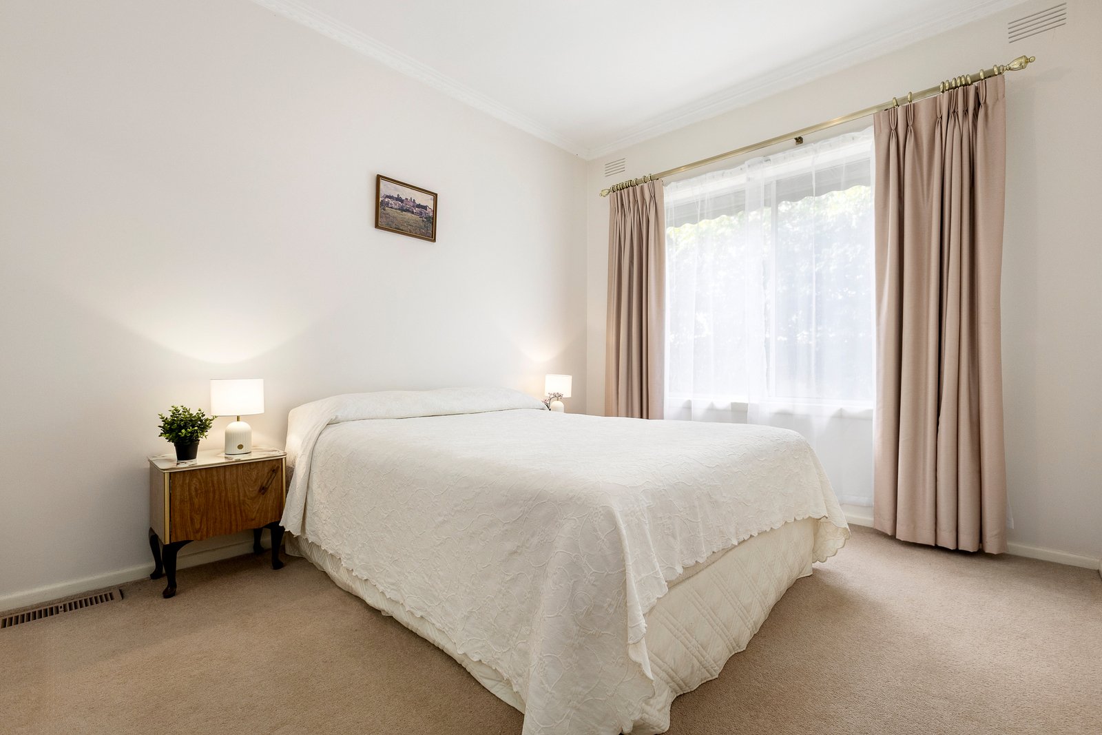 A broad hallway leads to three generous robed bedrooms, with the main bedroom offering a full wall of mirrored robes and a peaceful garden outlook. The pristine bathroom includes a bath and separate WC, paired with a huge laundry and ducted heating and cooling to ensure all-season comfort and ease.