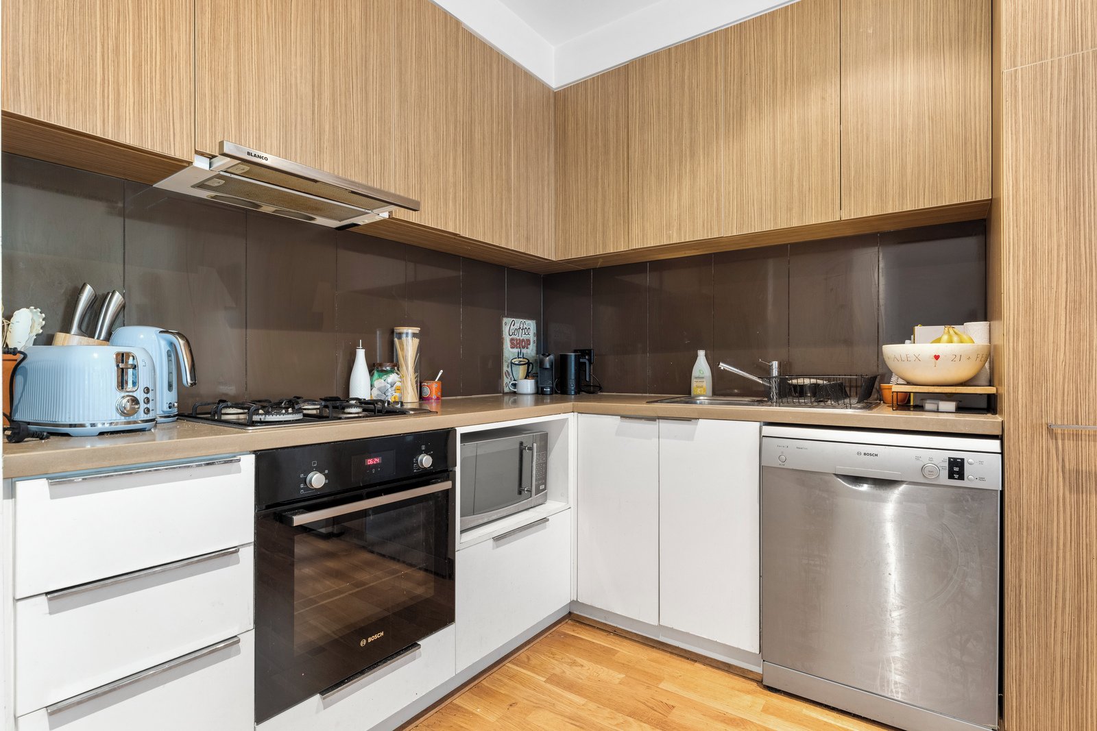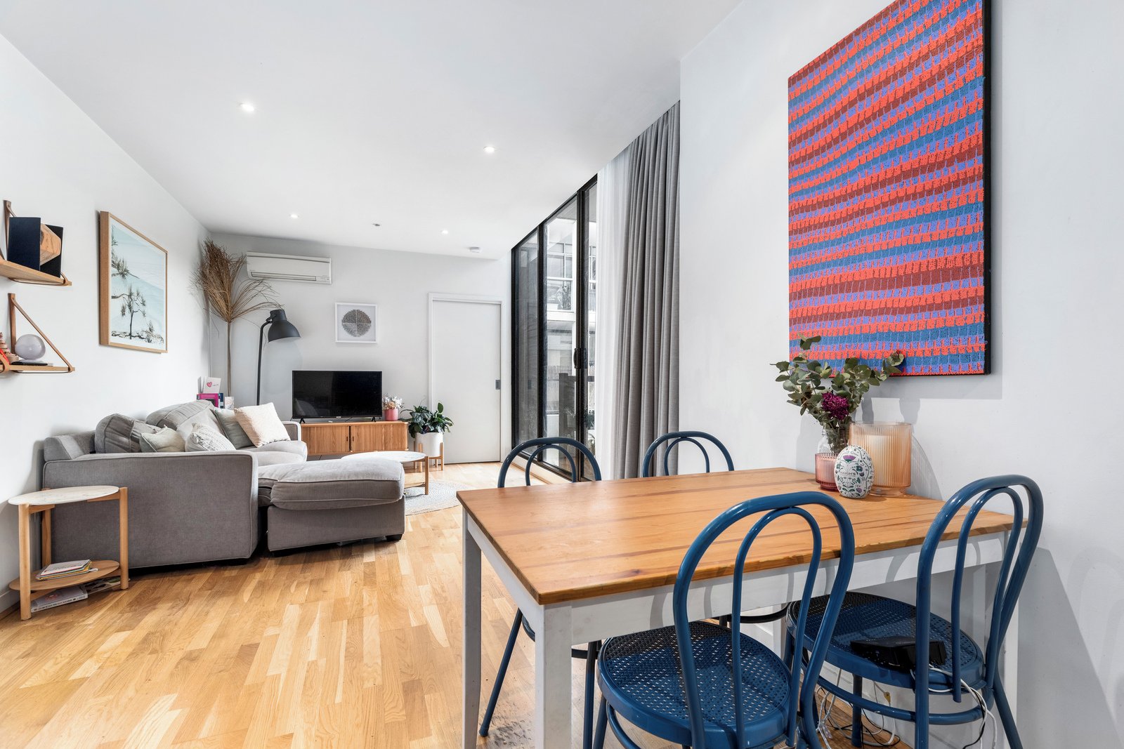 Securely accessed via intercom entry and lift, the home opens to polished timber flooring and a light-filled, open-plan design. The generous living and dining domain flows seamlessly onto a large alfresco terrace—ideal for relaxed entertaining or unwinding in the sun. A contemporary L-shaped kitchen is well-appointed with stainless steel appliances, including gas cooking and dishwasher, complemented by excellent storage throughout.