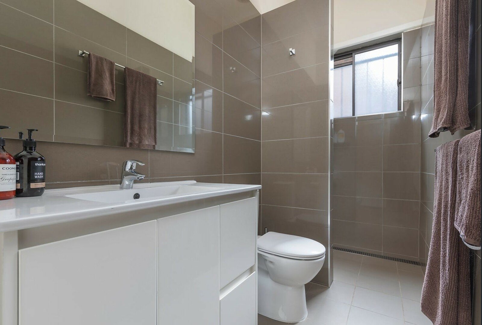 • Stylish modern bathroom with walk-in shower