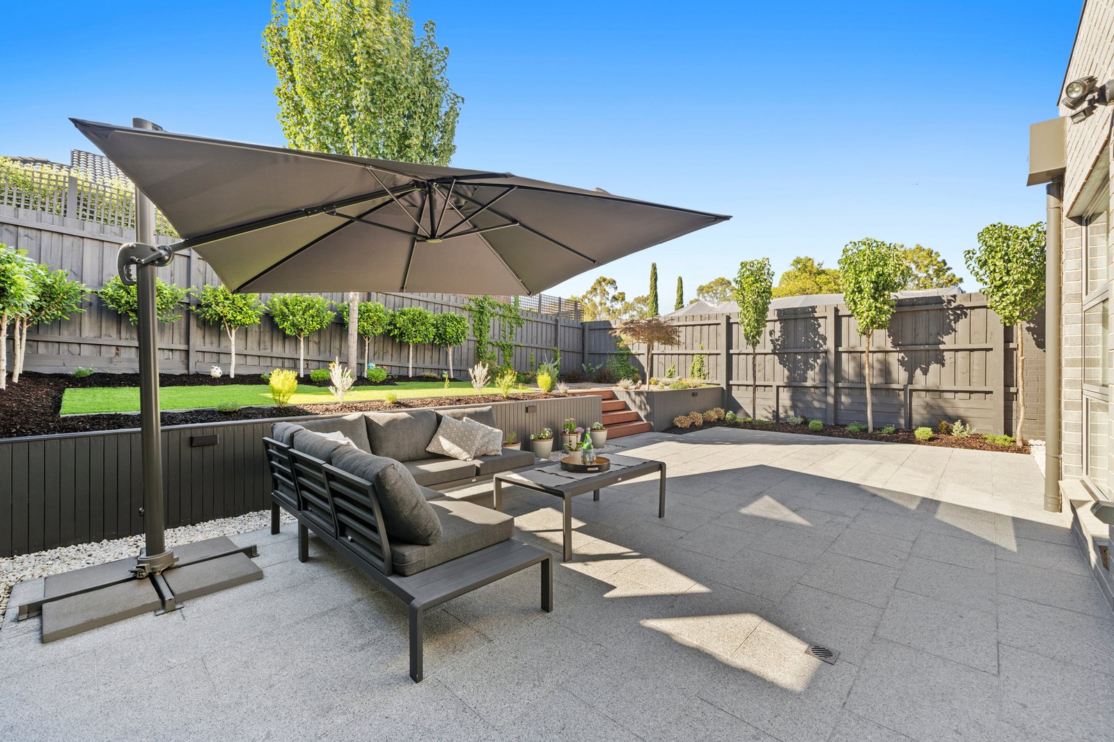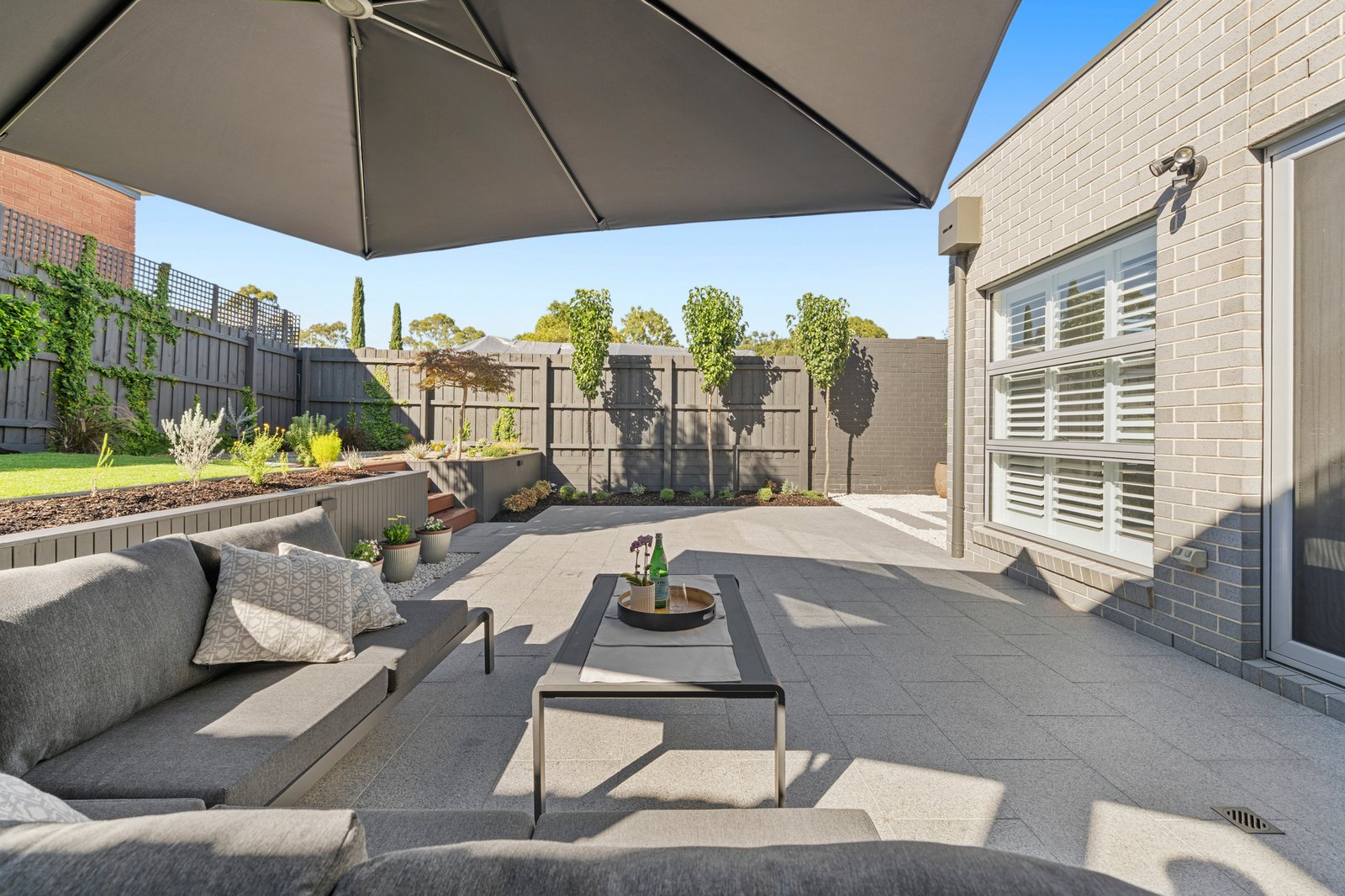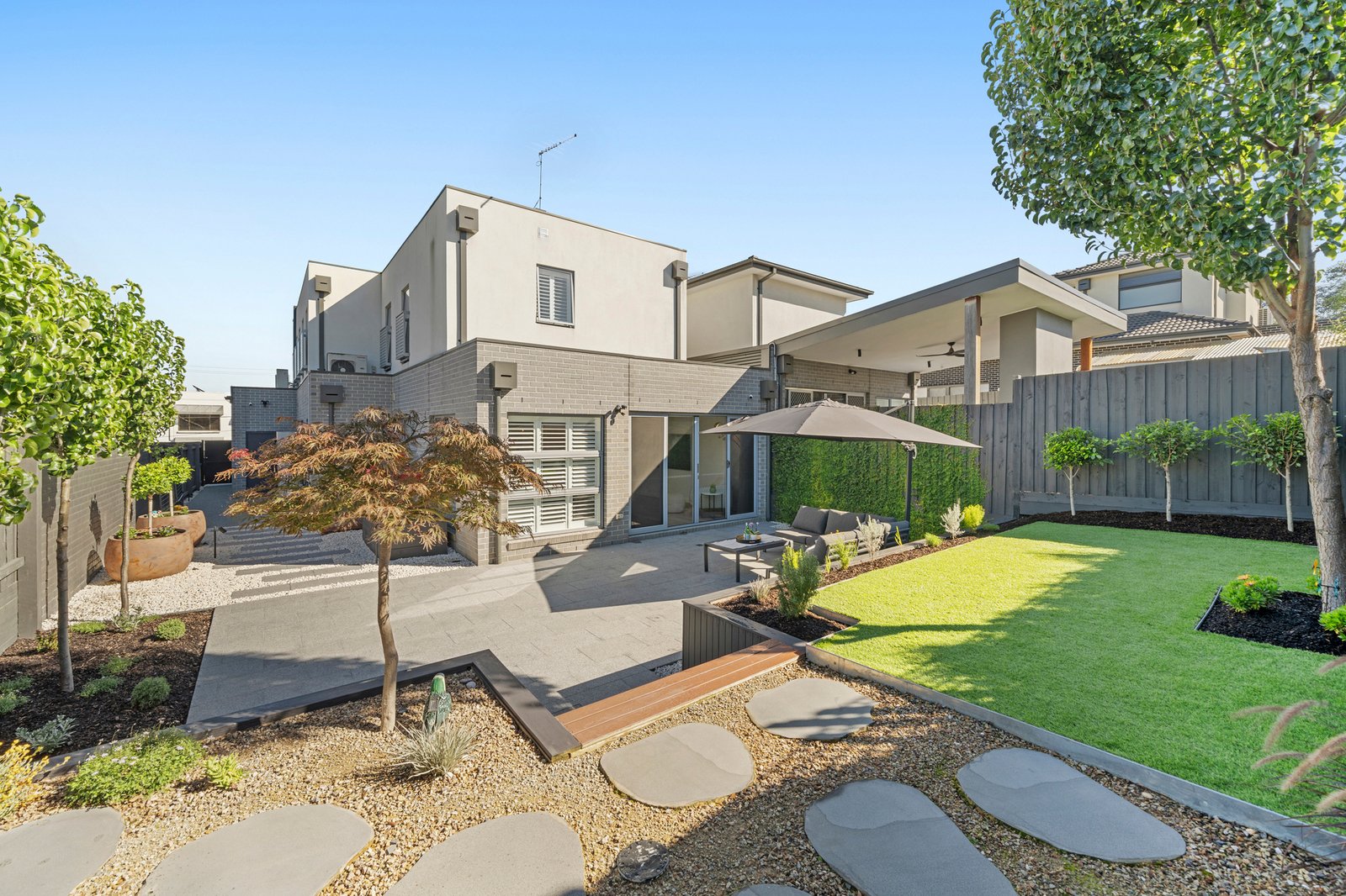 Outdoors, the property offers a beautifully landscaped, multi zone setting designed for entertaining and relaxation. A large format stone alfresco patio connects directly to the living spaces. Tiered garden zones feature manicured lawn, established plantings including Japanese maples and ornamental pears, and a cohesive charcoal fencing palette that enhances the overall architectural feel. The front and rear landscapes have been thoughtfully designed for low maintenance living, incorporating indigenous plantings, an upgraded nature strip and an exposed aggregate driveway with increased capacity for two vehicles, all complemented by carefully considered external lighting.