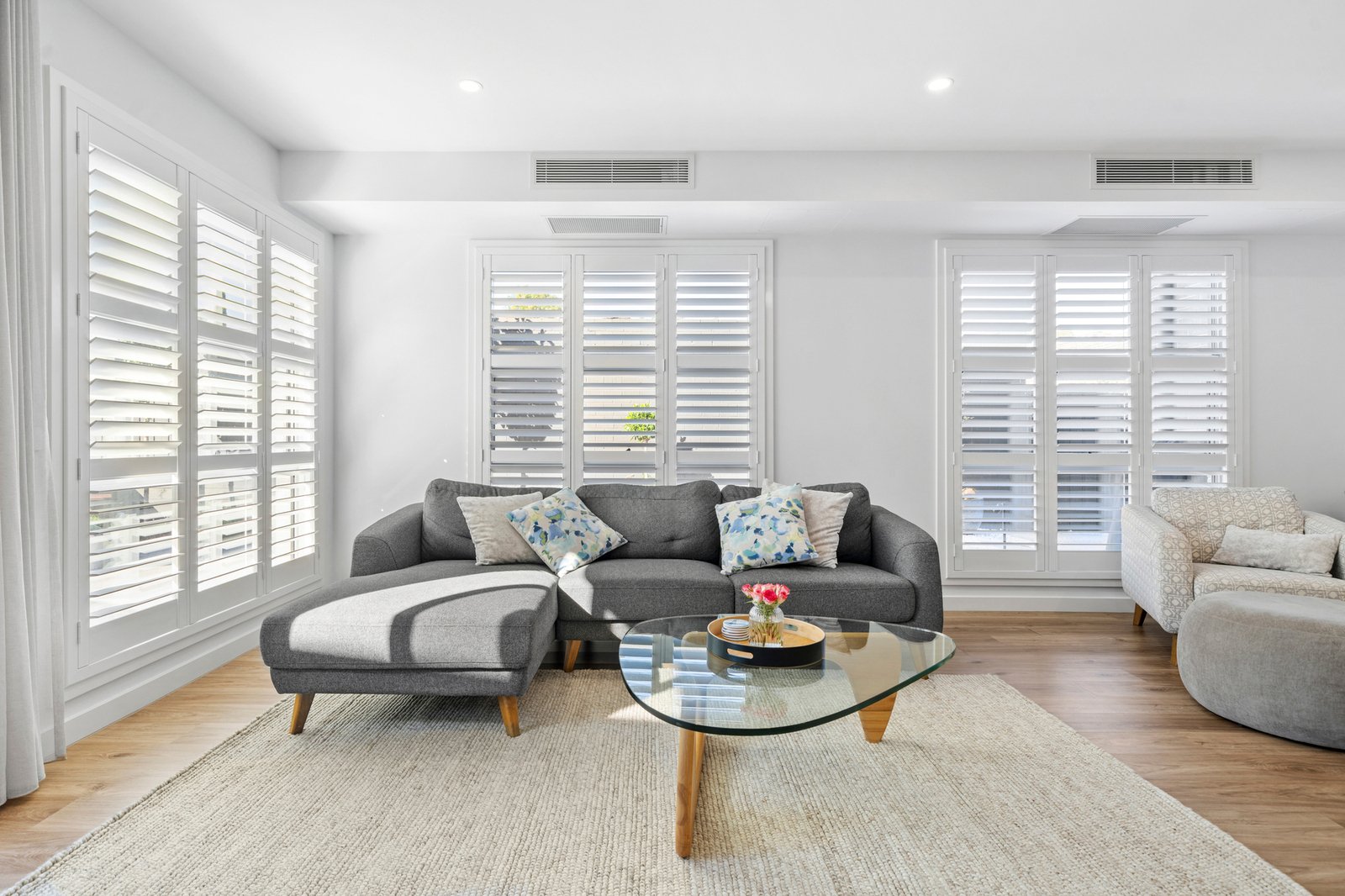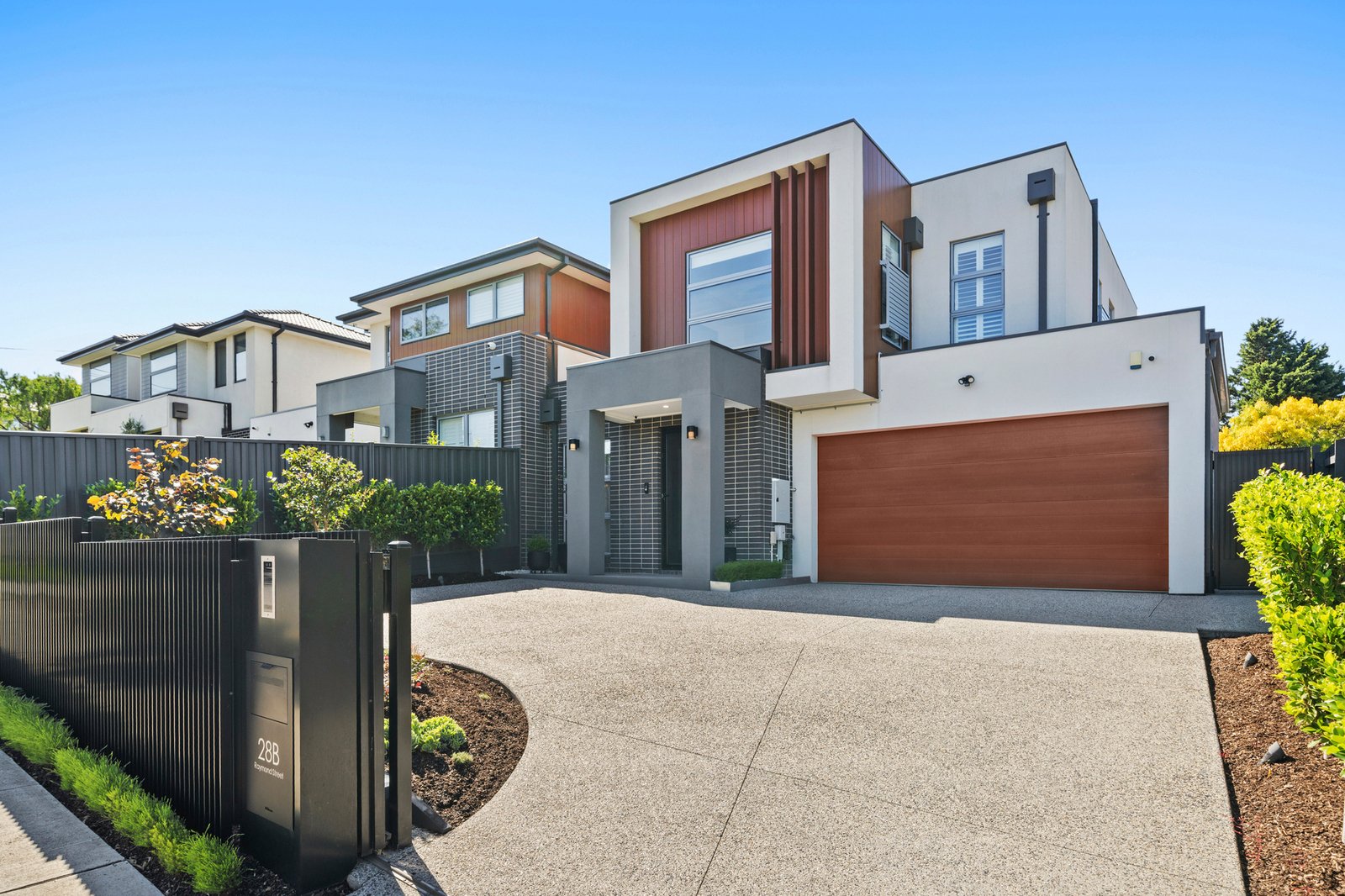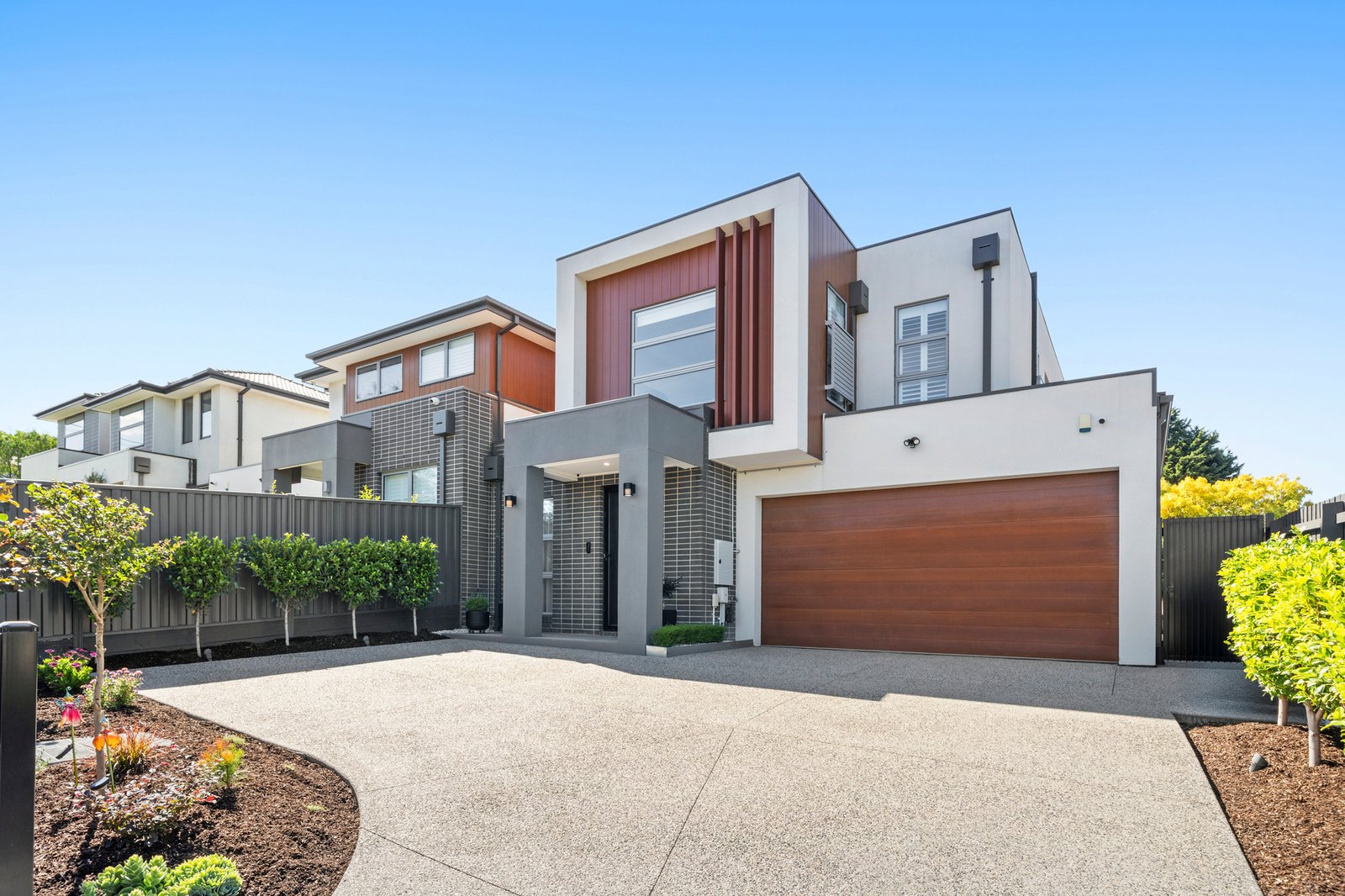 Outdoors, the property offers a beautifully landscaped, multi zone setting designed for entertaining and relaxation. A large format stone alfresco patio connects directly to the living spaces. Tiered garden zones feature manicured lawn, established plantings including Japanese maples and ornamental pears, and a cohesive charcoal fencing palette that enhances the overall architectural feel. The front and rear landscapes have been thoughtfully designed for low maintenance living, incorporating indigenous plantings, an upgraded nature strip and an exposed aggregate driveway with increased capacity for two vehicles, all complemented by carefully considered external lighting.
