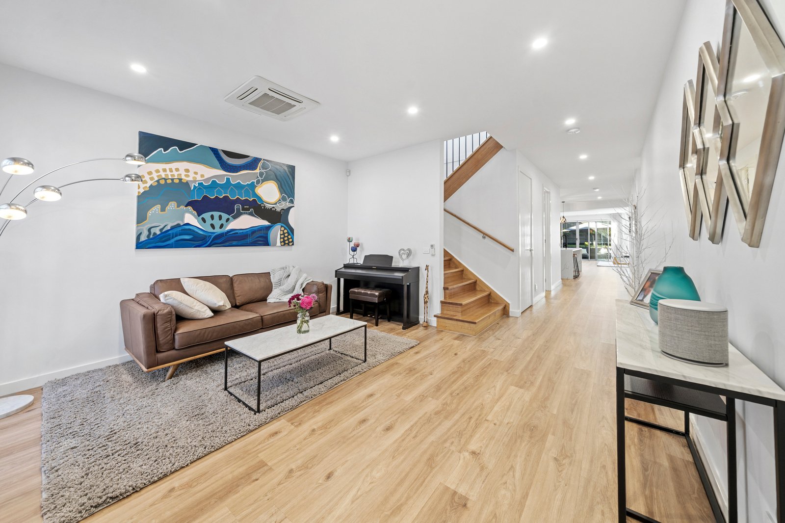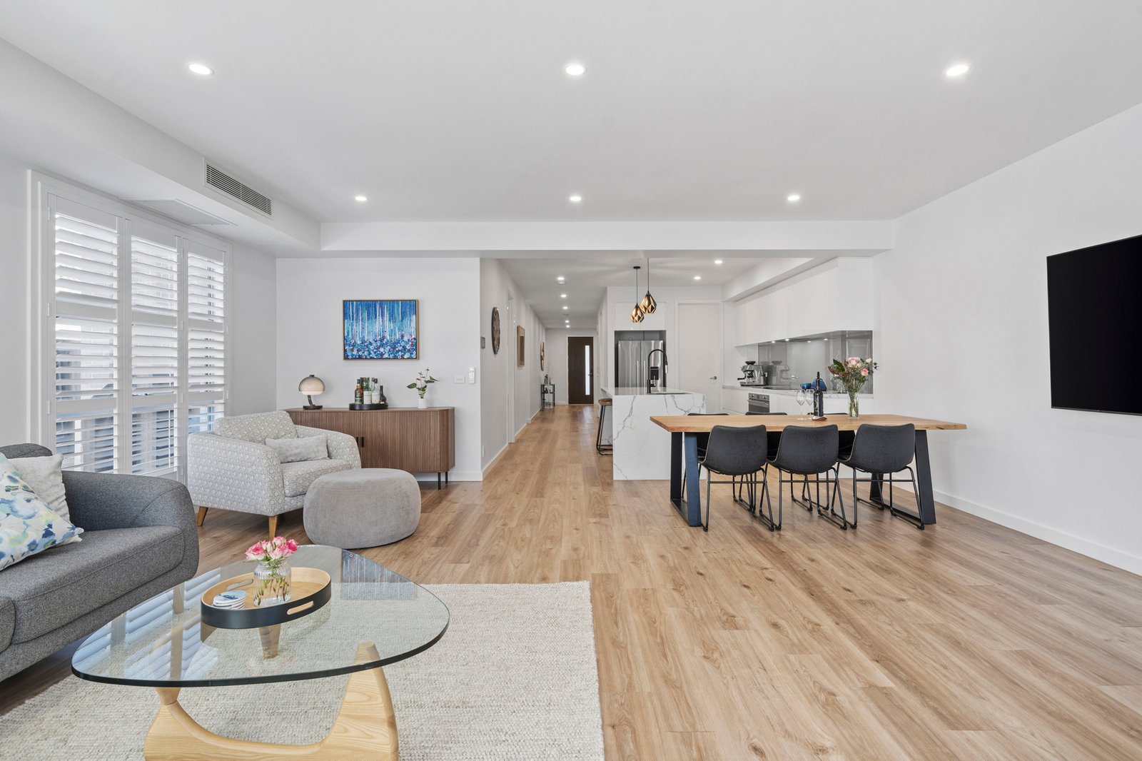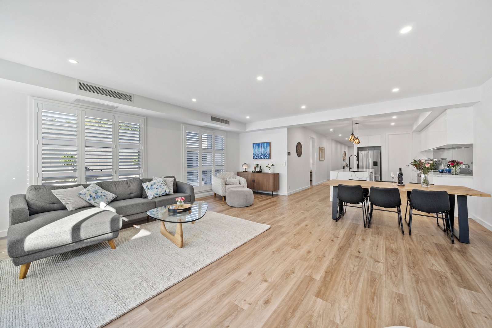 Privately set and thoughtfully designed across two expansive levels, this contemporary Ashwood residence delivers refined family living with a focus on space, light and seamless indoor outdoor connection. The ground floor unfolds into an expansive open plan living and dining domain, enhanced by warm engineered timber flooring, full height plantation shutters and LED downlighting throughout. Ducted reverse cycle heating and cooling and split systems ensure year round comfort. A separate formal sitting room adds flexibility, complemented by an upstairs retreat offering a relaxed secondary living zone.