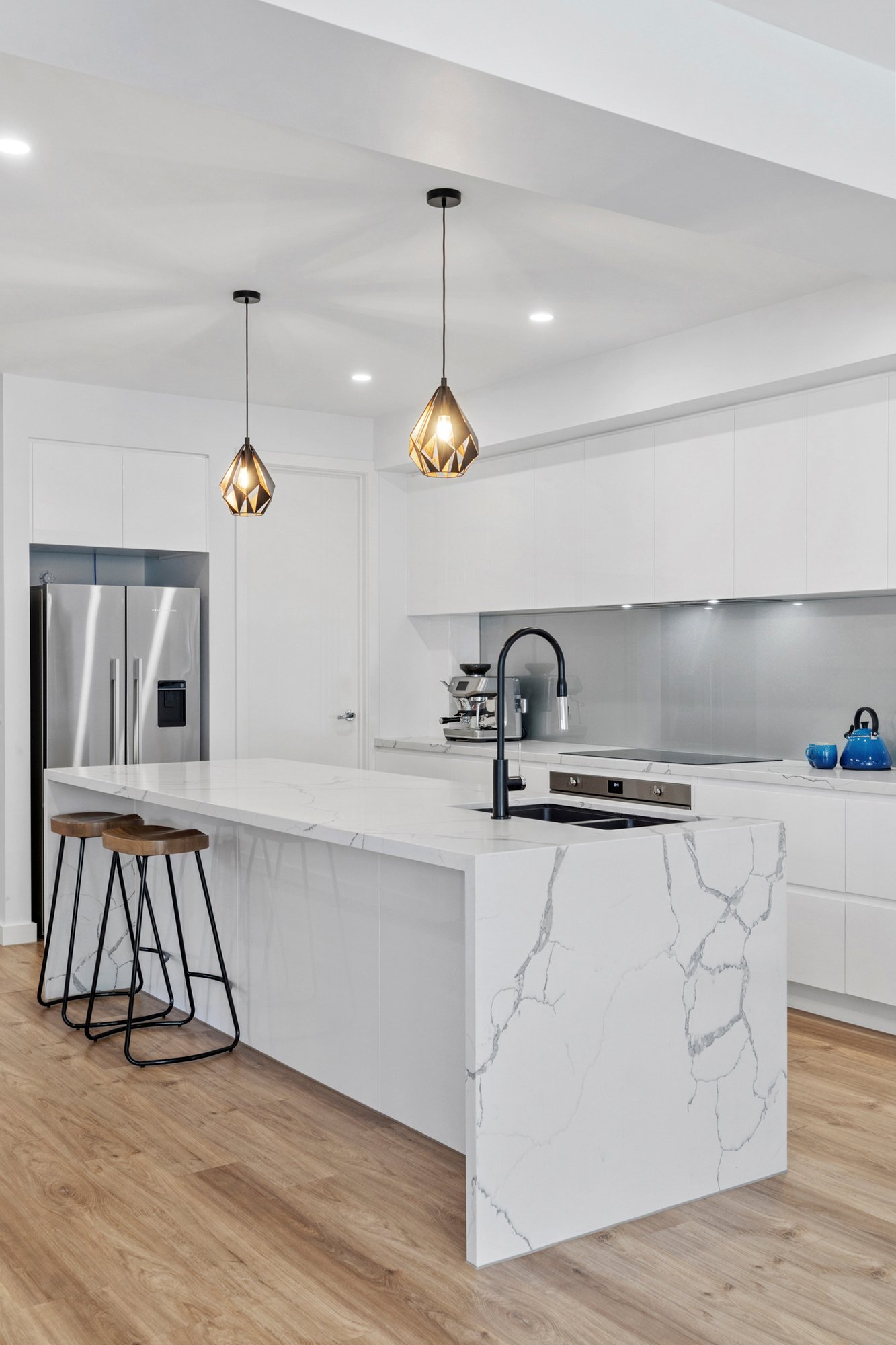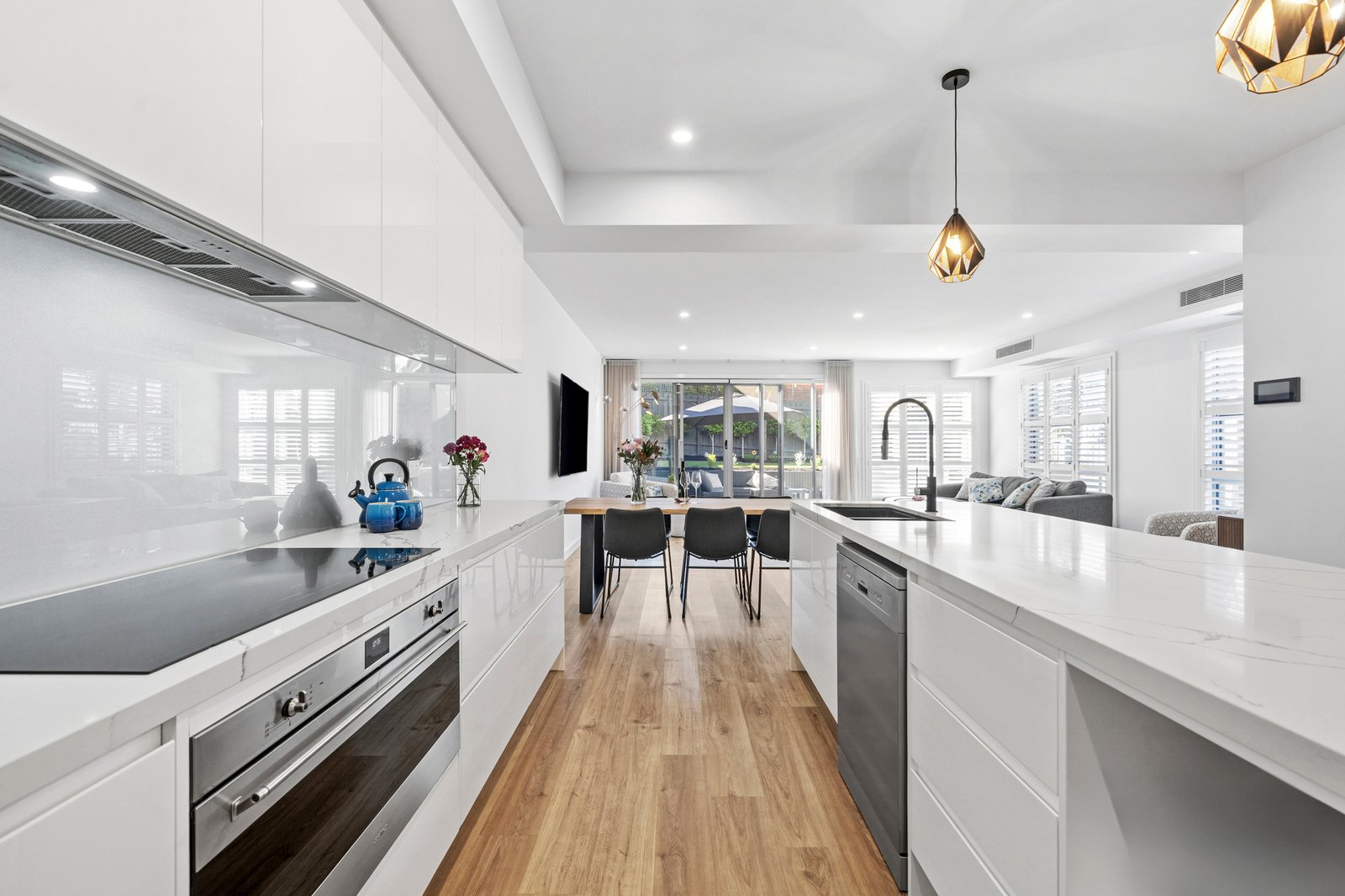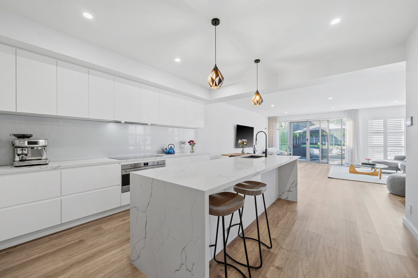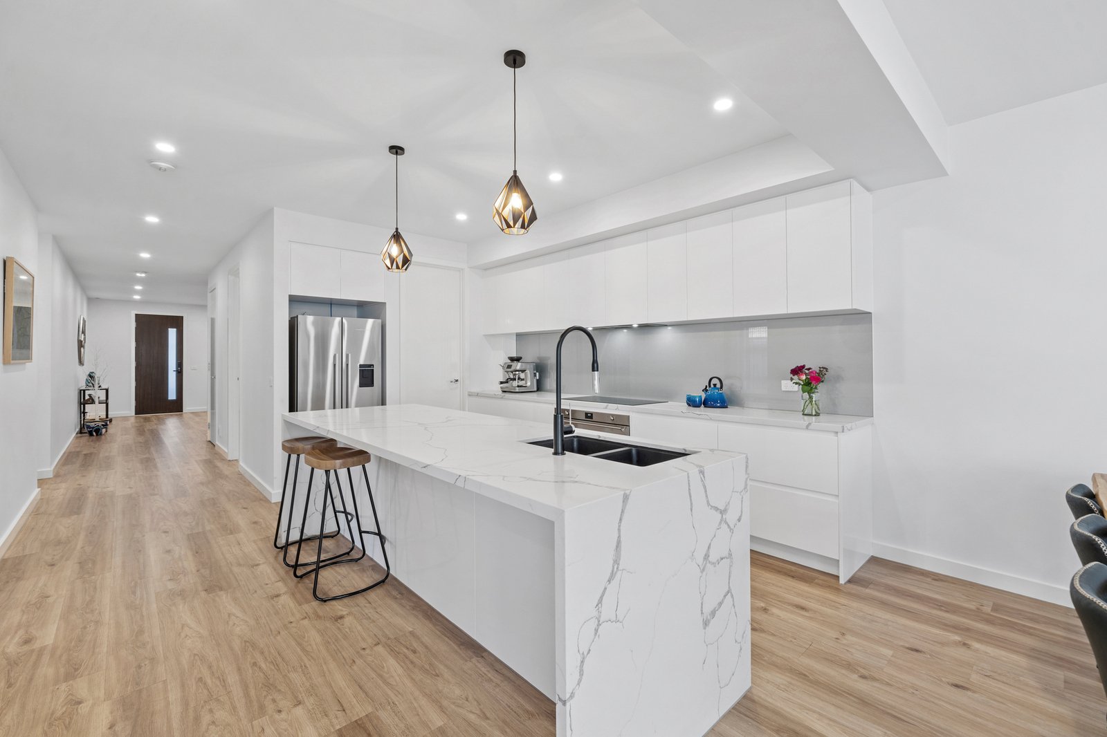 The kitchen is a true centrepiece, combining a clean design with everyday functionality. Gloss white cabinetry extends to ceiling height, paired with a substantial island bench in Calacatta style engineered stone with waterfall edge. Premium inclusions feature an induction cooktop, under bench electric oven, integrated dishwasher and a plumbed stainless steel French door fridge. A sage grey glass splashback and matte black fixtures complete the palette, while pendant lighting and bar seating enhance both usability and visual appeal. Open sightlines connect the kitchen seamlessly through to the dining, living and outdoor zones.