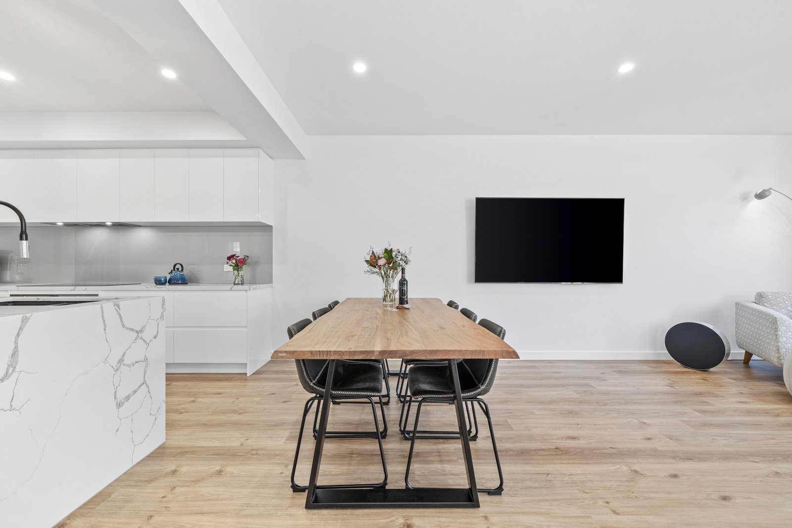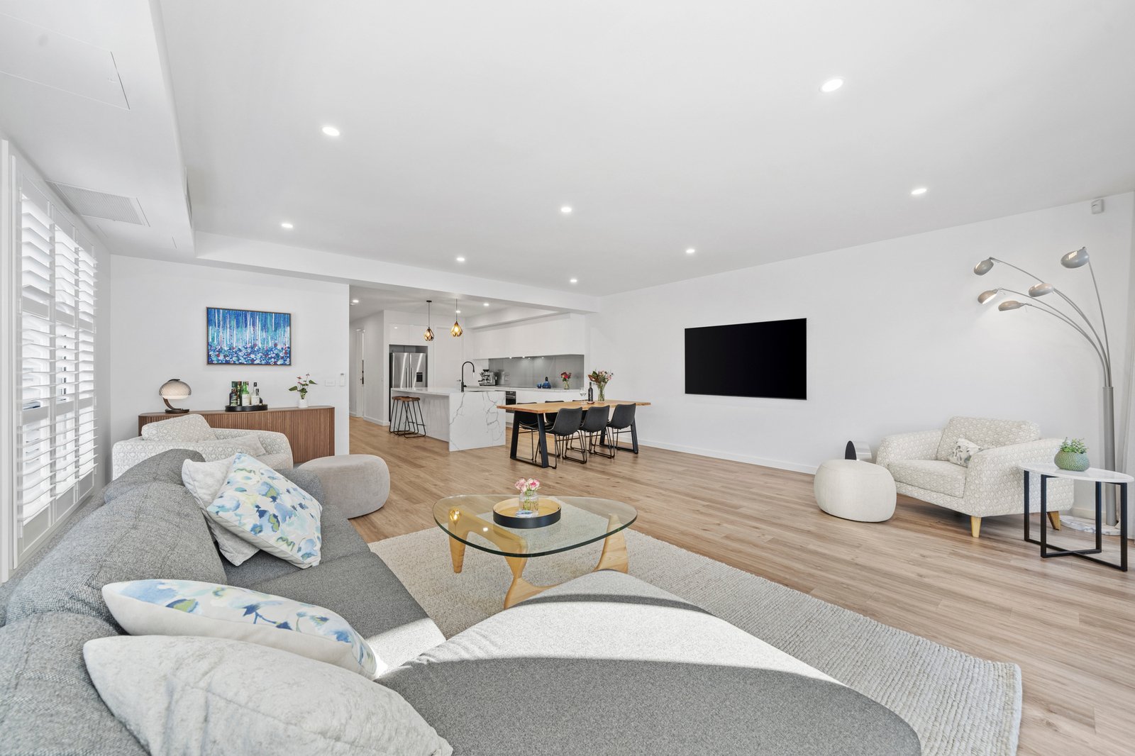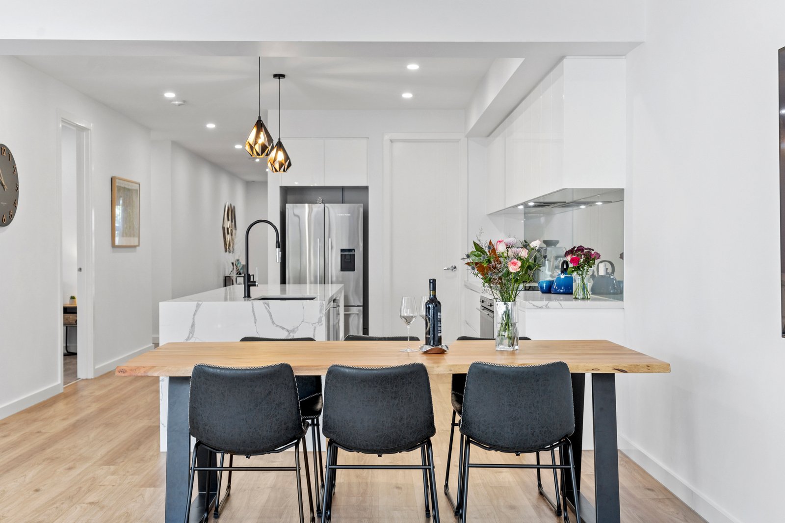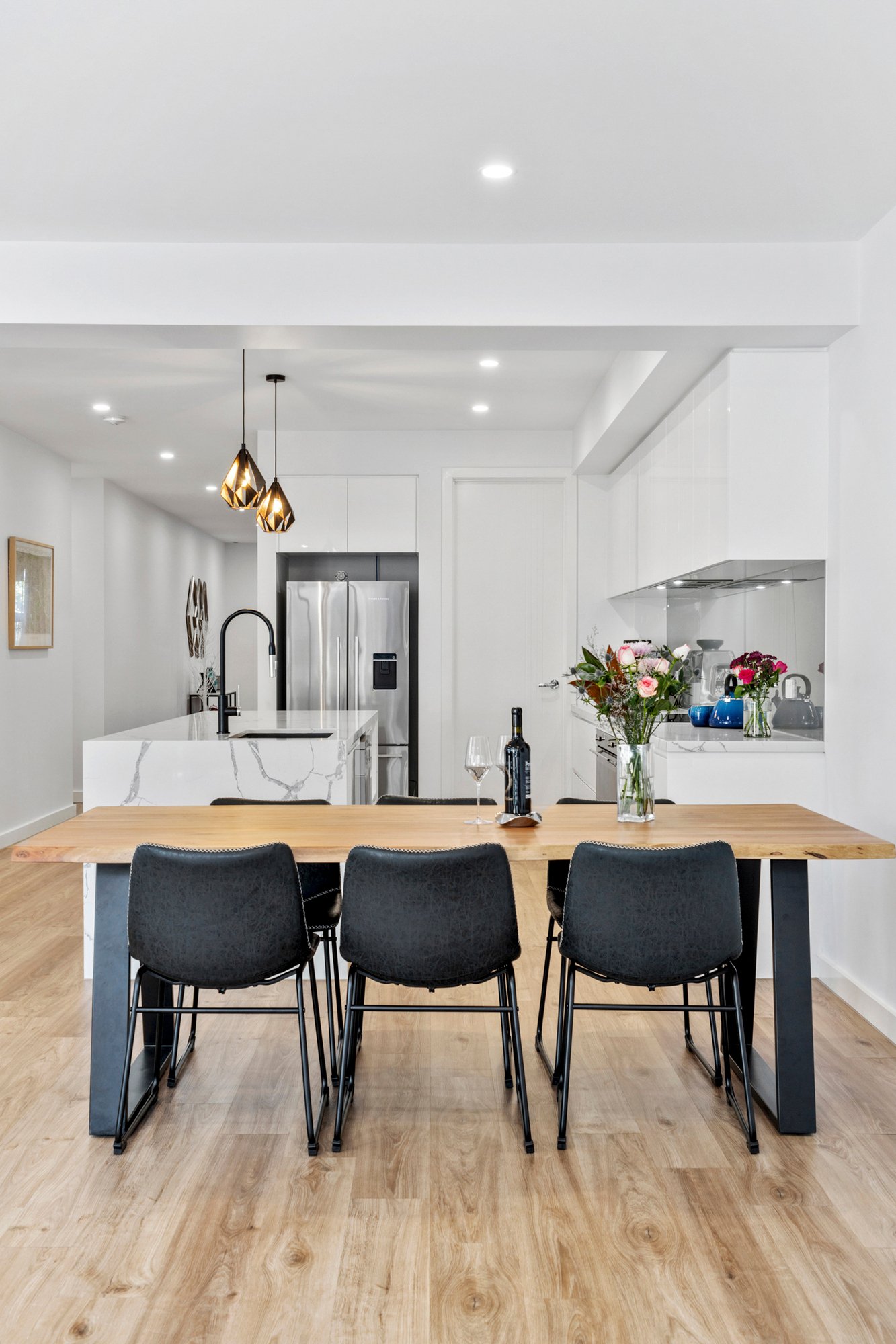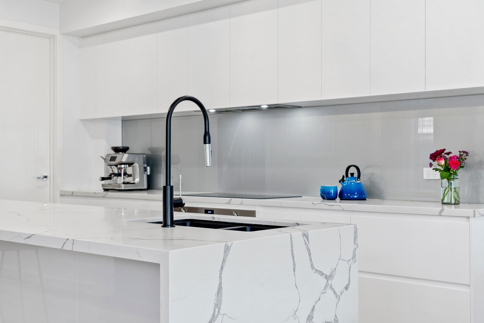 The kitchen is a true centrepiece, combining a clean design with everyday functionality. Gloss white cabinetry extends to ceiling height, paired with a substantial island bench in Calacatta style engineered stone with waterfall edge. Premium inclusions feature an induction cooktop, under bench electric oven, integrated dishwasher and a plumbed stainless steel French door fridge. A sage grey glass splashback and matte black fixtures complete the palette, while pendant lighting and bar seating enhance both usability and visual appeal. Open sightlines connect the kitchen seamlessly through to the dining, living and outdoor zones.