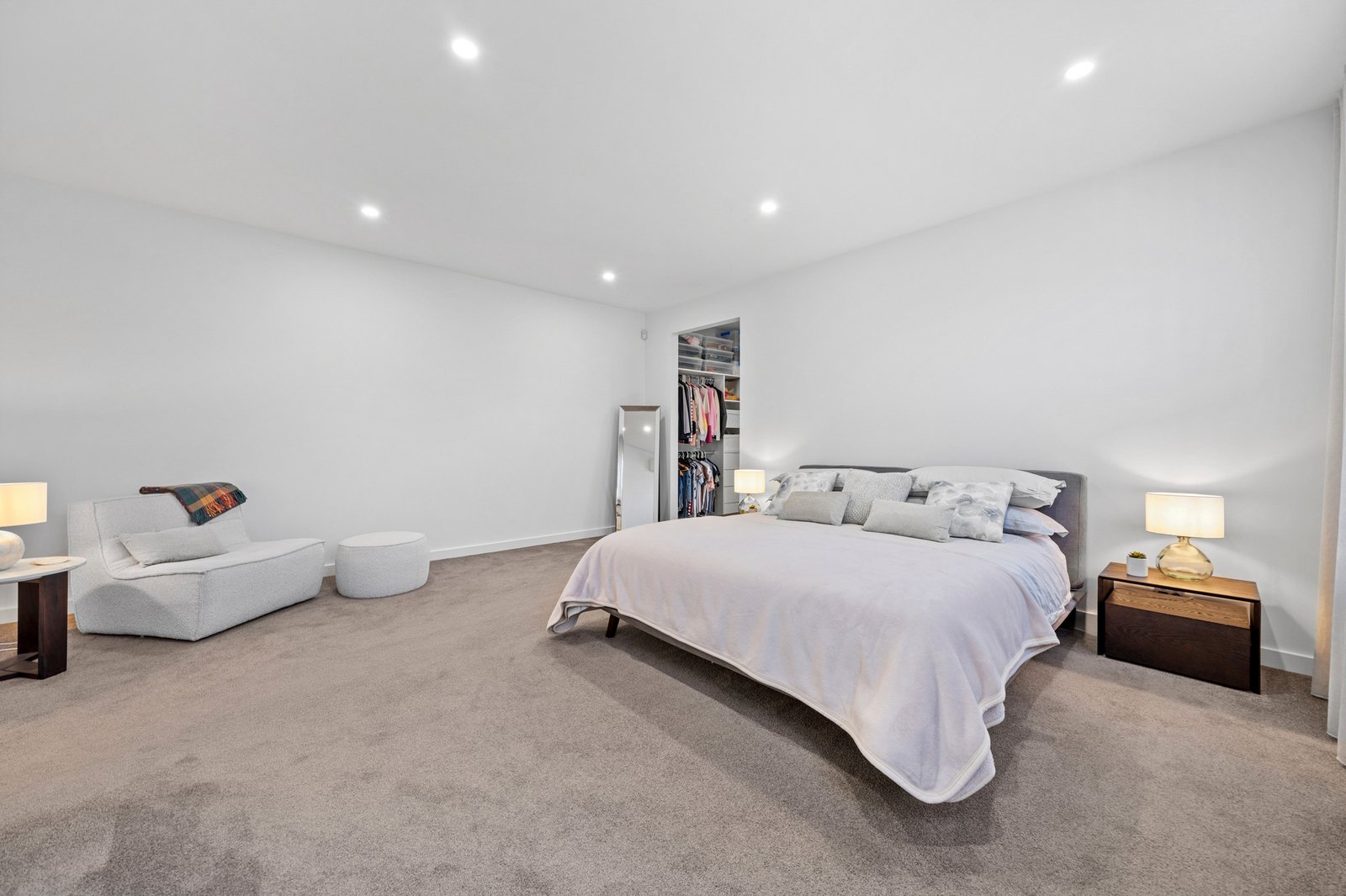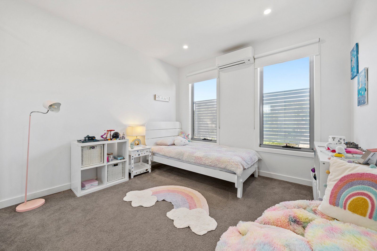 Accommodation comprises four well appointed bedrooms across both levels. The master is generously proportioned, complete with a walk in robe featuring custom shelving and drawers, along with layered window furnishings for added privacy. The remaining three bedrooms are well sized and versatile, each offering built in storage and flexibility to accommodate growing families or evolving lifestyle needs.
