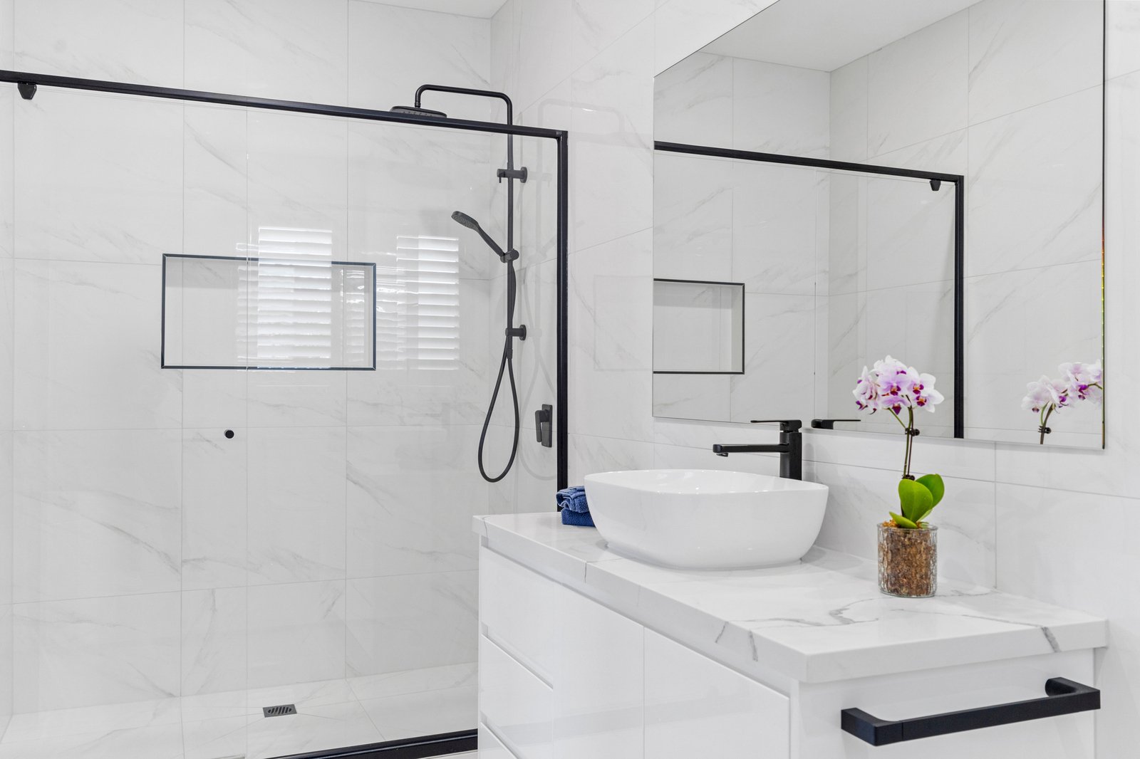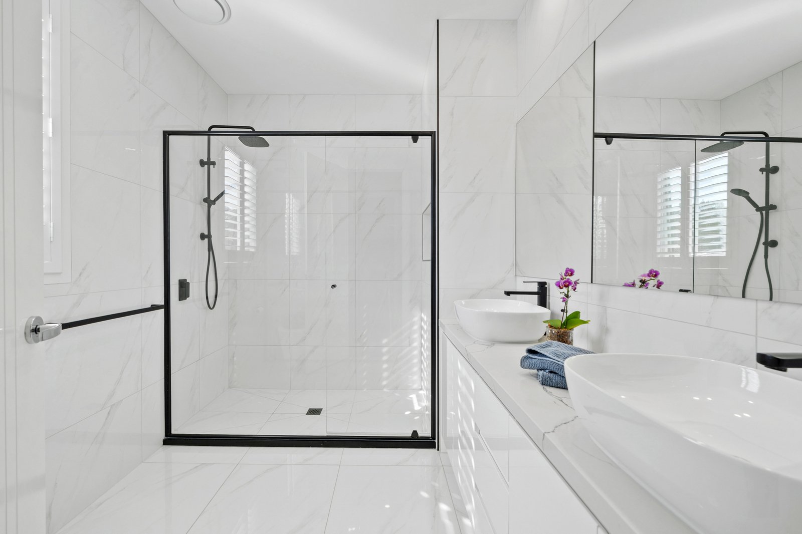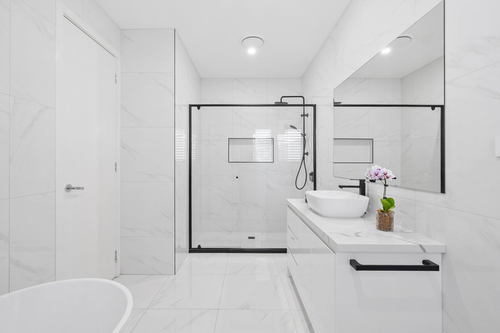 Three bathrooms are finished to a consistent high specification, showcasing floor to ceiling Calacatta marble look tiling, matte black tapware and refined detailing. The ensuite features a floating vanity with stone top, vessel basin and frameless shower, while the main bathroom includes a freestanding bathtub as a focal point. A third bathroom maintains the same level of finish, ensuring both style and functionality across the home.