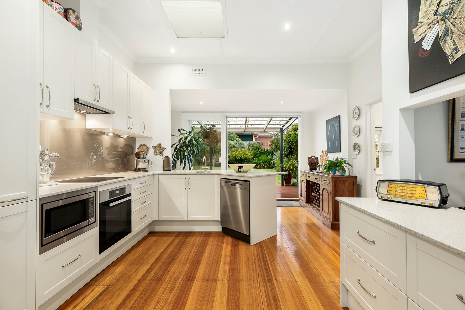 Enriched by hardwood floors and simply stunning decorative ceilings with the classic geometric motifs typical of the era, the layout is introduced by a distinct entrance hall with plate rails and handsome timber trim. Original double doors with delicate leadlight give way the cosy lounge with a roaring gas fire, while the separate dining zone features a hatch through to the contemporary all-electric kitchen boasting Miele appliances, stone benchtops and a relaxed breakfast bar.
