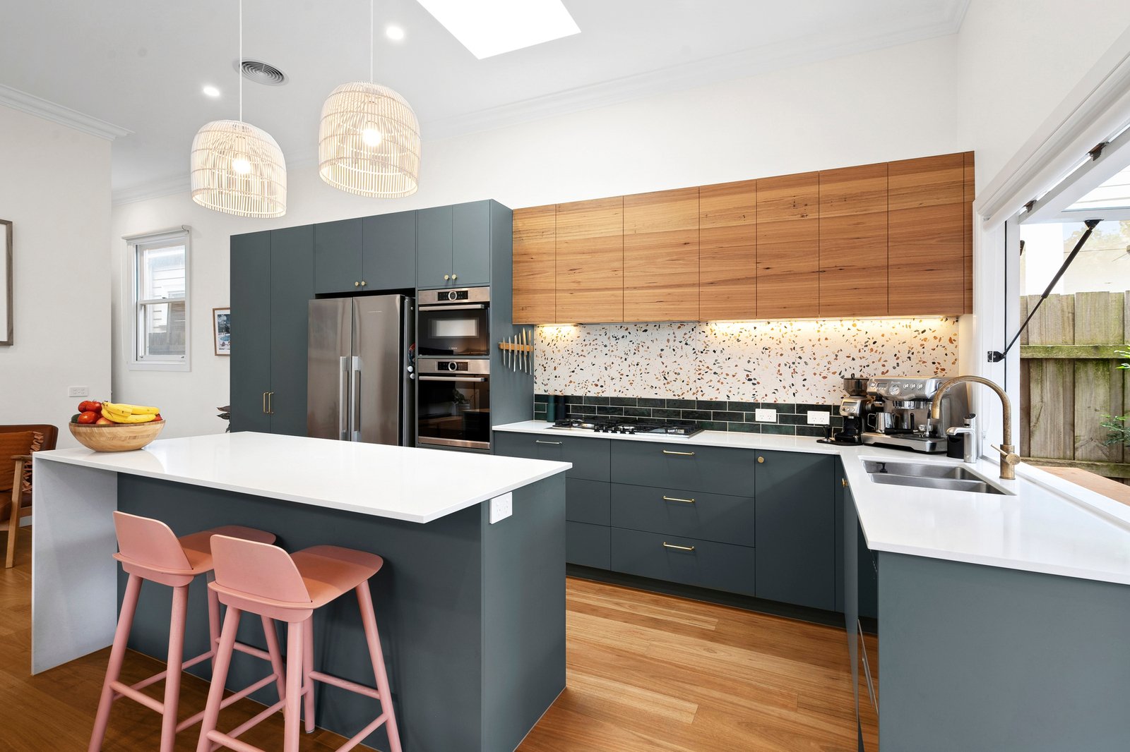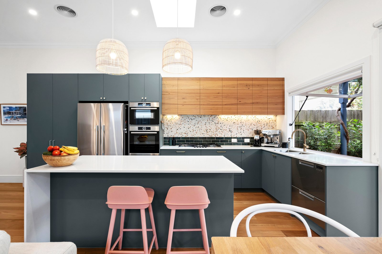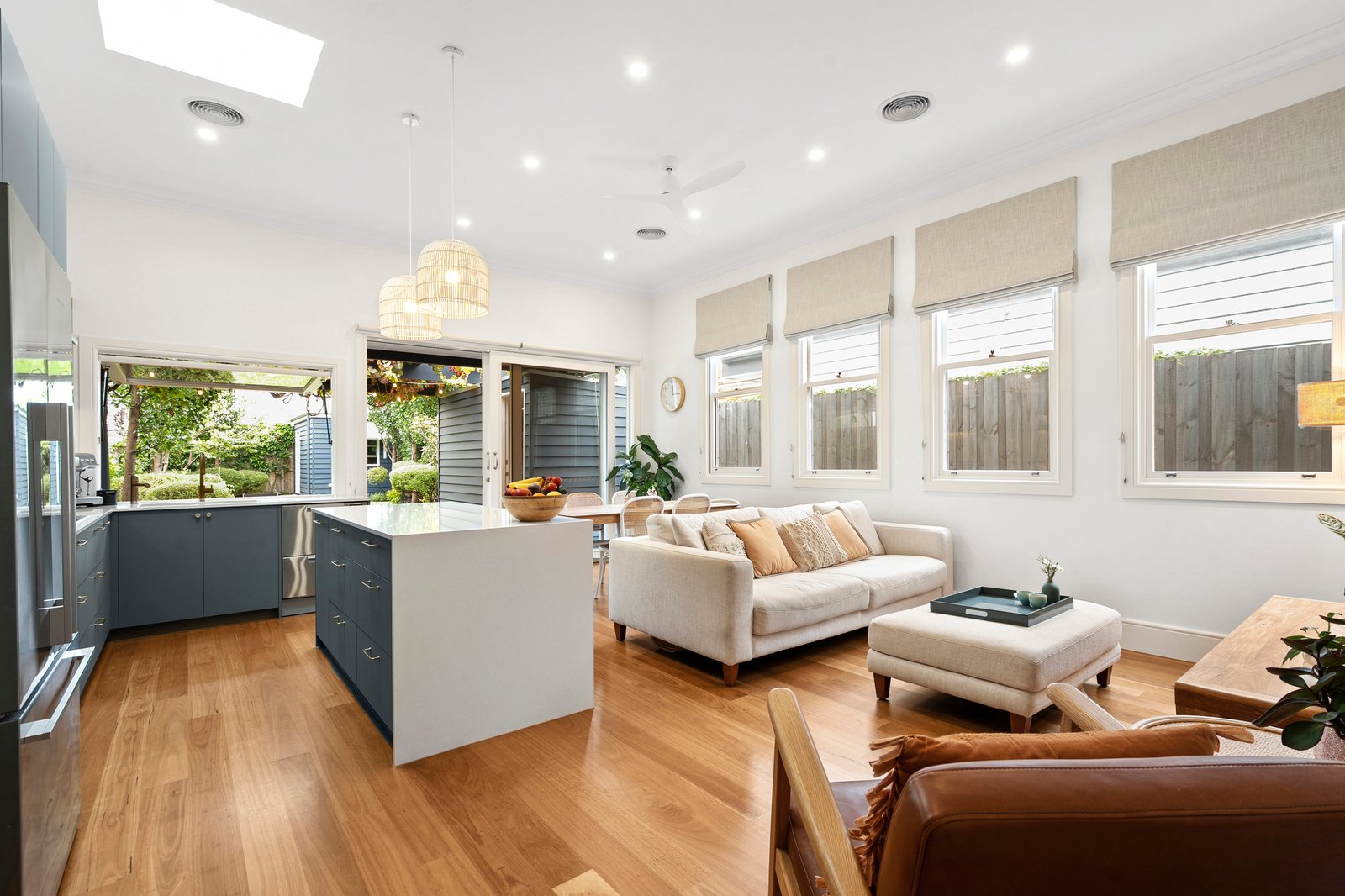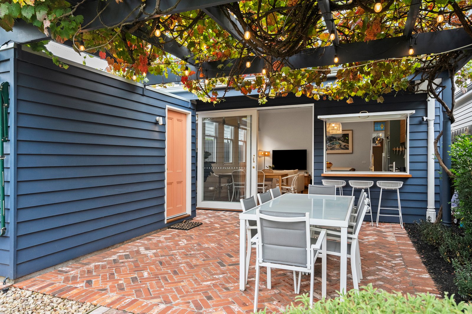 At the heart of the home, the kitchen is a standout. Appointed with high-end finishes, Bosch appliances, brass tapware, and a Zip tap with sparkling water on demand, it caters to both everyday living and entertaining. A unique servery window opens directly to an outdoor breakfast bar underneath a picturesque grapevine, making alfresco dining and entertaining effortless.