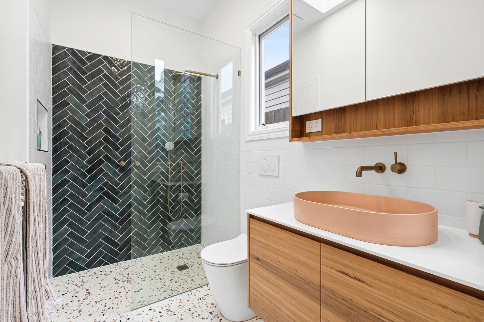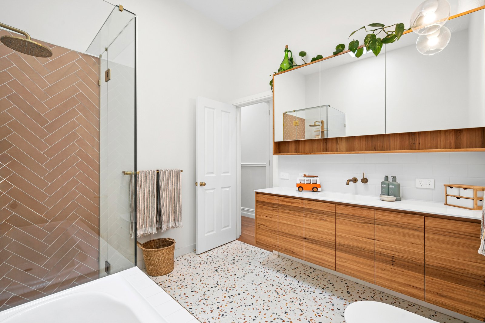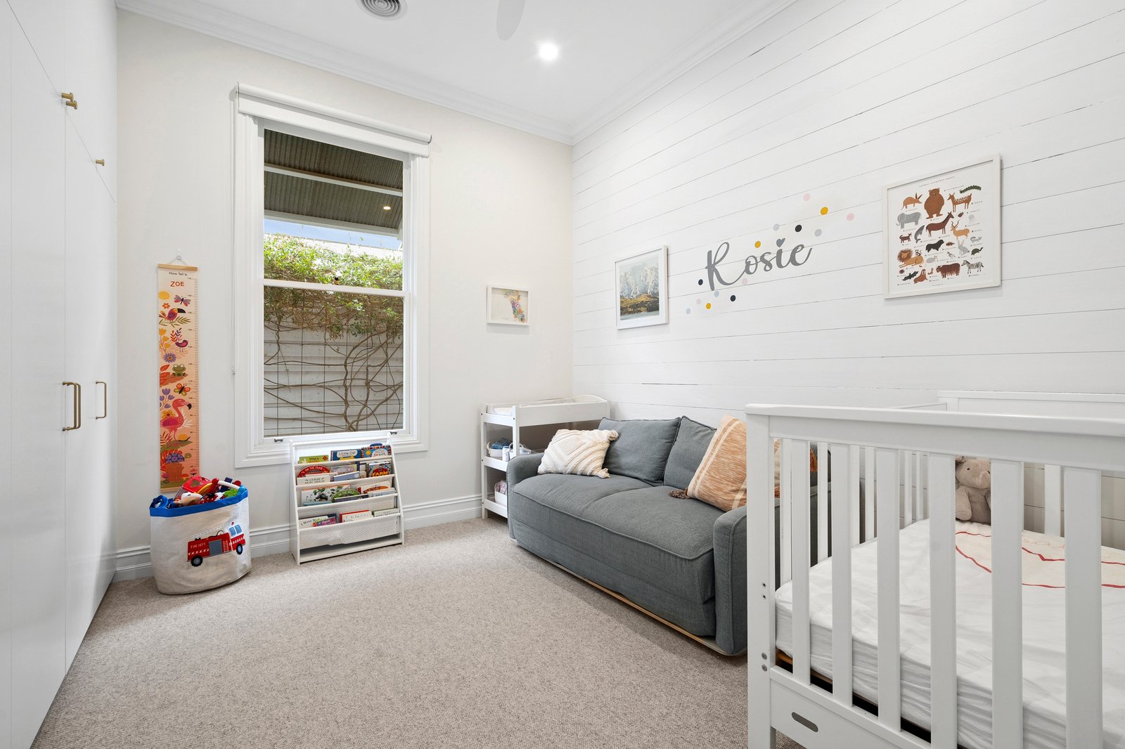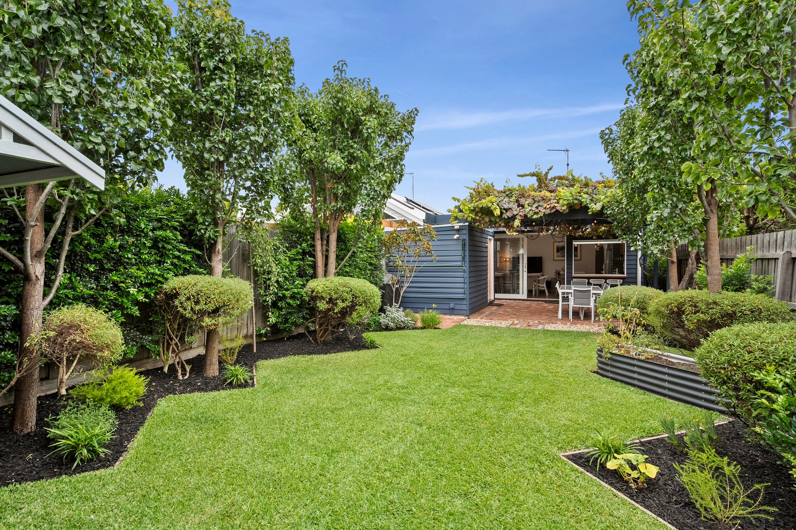 At the heart of the home, the kitchen is a standout. Appointed with high-end finishes, Bosch appliances, brass tapware, and a Zip tap with sparkling water on demand, it caters to both everyday living and entertaining. A unique servery window opens directly to an outdoor breakfast bar underneath a picturesque grapevine, making alfresco dining and entertaining effortless.