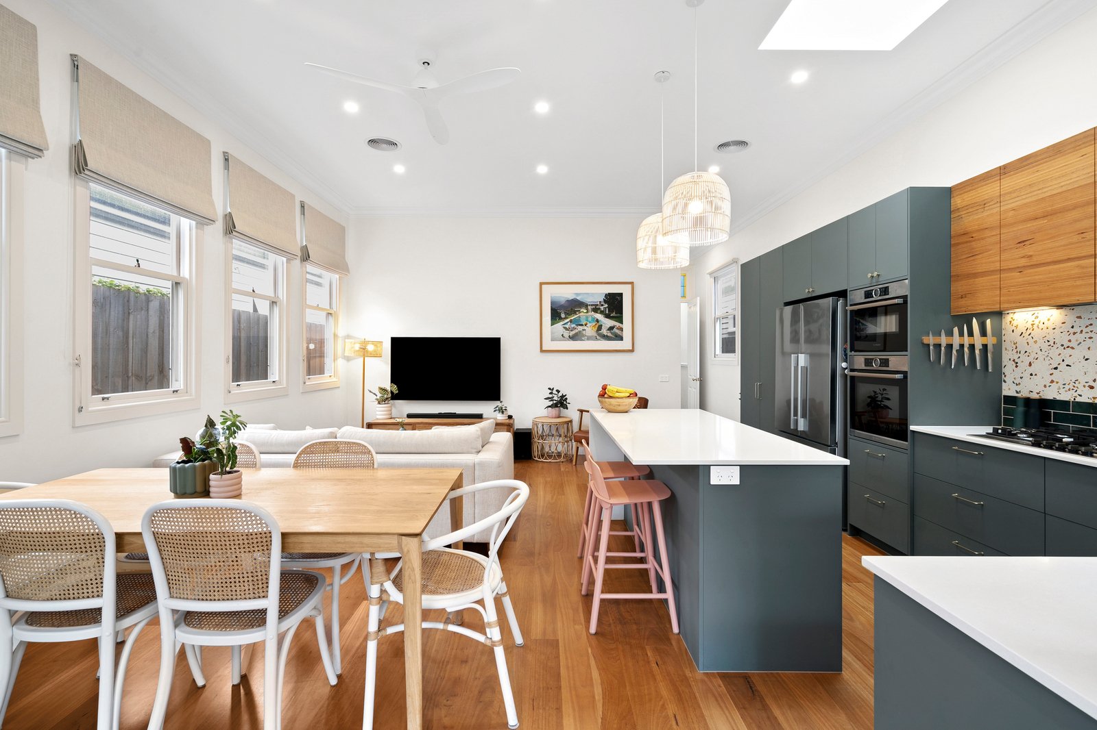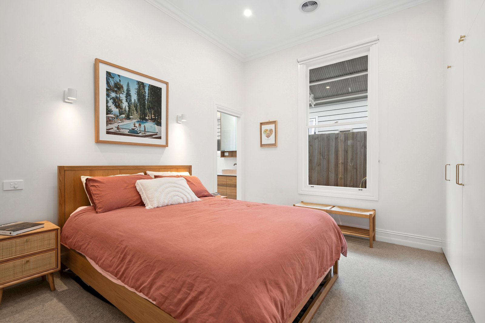 This light-filled three-bedroom home boasts soaring three-metre ceilings, strategically placed skylights, and stylish pops of colour that create an inviting, vibrant atmosphere. Each of the three bedrooms is designed with comfort in mind, offering ceiling fans, built-in robes, and ample storage. The first bedroom features an original fireplace, adding to the home’s welcoming character, while the master suite enjoys the convenience of a spacious ensuite.
