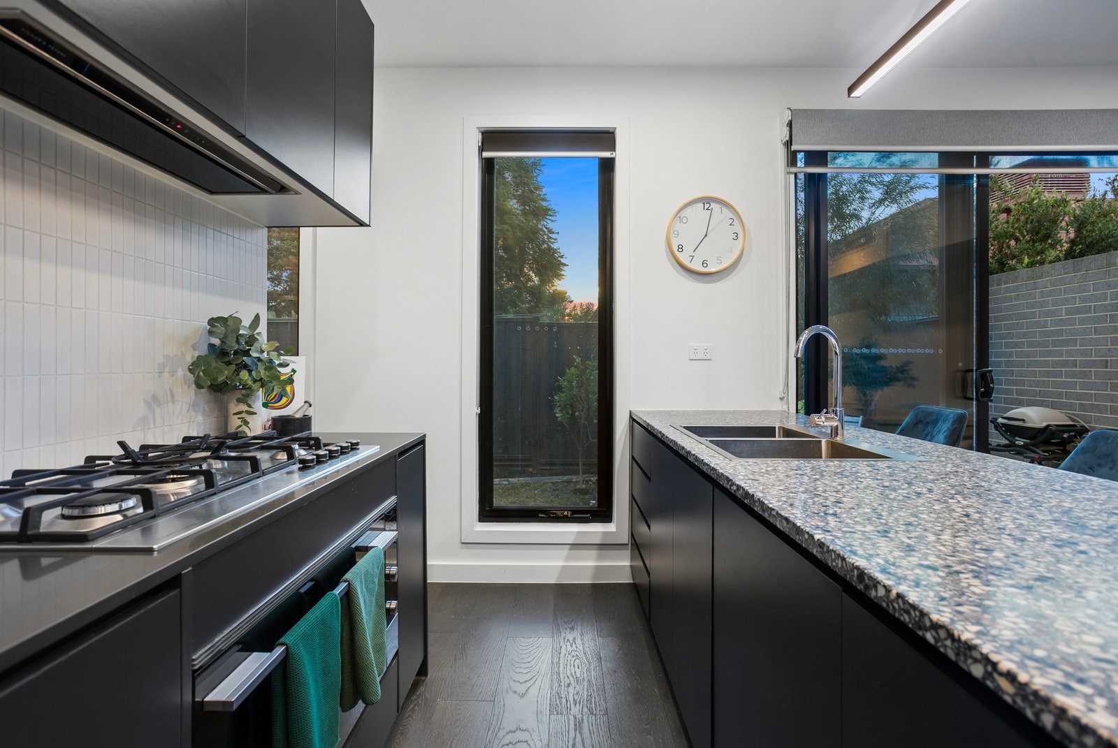 Only six years young and finished to an exceptional standard, the home immediately impresses with its thoughtful design and premium inclusions throughout. The ground floor unfolds into a light-filled open-plan living and dining domain, seamlessly connecting to a private paved entertaining area - ideal for relaxed weekends or hosting with ease. At the heart of the home, a striking kitchen showcases terrazzo stone surfaces, a generous breakfast bar, walk-in pantry and quality appliances including a Fisher & Paykel gas cooktop and pyrolytic oven, alongside a Bosch Series 5 integrated dishwasher. A full laundry, powder room and secure garage with internal access further enhance everyday functionality.